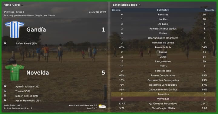 Bruno Trink Postado 5 de Abril 2010 Autor Denunciar Postado 5 de Abril 2010 Caramba. É lotada essa divisão aí, hein?! Ainda tá escrito que são apenas 18 que sobem... :heh: As mudanças deram certo mesmo. Melhor defesa e ataque disparado. Seu time é um grande favorito a ser promovido. São 18 grupos, mais de 360 times na Tercera. Os quatro primeiros de cada grupo vão para o playoff. Por isso que eu falei que "só" 18 sobem. :) No ataque eu confiava, estou surpreso com a defesa. Os zagueiros são bons, mas o goleirinho é bem fraco. Em time que tá ganhando, a mudança faz muot bem. A sequência permaneceu incrível como antes e o título era questão de tempo. Agora é trabalhar pra repetir o feito. Antes tem que subir, o título não garante nada. Tem que dar sorte por que o emparceiramento é por sorteio. Youssef dando conta do recado por substituir o artilheiro, 32 jogos sem perder, Gathii fazendo história no Novelda! :] O Youssef ainda deve melhorar muito na próxima temporada, é garoto ainda. Citar
