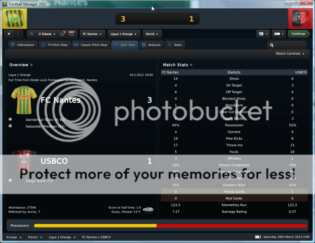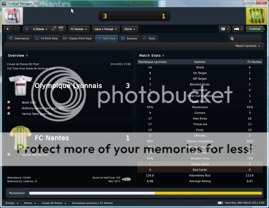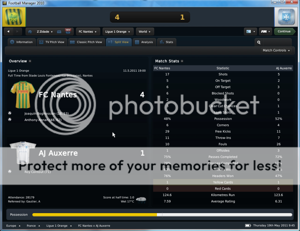 Seo Beraldo Postado 1 de Junho 2010 Denunciar Postado 1 de Junho 2010 O time continua bem e a vaga na UCL tá muito perto. Apesar de alguns resultados ruins no post passado contra Toulouse e Rennes, que são times bem chatos pra mim no FM, nesse post agora o time deu uma boa melhorada. Na Copa da França, mais uma vez tinha o Lyon no caminho. Esse time eu odeio! <_< Estamos fazendo um otimo campeonato, mostramos nossas garras e agora com o tempo podemos deixar o time cada vez mais forte! Rrsrs, morte a Les Gones Droga perdeu no confronto direto, mais ainda dá na UCL, ou melhor já tá dando. Valeu ai pelas instruções ao Boghossian, vou tentar algumas variações táticas no meu time também, o duro é encaixar uma boa, mais de começo, to conseguindo isso. Eh, o cofronto direto atrapalhou a gente. Mas ainda estamos no lucro! depois quero ver seus resultados com o grandao! fuck lyon! mas pra eles pode de qualquer maneira continua excelente na Ligue 1 e parece que atingiu já um objetivo muito grande pra um novato na primeira, a UCL aham, parece que vamos assegurar nossa ida a UCL! isso promete entrada de grandes volumes de dinheiro. pena que o patrocinador so sera renovado em 2013! Pois é, comi mosca na sua eliminação pelo Bordeaux. Bem, agora caiu diante do Lyon, mas nós sabíamos que seria complicado. A temporada tem sido excelente mesmo assim e com 12 pontos de vantagem para o 4º lugar, não vejo como o Nantes ficará de fora da UCL. Acho improvável. rss, tranquilo! Eh, o Lyon eh complicado, nao estava esperando muito. portanto nao foi dificil engolir a derrota e agora tambem ja digo que confiante de que seguramos o lugar na UCL! ufa! otima primeira temporada de volta a L1