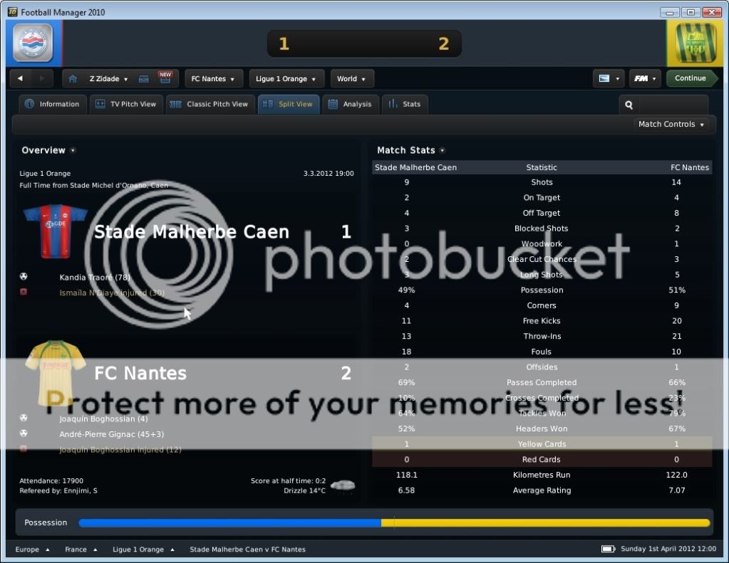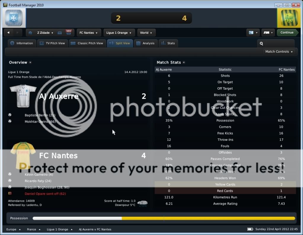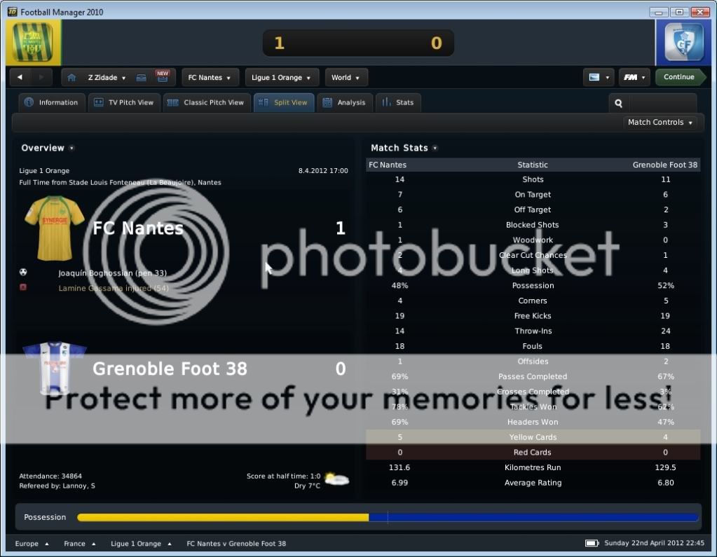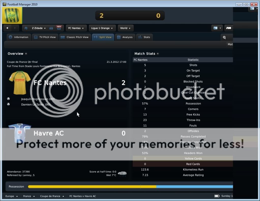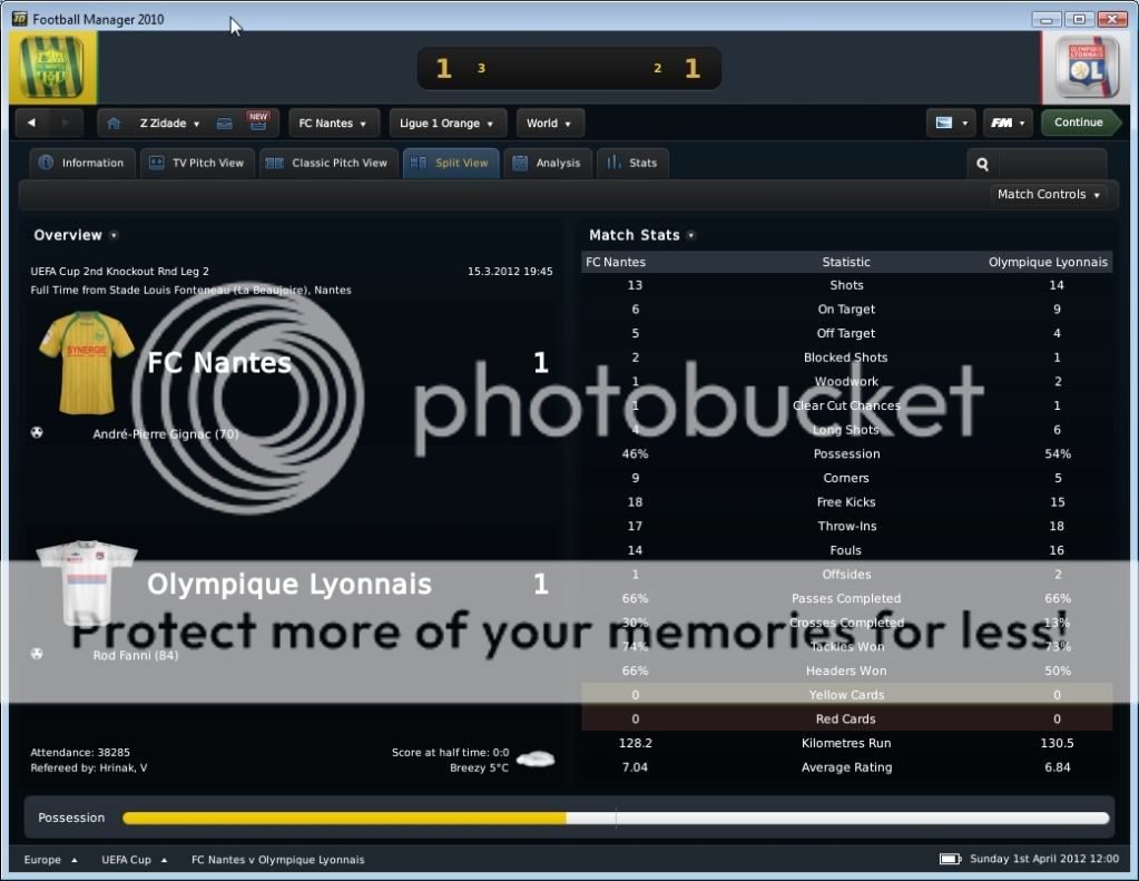 Seo Beraldo Postado 18 de Junho 2010 Denunciar Postado 18 de Junho 2010 ------------------------------------------------------------------------------------------ Nantes, 15 de Abril de 2012 Em busca do titulo, que pode chegar antecipado, buscamos atacar desde o inicio, e ao “Jeu à la Nantaiese” obtivemos o nosso gol logo aos três minutos com Annan armando a jogada e Boghossian com frieza marcar. Ah, vale colocar que agora Bogholles não chuta mais com violência, e sim coloca a bola no canto do gol, algo que esta influenciando na hora de finalizar. Bogholles fechou o placar ainda no primeiro tempo ao acreditar em uma bola recuada para um defensor, roubou a bola e a queima roupa marcou. Na seqüência, fomos a Espanha para decidir nossa permanência na Europa League empatando com o Sporting Gijon. Estava decidido a poupar meus jogadores, não mandando um time reserva, e sim jogando atrás, controlando a posse de bola, e organizando poucos mais eficientes ataques. Infelizmente em uma jogada de escanteio, os espanhóis saíram na frente. Mas nossa resposta foi imediata, tão logo reiniciamos a partida, Kakuta correu pelo flanco esquerdo com a bola e cruzou na medida para Andre-Pierre Gignac. E assim foi até o final da partida, e vamos a quarta de final. Mas agora é pedreira, temos o Liverpool pela frente! O Milan deu adeus a competição ao perder para o HSV, mostrando que os alemães estão fortes! E o Sunderland, quase surpreendeu o Man City. Resultados Finais na Quarta de Final da Europa League Jogando contra o Grenoble, sofremos com uma boa marcação em nossa intermediaria, e isso dificultou nossa organização de jogo. Matic não tinha tempo para conseguir iniciar jogadas, pois sempre havia um jogador em sua marcação, e o apertando. Dei maior liberdade para meus alas, pois assim puxaria dois marcadores conforme a gente fosse subindo com a bola, e assim foi. Gassama e Bastos cansaram de entrar na área, ou chegar na linha de fundo, mas nada de gols! O gol saiu de pênalti, quando Gassama fora derrubado. Quando Bogholles cobrou, senti um frio na barriga, quando o goleiro acertou o canto. Mas a bola foi forte, e o gol saiu! Estamos a quatro pontos do titulo! Valendo pela semi final da Coupe de France, carimbamos a nossa presença em mais uma final de taça francesa. Começamos forte, e aos dois minutos Candreva deixou Boghossian na cara do gol, e o uruguaio botou a bola no fundo das redes. No segundo tempo, em um lance onde nossa defesa parou, mas Lukovic na esquerda dava condições, Thomas subiu sozinho para cabecear e empatar a partida. Bom, com o empate, queria evitar a prorrogação e apelei pra o jogo aéreo de Boghossian. E conseguimos o que queria, a vitoria. Em um cruzamento da direita, Bogholles subiu mais alto, e marcou o gol da vitória. Do outro lado, o Paris SG venceu o Toulouse, e nos enfrentara na final da Copa Francesa. Força Nantes! Começamos dançando leve contra o Auxerre, e logo aos quatro minutos Gameiro abriu o placar chutando cruzado. Ficamos muito alegres quando vimos no placar eletrônico que o OM estava a perder por 1x0 do PSG, e isso nos dava o titulo com esta vitoria parcial em cima do Auxerre. Mas este titulo antecipado se passou quando quando Bertin empatou a partida nas costas de Lukovic. Nossa resposta, pra variar, foi imediata, e Faty apareceu na área para marcar seu primeiro gol pelo Nantes. Minutos depois, Boghossian de cabeça marcou nosso terceiro, mas ao mesmo instante o OM virou para cima do PSG, e nosso titulo antecipado foi adiantado! No segundo tempo, Opare foi expulso após dura entrada, e o Auxerre nos apertou, chegando ao segundo gol. Não querendo um empate, recuamos. Mesmo assim em um contra ataque, Boghossian se antecipou a um cruzamento baixo e marcou nosso quarto, e seu segundo na partida. Este gol também o colocou empatado com o turco do PSG na artilharia pela Ligue 1 com 18 gols. Ufa, por enquanto chega de Abril!, e olha que estamos na metade! No próximo post, o resto do mês, com os confrontos valendo a Europa League, e nossa chance de conquistar por antecedência o titulo da L1.