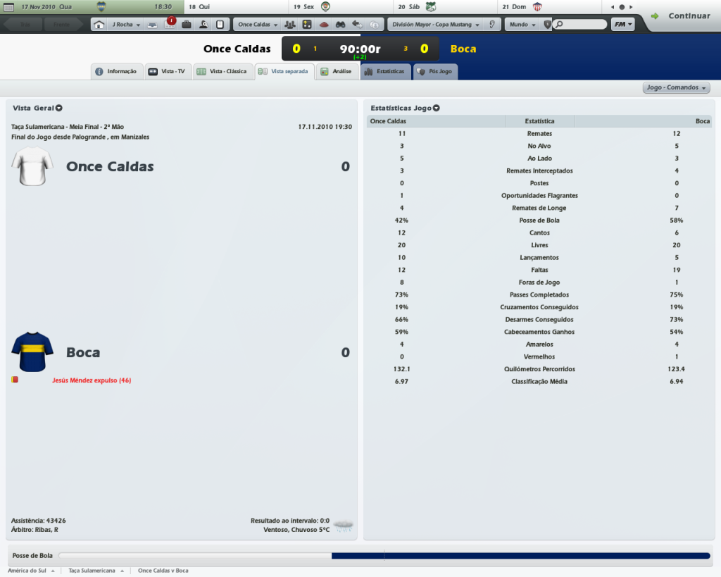 Jirimias Postado 31 de Maio 2010 Autor Denunciar Postado 31 de Maio 2010 BOCA EMPATA EM MANIZALES E ESTÁ NA FINAL O Boca Jr. acaba de empatar em 0x0 com o Once Caldas em Manizalese garante a classificação para a final da Sulamericana contra o Goiás(BRA) Por ter vencido a primeira partida por 3x1, o Boca Júnior poderia perder por um gol, e até por dois gols dependendo do placar final. A rivalidade entre as duas equipes tornou a partida bastante nervosa, terminando com uma expulsão e vários amarelos.O Boca viu Mendez ser expulso no primeiro minuto do segundo tempo, tornando o jogo ainda mais dramático.LEIA MAIS. Citar