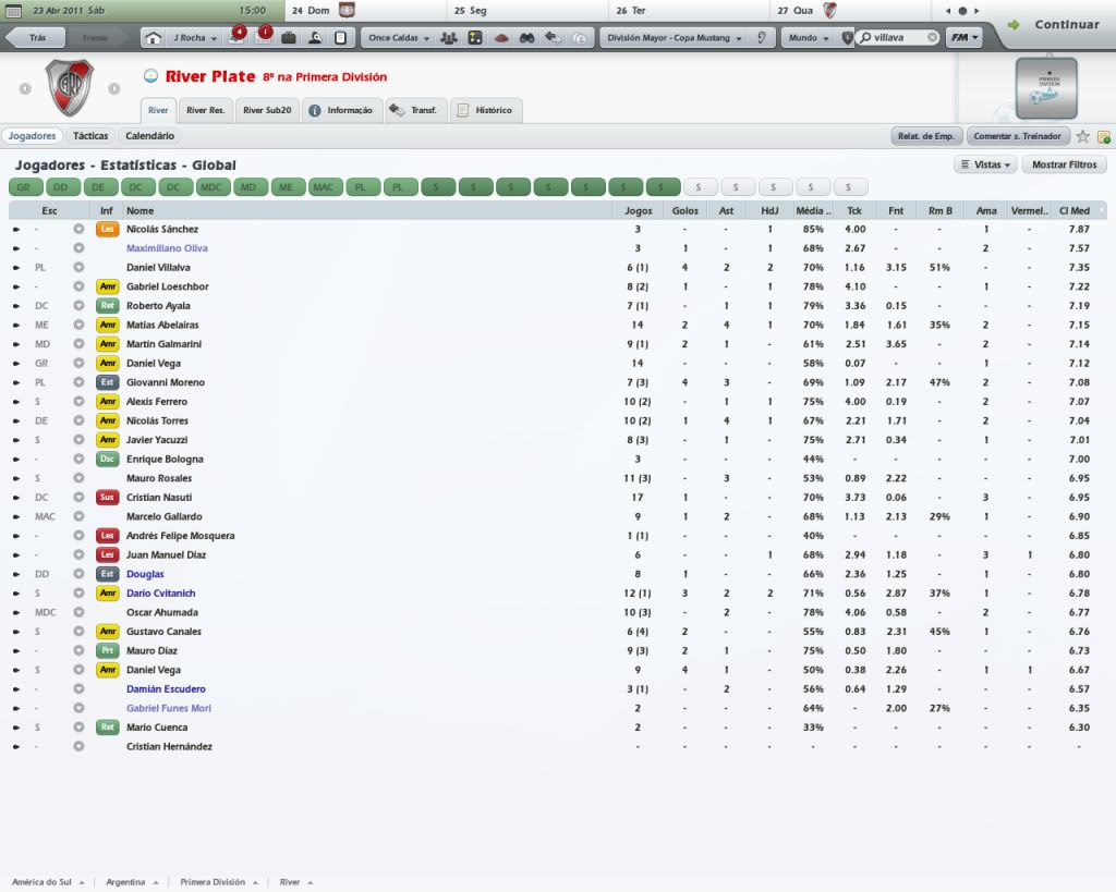 Jirimias Postado 4 de Junho 2010 Autor Denunciar Postado 4 de Junho 2010 Tá bem, muito bem! Bela vitória sobre o Necaxa. Vencer o Universidad e empatar com o Boca pra classificar. Deu tudo certo, só empatar com o Boca que não rola rsrs Se passar pelo River pega provavelmente o Boca mais uma vez. :heh: Sai azar!!! Nem me fala. :mellow: Muñoz é bom pra caramba na Colômbia. Joguei com ele naqueles desafios e sempre fazia seus gols, mesmo com essa idade toda. Outro excelente jogador é esse lateral aí que é bom pra toda América do Sul exceto pro Brasil que tem jogadores melhores. Dá pra passar pelo River. Acho eles mais fracos que o Boca, só tem cara velho no time! :lol: Ele se machucou, tava voltando machucou de novo, tá bem quebradiço pro meu gosto. É um ótimo lateral mesmo, e pelo que eu vi vc já teve experiência com ele rsrs. Meus velhinhos contra os velhinhos do River rsrs Perdeu pro Boca ali, mas rolou uma ajuda grande da arbitragem! :no: Força contra o River. Vai ser uma grande batalha. Meus jogadores não podem esbarrar que vão expulso rsrs E põe batalha nisso. :specool: Classificou muito bem! E goleando o Necaxa... Muito bom! :yes: E agora.. River... Te cuida com o Villalva! :P Compras, no minimo, interessantes. González parece ser um bom jogador para substituir Vizcarrondo, mas tu cortou ele ? :thumbsdownsmileyanim: Munõz é aquele ? Ex-Palmeiras ? Também é jogador de Dan Filho ? E o Afonso ? Vendeu ele pro Godoy Cruz ? :no: O Gonzalez fez uma graça do caramba, coloquei ele para pegar forma no time B, mas ele nunca melhorava a condição física, aí cortei ele, além de tudo é reclamão pacas. O Muñoz não, do Dan só o Ada mesmo no Once Caldas.Afonso vai com Deus hsuhaushaushuahsua horrorível :heh: Ihh, é torcer para não ter o Boca no caminho ein. Pois é, um olho River e outro no Boca.De novo não, cara! Muñoz?? MUÑOZ?? M-U-Ñ-OZ??? Agora sim eu torço pra você ... Munoz e Iarley darão show !!! FÁCIL Não empolga,vai hsuahsuahus O Iarley e o Muñoz estrategicamente não jogarão contra o River, um ficará no banco o outro em casa cuidando dos netos. Citar