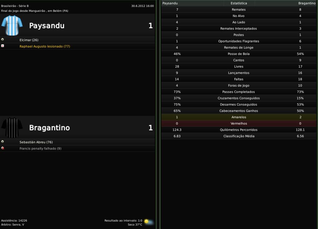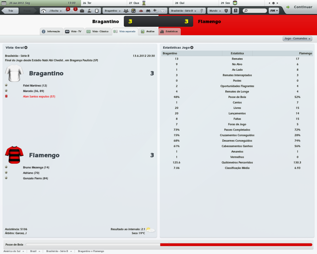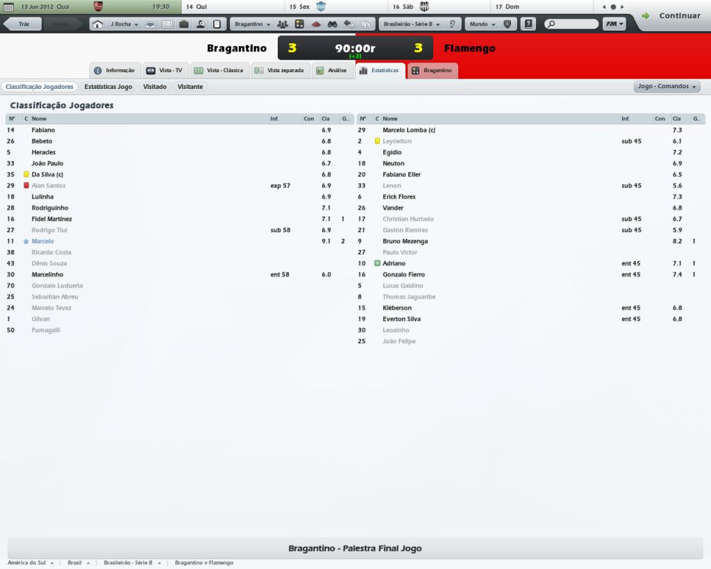Jirimias Postado 15 de Junho 2010 Autor Denunciar Postado 15 de Junho 2010 O coração bateu mais forte... Escalações Tinha curiosidade de saber como seria treinar uma equipe em partida contra o Flamengo.Este dia chegou, não como eu esperava enquanto torcedor do Flamengo, já que a equipe este ano luta para voltar à Série A.Enquanto treinador do Bragantino, vencer o Flamengo seria a chance de tirar pontos de um dos concorrentes à promoção. Antes da partida, fui cumprimentado por Mano Menezes que me desejou boa sorte, eu retribui.Era engraçado ver de tão perto jogadores que até o ano passado eu via pela TV, e mais estranho era torcer que as jogadas deles não funcionassem.Acho que passei no teste de profissionalismo, meu coração batia forte por uma vitória do Bragantino. Abrimos o marcador em uma bela tabela entre Marcelo e Martinez, gol do equatoriano.O empate veio logo em seguida com bom passe de Erick Flores para Bruno Mezenga, que não desperdiçou. Minutos depois voltamos a tomar a frente do placar, Marcelo foi quem marcou.Com 2x1 no placar saímos para o intervalo. Tudo caminhava bem quando Alan Santos, que substituia Francis suspenso por cartão vermelho levou segundo amarelo e foi expulso, aí o Flamengo não desperdiçou.Adriano, até entao sumido no jogo, empatou para o Mengão.Mais tarde Fierro virou o placar, isso quando faltavam seis minutos para o final. Com apenas marcelo na frente, o empate parecia impossível.Foi quando Lulinha desarmou Adriano, que ficou caído reclamando dores, o juiz mandou prosseguir, a bola chegou para Da Silva que tocou para Martinez que lançou Marcelo para empatar a partida no final do jogo. Foi o nosso terceiro empate na competição, um bom resultado pelas circustâncias da partida.O resultado não nos tirou da liderança da Série B.Mais uma vez líderes, mas o que importa é ter fôlego até o fim. Classificação geral Últimos jogos Estatísticas individuais da Série B Desempenho dos jogadores Citar