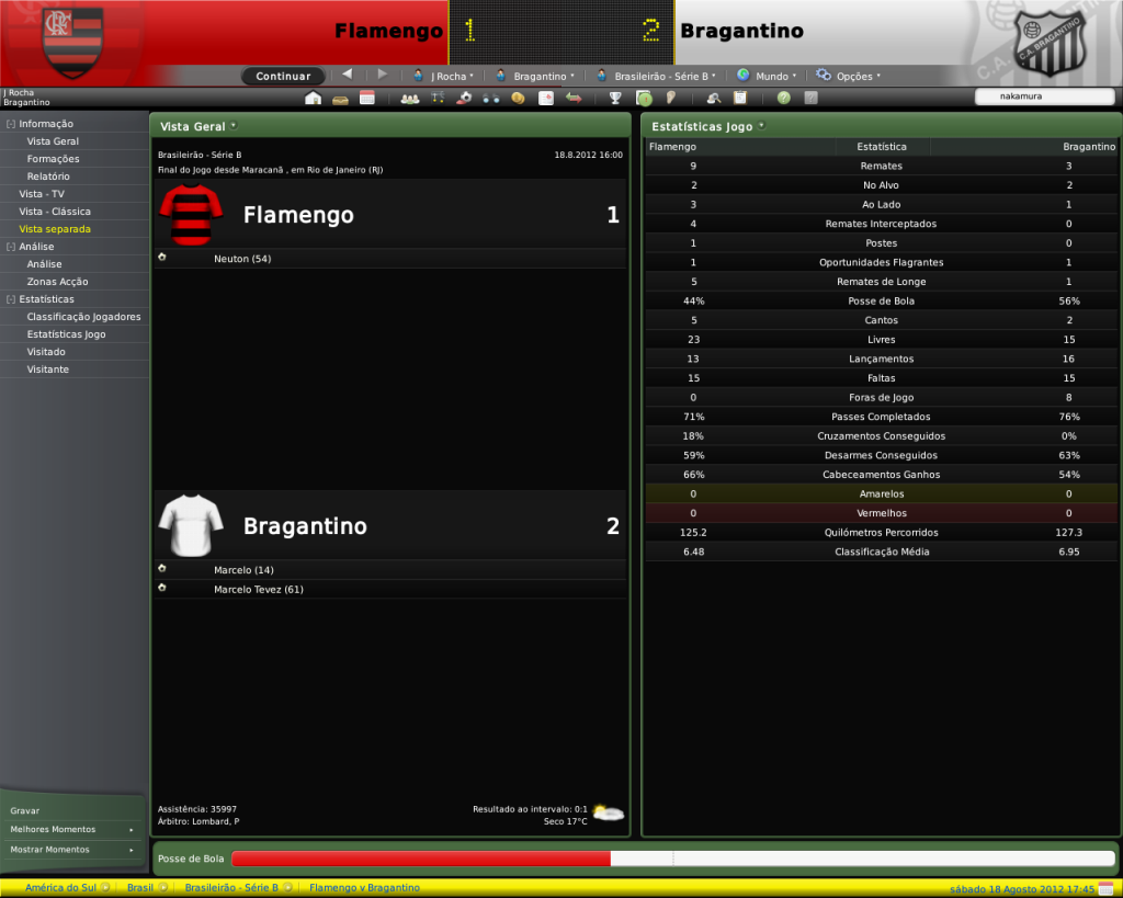 Jirimias Postado 19 de Junho 2010 Autor Denunciar Postado 19 de Junho 2010 Flamengo e Bragantino voltaram a travar uma batalha em campo.No último jogo entre as equipes a partida terminou empatada e com um jogador expulso pelo lado alvinegro.Diante do equilíbrio da partida, o empate parecia ser o resultaco mais certo. O Flamengo foi quem primeiro levou perigo, com o cabeceio de Adriano sobre a trave.O Flamengo apertava, mas o Bragantino sabia utilizar-se bem do contra-ataque:Marcelinho driblou no meio-campo, tocou para Rodriguinho que passou em profundida para Marcelo que chutou na saída do xará do Flamengo. O Rubro-Negro foi para cima para buscar o empate, e quase marcou logo após o gol sofrido:Leyrielton cruza da direita e Adriano cabeceia e acerta a trave.A partir daí, o jogo esfriou e o Bragantino levava a vantagem de 1x0 para o segundo tempo. O segundo tempo começou, o Bragantino veio disposto a defender e utilizar-se dos contra-ataques, o Flamengo pressionava e principalmente utilizava as jogadas aéreas.Depois de um cruzamento cortado pela zaga,Kleberson cobrou escanteio para entrada da área ( bug do escanteio), Vander chutou, a zaga rebateu e Neuton fez o gol debaixo da trave. Quando se esperava pela virada do Flamengo, o Bragantino volta a deixar o Maracanã em silêncio.Tevez recebe de Marcelo no meio-campo, abaixou a cabeça e foi até o gol, e chutou cruzado, dandos números finais ao jogo. A vitória do Bragantino colocou a equipe do treinador Jean Rocha na liderança, enquanto o Flamengo saiu do G-4.As duas equipes agora se preparam para a estréia no Torneio Rio-São Paulo. Citar