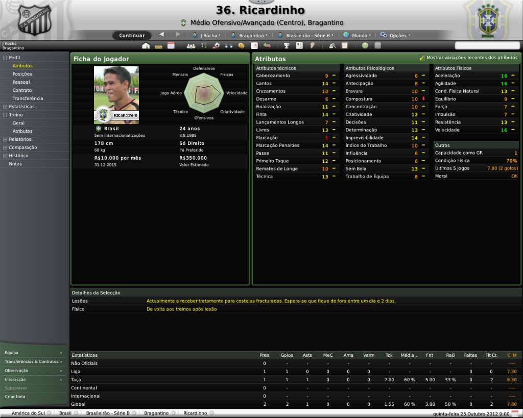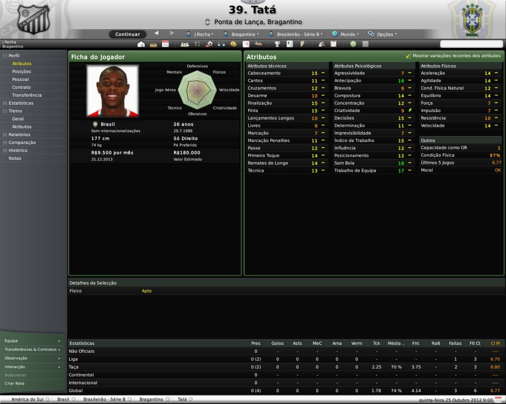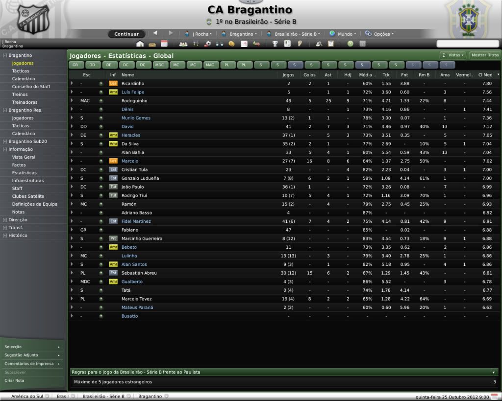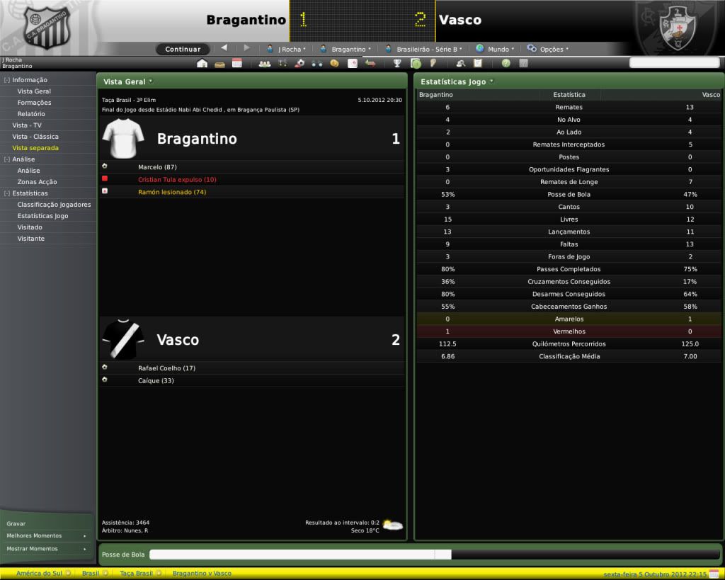 Jirimias Postado 19 de Junho 2010 Autor Denunciar Postado 19 de Junho 2010 Ta bem, sabemos da limitação do elenco. Briga boa pelo G4 e na CdB a vaga tá pertinho, só não se aventurar em casa que tudo ocorrerá bem. E só uma coisa, porque tu deixou o FRANCIS bater penalti??? :heh: Vamos ter que trabalhar bastante para retornar ao topo, e brigar pelo G-4.Ah, não disputamos CdB não, somente ano que vem rsrs. Sobre o Francis, o que ocorre é que como eu revezei duas táticas, acabei esquecendo de configurar os batedores de penalidades de uma das táticas, e quando mudo de tática acaba ficando o Francis de batedor automático. Citar