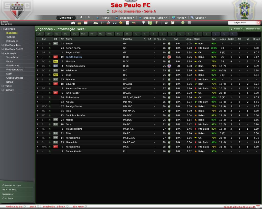 Jirimias Postado 27 de Junho 2010 Autor Denunciar Postado 27 de Junho 2010 A grande final Maior lotação dos últimos anos da história do Nabizão, que não caiu durante a partida como previa alguns "sábios do futebol".Tudo bem que boa parte dos corinthianos tiveram que ficar vendo o jogo no Centro de Bragança, já que foram vendidos apenas 5.000 ingressos para eles. O jogo em si foi tudo aquilo que se esperava: mais nervosismo e raça do que bom futebol.Para este jogo tínhamos um desfalque importante: Rodriguinho que cumpria suspensão.Quanto ao posicionamento dos jogadores, não foram feitas modificações, apenas a forma de distribuição da bola pelo goleiro,que passou a ser direta para o Arthuro, utilizando da sua altura e força física.Para este jogo,Zacarias voltou ao time e fez dupla com Murilo Gomes, os mais altos do time, para dificultar o aproveitamento do escanteios por parte do Corinthians. Movidos pela torcida, os jogadores conseguiam fazer uma partida equilibrada contra uma equipe mais forte.Os jogadores tiveram que ser pacientes, pois o Corinthians entrou em campo com uma postura defensiva, talvez pensando no regulamento , o que acabou me surpreendendo.Mas com muita paciência, a hora do gol chegou: Edno abriu o marcador no final do primeiro tempo, uma jogada rápida pela esquerda. No segundo tempo, as ordens foram: desarme agressivo e posse de bola.Fiz algumas orientações para determinados jogadores do adversário, a intenção era conseguir tirar algum jogador do Corinthians por expulsão. Ricardinho entrou com alguns minutos já jogados, ganhamos mais veloidade à frente, foi ele quem lançou Arthuro, que mostrou mais uma vez que é jogador de decisão também no chão.A torcida vibrava muito, e abafou os barulhentos torcedores corinthianos. Mas aí surgiu Defederico, o carrasco do Bragantino nas finais roubou a bola de Zacarias que tentou sair jogando e diminuiu, o gol levou a partida para a prorrogação.E Zacarias foi mais uma vez lembrado pela torcida.A mesma torcida que derrubou Francis, estava disposta a tirar o trapalhão do time. Alheio a este problema, voltamos para a prorrogação.Primeiro tempo sem gols, todo mundo cansado e poucas chances criadas.Troquei Edno por André Dias e Martinez substituiu Kleberson, além de estarem cansados, os dois jogadores que entraram são melhores cobradores de penalidades. Arthuro colocou o Bragantino na frente novamente, mas a festa demorou pouco, Anderson Martins subiu por trás de Murilo e cabeceou no segundo poste para empatar.A partida chegava então às terríveis penalidades. Vinte e oito penalidades depois, tínhamos o campeão.Ricardinho cobrou a última penalidade no canto direito de Felipe e o goleiro não conseguiu alcançar.Elias, que há um tempo é o reserva do alvinegro, cobrou para a defesa de Márcio, que se consagrou perante à torcida. Bragantino é Bicampeão Paulista.E agora acho que já posso pedir para tirarem o poster do Luxa lá da parede da sede.Os dois feitos de Luxa no Bragantino foram alcançados: o Campeonato Paulista e a Série B.Já repetir o vice-campeonato Brasileiro do Bragantino com Parreira em 1991 era algo mais complicado, mas algo me dizia que em breve a pressão quanto ao repeteco de 91 surgiria. Citar