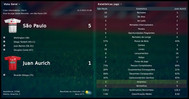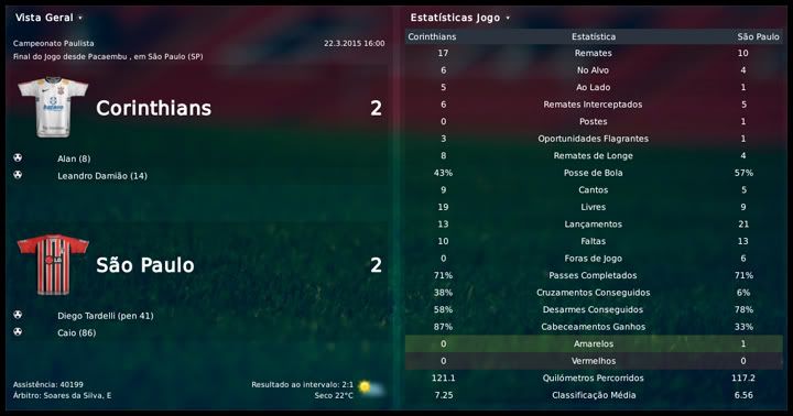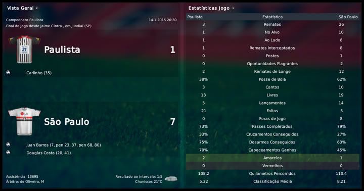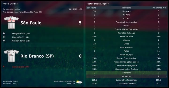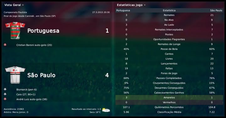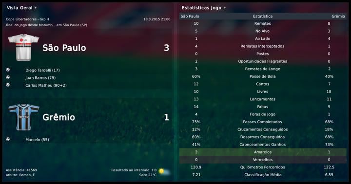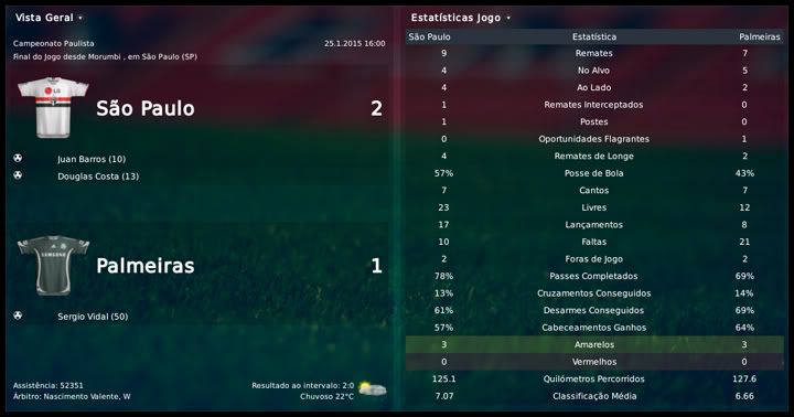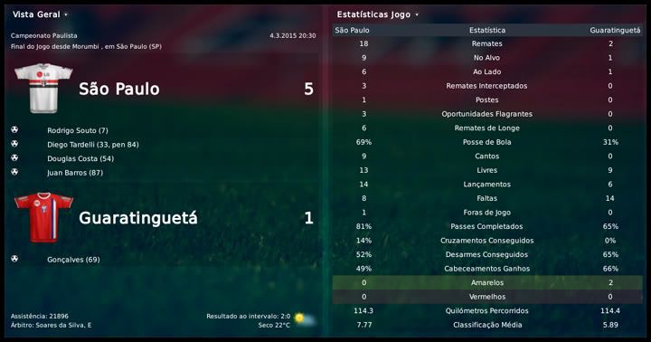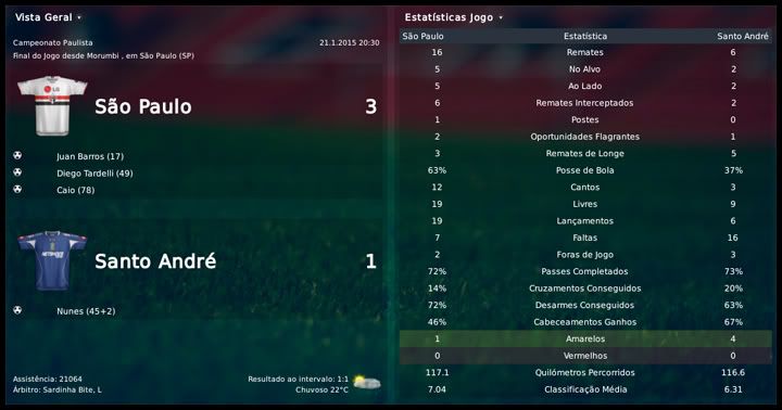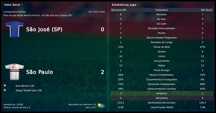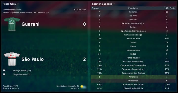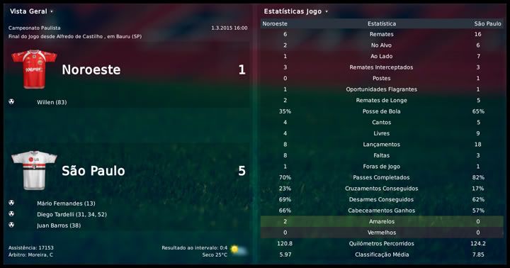 Bruno Trink Postado 20 de Setembro 2010 Autor Denunciar Postado 20 de Setembro 2010 Estava com dificuldades para atualizar a história, mas não para jogar. Então, acabei indo direto até o final da fase de grupos do Paulistão. Com uma dupla de ataque como Barros e Tardelli, não dava para esperar menos do que um caminhão de gols. Achei que, talvez, os dois fossem demorar alguns jogos para se entrosar, mas parece que nasceram um para o outro. Os dois se completaram perfeitamente e, excetuando algumas partidas em que poupei titulares, um ou outro marcou em praticamente todos os jogos em que a dupla atuou. A média de um gol por jogo para cada um deles é assombrosa. Assim, o que vimos foi uma equipe voltada para o ataque e que marcou 69 gols nos 23 jogos oficiais, entre Paulista e Libertadores. A defesa já não é mais aquela mesma fortaleza, dá para relevar que amoleçam quando o ataque resolve na frente. Paulista Paulista | São José | Santo André | Palmeiras | Ponte Preta Barueri | Botafogo | Rio Branco | Ituano | Sertãozinho Noroeste | Guaratinguetá | Guarani | São Caetano | Corinthians Mogi Mirim | Portuguesa | América | Santos Ainda sem o Tardelli, Barros resolveu decidir sozinho na estreia e marcou cinco vezes. Daí em diante, a dupla desandou a marcar e o time passou a enfileirar os adversários. Vencemos dezoito deles, vários por goleada, e só paramos no Corinthians, um empate, quando já estávamos praticamente classificados e com o primeiro lugar garantido. Pelo segundo ano consecutivo, os quatro grandes passaram para a fase final. Dessa vez, reeditaremos a final do ano passado já na fase semifinal, já que o Santos caiu para a 4ª posição na última rodada, ao perder para nós. Libertadores Aurora | Juan Aurich | Grêmio | Grêmio Caímos em um grupo onde, teoricamente, o Grêmio seria o nosso principal adversário. Nem isso aconteceu. Ganhamos bem de bolivianos e peruanos e derrotamos os gaúchos duas vezes, tanto no Morumbi quanto no Olímpico. Com isso, conseguimos a classificação antecipada para a próxima fase e poderei poupar muita gente, pelo menos na semifinal do Paulista. Além, claro, da dupla de ataque, as demais duplas do time estão muito bem. Acertamos mesmo a zaga com o Matheu e o Mário Fernandes, os dois laterais continuam muito consistentes, assim como a dupla de proteção Renan - Rodrigo Souto. O elenco também ficou muito equilibrado. Tanto é que nem as lesões do Anderson Silva e do Diogo me preocupam tanto, já que o Bismarck e o Robertinho, respectivamente, entram no time sem que se sinta falta dos titulares. Citar