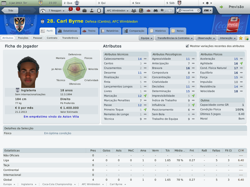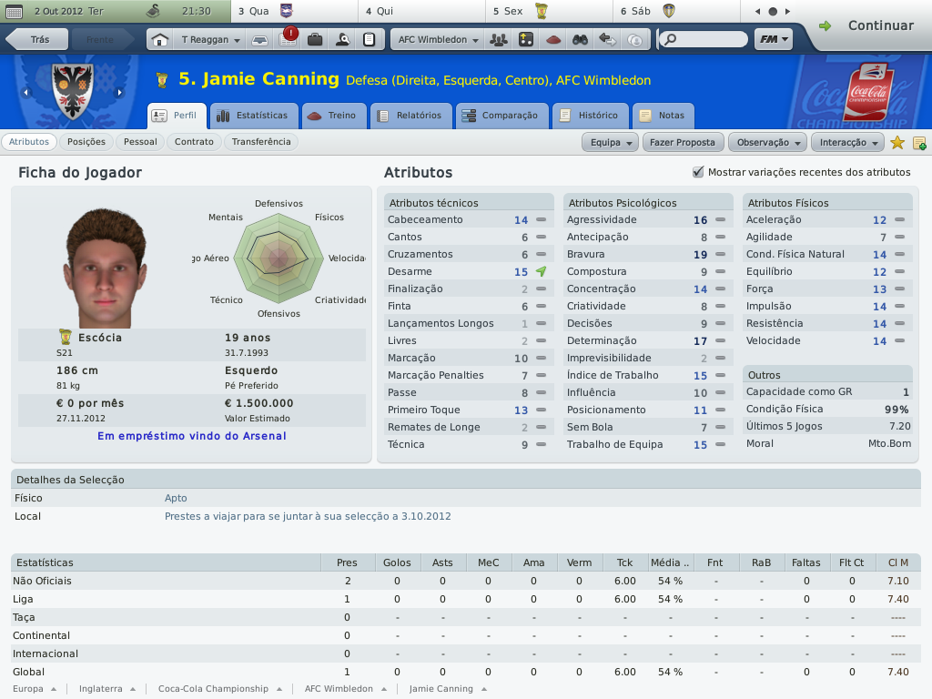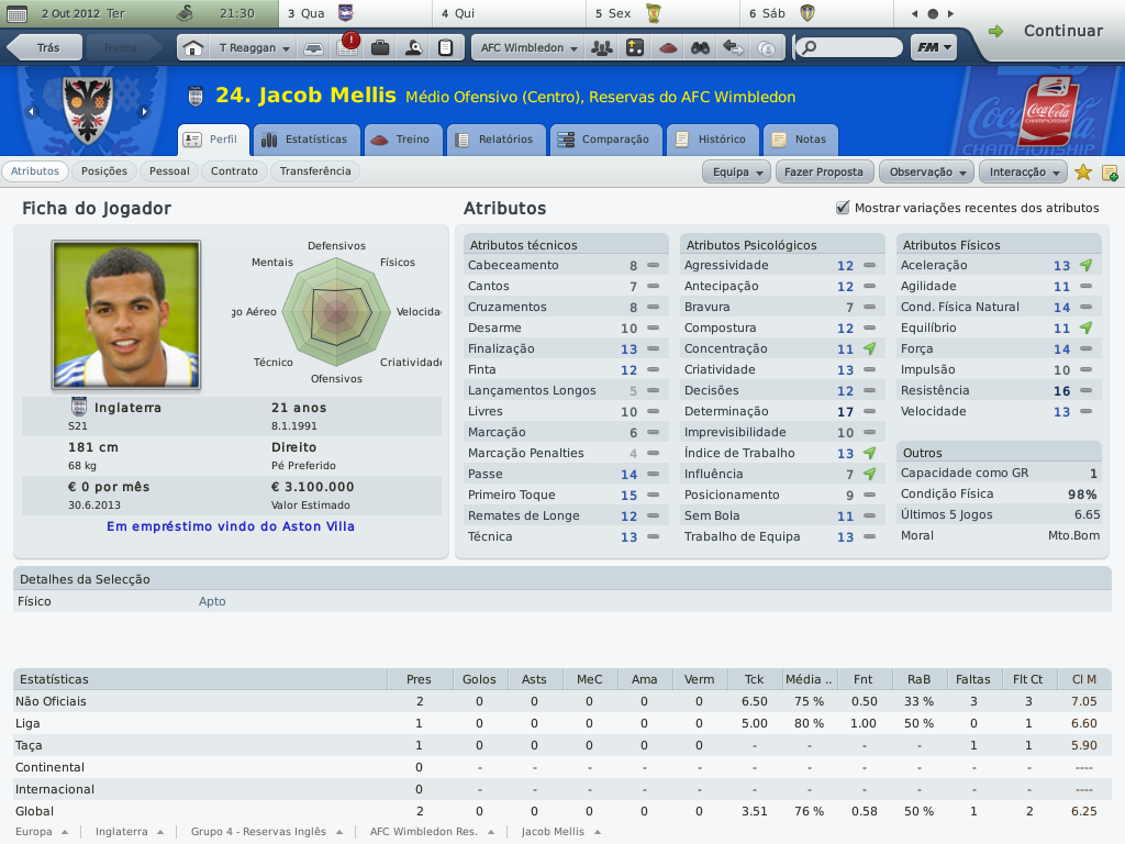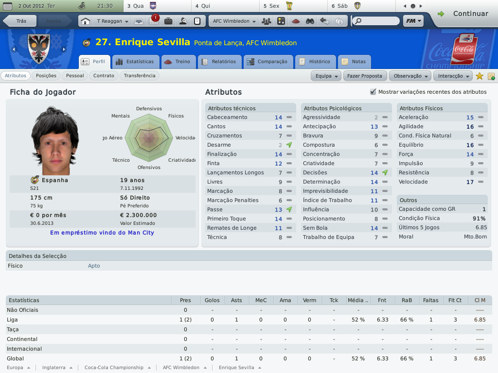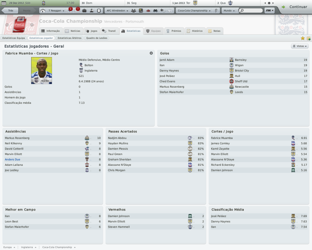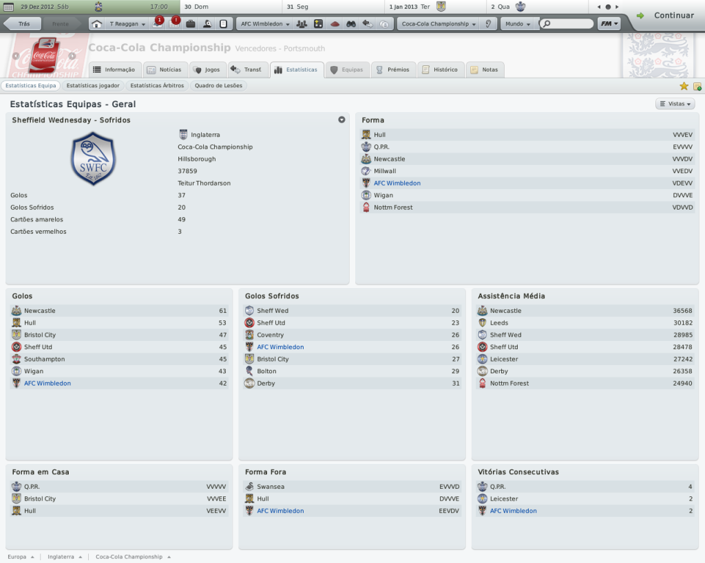 Jirimias Postado 1 de Outubro 2010 Denunciar Postado 1 de Outubro 2010 ATÉ AONDE PODEMOS IR? O primeiro trimestre. Championship: expectativa da diretoria: terminar na metade superior da tabela. O Wimbledon segue sua sina de contrariar todos os prognósticos de rebaixamento, nem mesmo a temível Championship resistiu aos encantos do pequeno time londrino. Não é uma campanha que busque os primeiros lugares da tabela (seria pretensioso demais pensar nisto), o nosso campeonato é ali: no meio da classificação, olhando para cima e não temendo voltar à League One.Somente cinco pontos nos separam do líder, e no momento ocupamos a oitava colocação da Coca-Cola Championship. A estréia e a saideira: dois momentos distintos. Pisamos na Championship com o pés esquerdo.De cara o Newcastle pela frente, derrota quase certa para o favorito ao título da "Segundona Inglesa".Não era um medo sem sentido, era a convicção de que do outro lado estava um adversário impossível de vencer.Mas saiba que este medo nos fez não notar que era possível sim vencer,porém o bom senso me lançou a velha e nem tão boa "tática das duas linhas de quatro", que me prometia mais sucesso com um time que também apostava no 4-4-2.A diferença é que o 4-4-2 deles, tinha Xisco e Markus Rosemberg, Kevin Nolan, Jonás ... Imagine então um 4-2-4 desesperado para tirar o zero no placar que se arrastava pelo segundo tempo.E com um tal de Marius Nicolae dando muito trabalho?Foi assim que o Newcastle fez o seu gol, gol de Xisco. Mas não há mal que perdure.Depois de quatro jogos sem vencer, não é que os rapazes do sudoeste de Londres não mostraram que não existe time no papel que coloque medo.Uma bela sequência de quatro jogos sem derrota, com direito à goleada sobre o badalado ( e líder) Wigan.Um time que vence o líder não pode ter vindo para lutar contra o rebaixamento. A confirmação da boa fase veio no quarto jogo da sequência vitoriosa: vitória sobre o Watford na casa deles.Tudo bem que o Watford é o penúltimo colocado, mas o Wimbledon não faz acepção de adversário.Note que Nouble faz um hat-trick, é o segundo dele.Depois vou contar uma história triste sobre Nouble. E,tão é isso: Championship não morde, mas vamos com calma porque não queremos (será), e não podemos pensar em promoção com a casa tão desarrumada. CARLING CUP. Eu também não queria... Acabei esquecendo de tirar um “print” do jogo contra o Bolton.Esta eliminação não custou somente a continuidade na competição, mas também serviu para deixar o time pior do que estava.O Bolton estava naquele momento, um pouco acima de nós na Championship, mas neste jogo parecia ser um time do primeiro escalão inglês. Depois desta eliminação, fiz de tudo para desvalorizar a importância da Carling para as nossas vidas, mas ainda assim demorou para o grupo digerir esta eliminação. Carling Cup: expectativa da diretoria: chegar à segunda eliminatória (ok). NOUBLE E OUTRAS COISAS MAIS. O movimentado Wimbledon. Minha pressa em jogar, causada pelo pouco tempo disponível, já me fez arrepender de muita coisa que fiz neste save.Não dá para lembrar de todas não, mas dá para citar o caso do Subotic, que temporadas atrás não consegui contratar por mais de três meses.Se bem que o Subotic "sumiu" alguns jogos depois da partida em que só não fez chover. Pois é, não é que consegui repetir o "feito"?Tive meu outro momento bobeira quando acertei com Nouble só por três meses, pensando em não detonar o limite de empréstimos longos com um jogador qualquer.Só que Nouble não era um qualquer; Nouble é o artilheiro da equipe, que deixaria o clube no começo de Novembro. Contudo, todavia, no entanto...o West Ham não gosta do rapaz, e ele continuava na reserva, listado a custo zero.E diferentemente daquela oportunidade em que o contratamos por empréstimo, agora Nouble pensava em deixar o seu clube.Esta era a oportunidade, e sem gastar nada na transferência, mas comprometendo €28m mensais, Nouble passa a ser jogador do Wimbledon a parti de janeiro de 2013.Até lá, vamos de Rasiak e o menino Enrique Sevilla , que chegou recentemente por empréstimo até o fim da temporada. Neste post não vou comentar as estatísticas individuais, quero deixar para fazer isto no segundo semestre onde terei nas mãos o time definitivo e com números mais esclarecedores.Por hora, deixo os números dos melhores. Notas rápidas: últimos reforços por empréstimo: Enrique Sevilla, Jacob Mellis (1 ano), John Bostock (até dezembro) e Jamie Canning (até novembro). a comissão técnica agora possui dez membros no time principal,lembrando que os contratos são feitos através de anúncios.