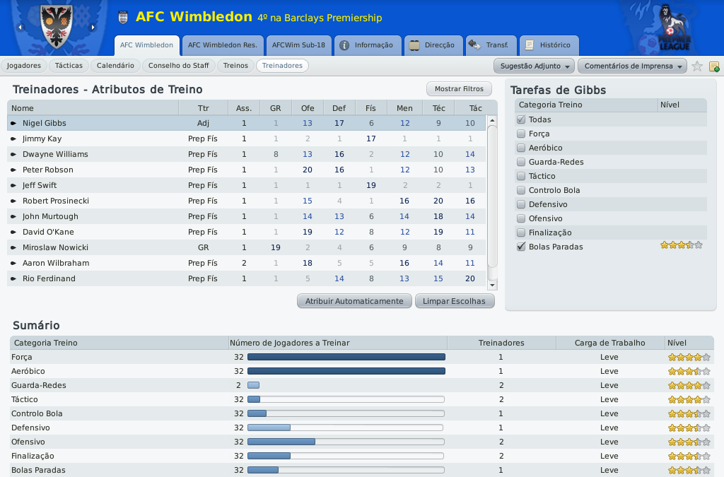 Jirimias Postado 13 de Outubro 2010 Denunciar Postado 13 de Outubro 2010 O time dos empates. Se eu me ligasse muito em retrospecto, eu poderia dizer que esta temporada tem tudo para ser a grande temporada do Wimbledon na Premier.Isso porque nas temporadas anteriores, quando os empates eram bem comuns, o Wimbledon sempre terminava entre os primeiros.Mas isto são só coincidências, estamos na elite do futebol inglês, onde as coincidências não valem vaga para a Europa. De qualquer forma, começamos a fazer aquilo que fizemos nas primeiras temporadas do save: surprender e superar expectativas. Na Premier League, estamos invictos: três vitórias e quatro empates. No último jogo do trimestre (Julho,Agosto e Setembro), tivemos a mema possibilidade de vencer ou sair derrotado, daí o empate ser o resultado mais justo.Hansen, o Rei das Penalidades, brilhou novamente.Ele que tem revezado com Schmeichel na titularidade, parece ter superado o truma da lesão que o tirou da disputa da Premier na temporada passada.No fim do jogo, o desperdício foi nosso: quando o segundo tempo chegava ao seu quinto minuto de acréscimo, Matty Taylor cobra a penalidade na trave e mantém o placar inalterado. A 4º posição do Wimbledon é virtual, uma vez que várias equipes tem menos jogos que os Dons, inclusive o Aston Villa que está abaixo da metade da tabela e o Chelsea, ambos com apenas quatro jogos pela Liga.Podemos cair para a 7º posição, uma colocação boa, já que alguns jogadores apresentam dificuldades de entrosamento, e assim o time não joga aquilo que poderia estar jogando. O bom desempenho inicial já foi notado pela imprensa, e surpreende. Como podem notar nas estatísticas, o time passa por formação, muitos são os jogadores que atuaram meio-tempo várias vezes, e talvez por isso não temos grandes destaques individuais.Ainda assim temos sete jogadores com média acima de 7.0, situação rara na temporada anterior. Mesmo sem grandes destaques individuais, já foi possível destacar alguns jogadores como peças importantes desta equipe.O ataque foi melhor com Lukaku e Eto'o, aliás o veterano vem mostrando que tem muito a jogar.No meio campo, Milijas e Cohen fazem um belo dueto no círculo central. Um jogador que não é novidade no Fan's Stadium figura entre os goleadores do Wimbledon, mesmo sem jogar como atacante: Nikola Saric repete as atuações que fizeram dele um jogador indispensável, independente da divisão.Saric marcou três gols e deu um passe para gol. Ainda espero mais de alguns jogadores, como por exemplo: Hasebe,Lampard,Livermore e Coloccini.Se estes jogadores jogarem o que sabem, o Wimbledon dará trabalho na Premier. Fiz algumas mudanças na comissão técnica para esta temporada:Nigel Gibbs é o novo adjunto.Windass teve seu contrato rescindido.Contratamos um olheiro brasileiro para observar o Pais do Futebol e contratei mais preparadores físicos.Jgadores recentemente aposentados contratados para comissão técnica: Wilbrahan e Jovanovic ( ex-Wimbledon ), Rios Ferdinand e Carlos Edwards.