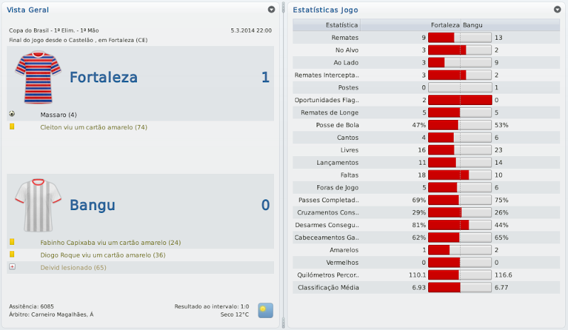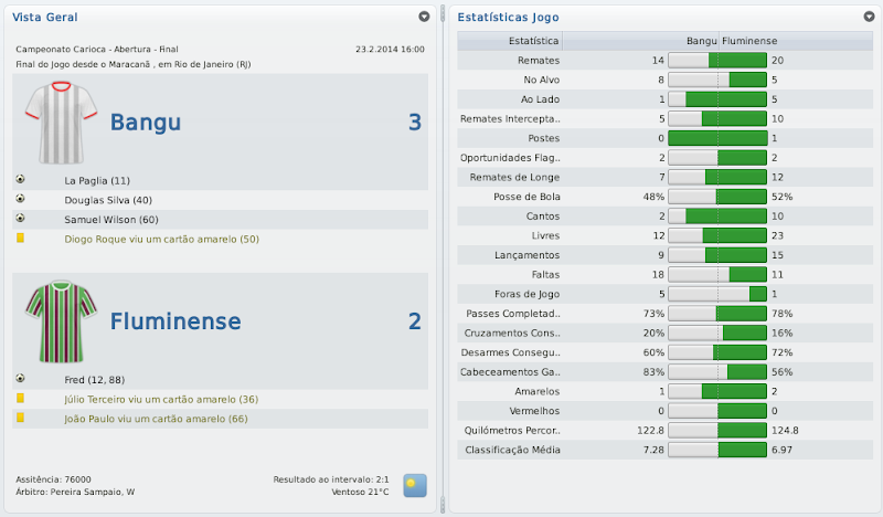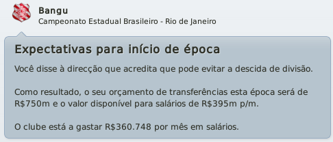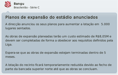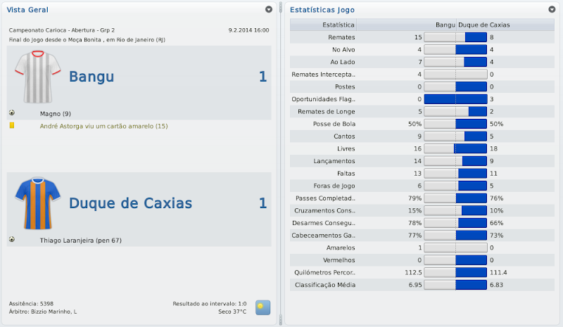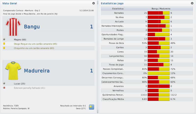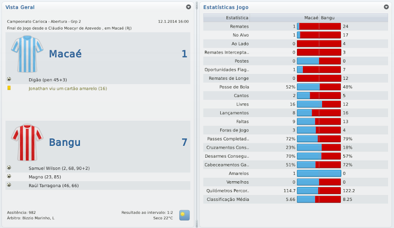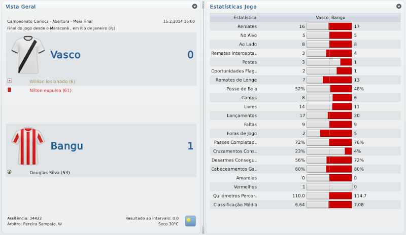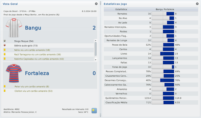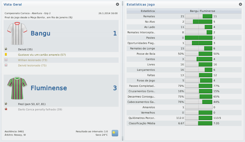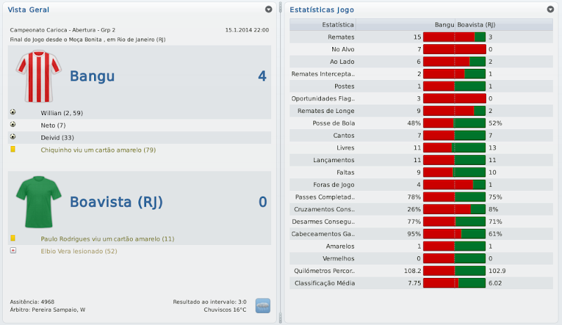 mfeitosa Postado 24 de Novembro 2010 Autor Denunciar Postado 24 de Novembro 2010 Bangu retornando! Tô ansioso pelos próximos jogos, vamos ver se é só contra o Flamengo que tu se dá bem. E tomara que a arbitragem não atrapalhe... É isso aí, Bernardo! Espero que este seja o ano do Bangu no Carioca! :thumbsup: Eu lembro-me desse Deivid quando estava no Sporting. Era ruim, quando começou a marcar golos o Sporting vendeu. :heh: Bela vitória sobre o Flamengo, quem vence assim é capaz de vencer o Vasco. Força! Assim espero! E lembro mesmo que o Deivid não teve boa passagem pelo Sporting, mas ainda marcou alguns gols. Aqui ele está servindo bastante! :heh: A reformulação do Bangu já está dando frutos, prova disso é a boa campanha na Taça Guanabara. Seu ritmo frenético de postar me deixou perdido, por isso gostaria de lhe dar os parabéns pelo acesso e a forma exemplar de como está gerindo o Bangu. Boa sorte nas semis e tomara que chegue na final ao menos. Obrigado, Henrique! Realmente, estou postando de forma mais rápida do que o usual. Tentarei melhorar isto nas próximas histórias para que todos possam acompanhar tranquilamente. :thumbsup: Pessoal, baixei a demo do FM 2011 e não consigo jogar nem a série D nem com o Bangu. No jogo completo vem a série D? Como faço para jogar com o Bangu? Abraços Silveirão Silveira, aqui não seria o local ideal para a sua pergunta, te responderei por MP. Citar