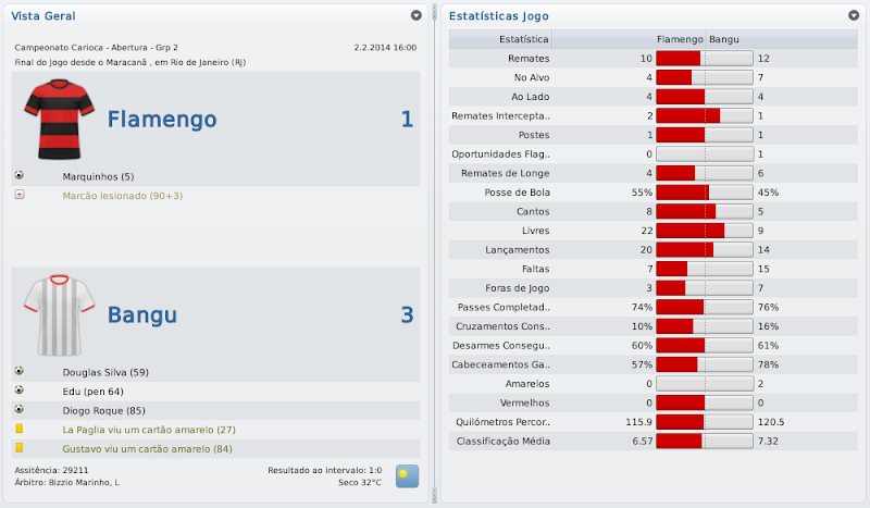 mfeitosa Postado 24 de Novembro 2010 Autor Denunciar Postado 24 de Novembro 2010 A partida contra o Vasco da Gama, pela Semi-Final da Taça Guanabara, foi digna de grandes clássicos do futebol brasileiro. Os times jogaram de forma bastante equilibrada e o jogo foi decidido por detalhes. O Vasco começou pressionando, principalmente criando oportunidades pelos flancos com Willian e Sánchez. O Bangu veio reagir apenas na segunda etapa, e logo aos 8 minutos, Douglas Silva acertou um belo chute de fora da área no ângulo direito do gol defendido por Fernando Prass. Minutos depois o zagueiro cruzmaltino Nílton foi expulso e o time de Marinho apenas administrou o resultado até o apito final, 1 a 0, garantindo a vaga do alvirrubro na final contra o Fluminense. Teve gosto de vingança aquela final de Taça Guanabara contra o Fluminense. Na primeira fase, o time de Marinho fora claramente prejudicado pela arbitragem em partida contra o tricolor paulista e não queria dar mais chances ao revés. O time entrou com uma formação bem ofensiva, com apenas um volante. A idéia era "fazer o placar" e depois "fechar a porteira". E deu certo! La Paglia tratou de abrir o marcador logo aos 11 minutos, em cobrança de falta. Um minuto depois, Fred empatou para o Fluminense, mas o Bangu conseguiu o segundo gol ainda antes do intervalo, com Douglas Silva, sempre ele, em excelente fase. Na segunda etapa, Samuel Wilson ampliou aos 15 minutos. A partir dali, Marinho fechou o time e o tricolor foi com tudo para cima do Bangu. Foram várias chances criadas pelo time das Laranjeiras, mas o máximo que conseguiram foi mais um gol, já no final da partida, 3 a 2. Finalmente a torcida poderia gritar: BANGU CAMPEÃO! Bangu campeão da Taça Guanabara! Depois de tantos anos de fila, o Bangu voltaria a disputar uma final de Campeonato Carioca. Só restava aguardar pelo desfecho da Taça Rio. O Bangu fez sua estréia na Copa do Brasil, depois de nove anos sem participar da competição, contra o Fortaleza. A primeira partida foi fora de casa, no Castelão. O time cearense, mesmo sem jogar melhor, conseguiu a vitória com um gol de Massaro, logo aos 4 minutos, 1 a 0. No jogo de volta, o Bangu levou a melhor, mas contou com a sorte para se classificar. Diogo Roque abriu o marcador aos 9 minutos da etapa complementar. O time estava claramente cansado e jogava de forma lenta, parecendo esperar pelas disputa de pênaltis. Porém, em lance esquisitíssimo, o zagueiro Stênio do Fortaleza fez gol contra, garantindo a classificação do Bangu, 2 a 0. Se foi preciso sorte para passar pelo Fortaleza, só ela não adiantaria contra o próximo adversário que o Bangu teria pela frente: o Coritiba, time tradicional que estava na Série A e era o líder do Campeonato Paranaense, à frente de Atlético e Paraná. Citar