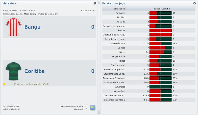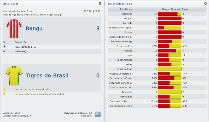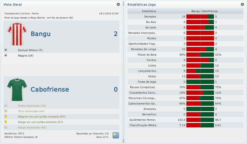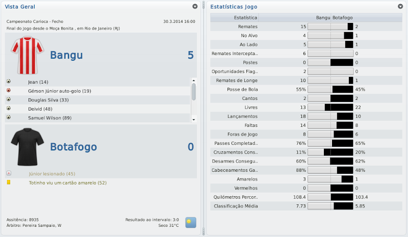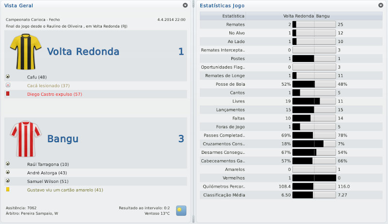 mfeitosa Postado 24 de Novembro 2010 Autor Denunciar Postado 24 de Novembro 2010 Que beleza! /miltonleite A foto do jogo ficou perfeita com o goleiro do Fluminese caido e os jogadores do Bangu comemorando! :lol: Bela conquista! E na CdB fez bem em ter passado pelo Fortaleza. Sei que sua vontade era tremenda! Sou metido a fotógrafo de partidas de FM! :heh: Não sei o que me deu mais alegria, ser campeão da Taça Guanabara ou vencer o Fossaleza! Brincadeira, não tem como comparar. O caminho para conquistar pelo menos este turno do Carioca foi bem longo! sensacional campanha na taça guanabara, parabens pelo titulo, achei que ainda nao seria a hora, mas o time se portou bem, quem sabe ganha o carioca hein? :P e na CdB passou por um time fácil com certa dificuldade e agora tem um time mais dificil ainda, veremos! Obrigado, Zimmer! Quem sabe não é desta vez? É possível! O Coritiba será um teste de fogo para este Bangu! :thumbsup: Parabéns pelo excelente título Marcelo! Quem diria hein... Vingança contra o Fluzão e grande vitória sobre o Vasco! Douglas Silva em excelente fase! E na CdB, passou com dificuldades pelo Fortaleza, agora é comer o Coxa! Sorte! Valeu, LC! Quem diria mesmo! Coloquei "Voltar a conquistar um Campeonato Carioca" nos meus objetivos do save, mas você simplesmente não acredita até conseguir chegar perto de concluir. É uma grande satisfação! Faltam poucos passos, quem sabe eu não termino de concluir o objetivo ainda nesta temporada? Agora, é pra cima do Coxa!! Reencontro histórico! Cara, fiquei com um sorriso de orelha a orelha quando vi o título da Taça Guanabara! A gente de uma certa forma acaba virando torcedor dos times do save. :D E boa sorte no revival da final do Brasileirão 1985! :thumbsup: Muito legal, Leandro! Também fiquei cara de taxo olhando pro monitor ao perceber que a partida contra o Fluminense tinha acabado e tínhamos vencido! Esta é a graça do FM! E você acabou acertando o título do próximo capítulo da história: "Revivendo 1985". Será um jogo especial! Queria muito que este confronto ocorre, uma hora ou outra e, por sorte do destino jogo, acabamos nos encontrando! O FM conspira! :thumbsup: Citar