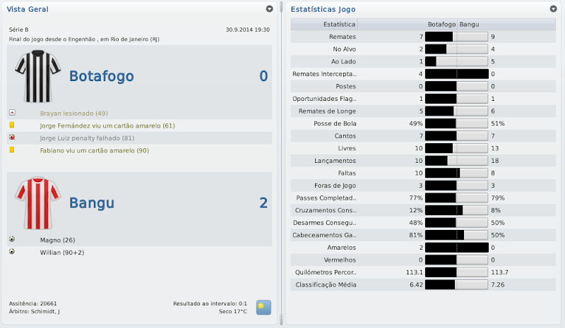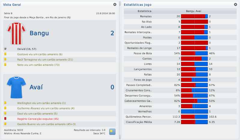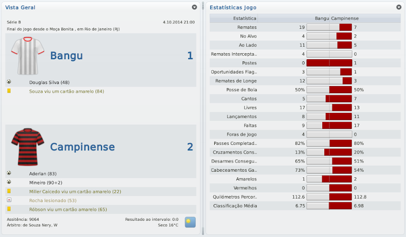 mfeitosa Postado 28 de Novembro 2010 Autor Denunciar Postado 28 de Novembro 2010 Superando todas e quaisquer expectativas da imprensa, o Bangu não esmoreceu e seguiu firme em sua campanha da Série B, com alguns tropeços ocasionais, normais em um campeonato tão longo, mas sempre no grupo de acesso. A começar pela vitória sobre o Avaí, 2 a 0, onde o veterano Deivid fez o que bem entendeu. Nas rodada seguintes, dois resultados "chorados", o empate frente ao América-RN, 1 a 1, e a vitória sobre o Santo André, 1 a 0, ambas com gols marcados no último minuto de jogo. Aos trancos a barrancos, a equipe de Marinho fazia o que podia, mas não conseguiu evitar a derrota para o forte Criciúma, fora de casa, 2 a 1. Logo depois, vieram duas boas vitórias que colocaram o Bangu de novo no topo, contra Paraná e Vila Nova. Com a defesa desfalcada, o Bangu teve seis rodadas de extrema irregularidade. Perdeu para o Paysandu, empatou com Brasiliense e em jogo histórico, venceu o Figueirense por 5 a 4. Naquela partida, o Bangu chegou a estar vencendo por 4 a 0, cedeu o empate e, ainda sim, conseguiu sair com a vitória. Que jogo! Já pela 23ª rodada, um novo encontro com o Botafogo na luta pela liderança. Desta vez o Bangu levou a melhor e venceu por 2 a 0, gols de Magno Capetinha e Willian. Infelizmente, o Bangu tropeçou feio nas duas rodadas seguintes contra os fracos Campinense e Ituiutaba e perdera a liderança. Entretanto, a vitória esmagadora sobre o Náutico, 6 a 0, deu novo fôlego ao time alvirrubro. Afinal, até onde a Máquina Alvirrubra poderia chegar? Citar