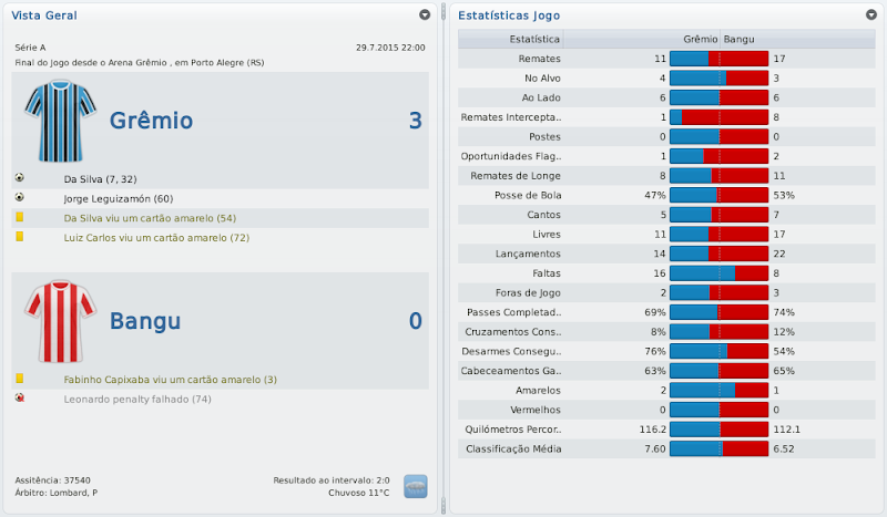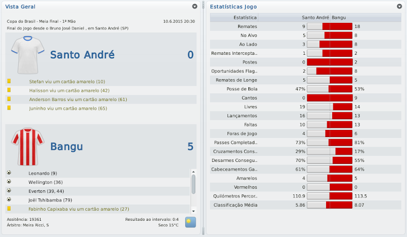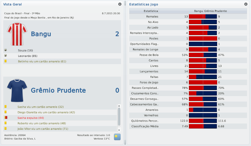 mfeitosa Postado 1 de Dezembro 2010 Autor Denunciar Postado 1 de Dezembro 2010 (editado) E aí Marcelo...não tive tempo de ler tudo ainda, mas do que li gostei muito. O save está muito bom, tem conseguido todos os objetivos, e realmente está devolvendo o Bangu ao seu verdadeiro lugar. Até me anima pra um dia fazer o save com o América-RJ :thumbsup: Boa sorte na Copa do Brasil e na Série A! Normalmente, quando não jogo com o Ceará, costumo optar por saves carreira, mas com o Bangu foi diferente. Me empolguei tanto que acabei escrevendo e jogando este save em um ritmo muito rápido, ficando realmente muita coisa pra ler. Mas que bom que gostou! Save com o América? Seria muito interessante também! Obrigado! Uma pena não ter conseguido ir mais longe nesse estadual, mas pelo menos está deitando na Copa do Brasil. Espero encerrar com chave de outro com esta Copa do Brasil. Retomei o save no intuiuto de conseguir uma vaga na Sulamericana, cumprindo o último objetivo, mas pelo jeito dá para passar disso! :thumbsup: Editado 1 de Dezembro 2010 por Marcelo Feitosa Citar