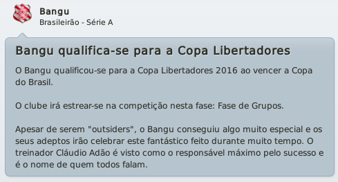 mfeitosa Postado 1 de Dezembro 2010 Autor Denunciar Postado 1 de Dezembro 2010 O Bangu de Cláudio Adão manteve o bom momento na Copa do Brasil e passou facilmente pelo Santo André, em confronto correspondente às Semi-Finais da competição. No primeiro jogo, um verdadeiro show de Everton e Tshibamba, os principais nomes daquele goleada por 5 a 0. O Santo André até tentou reagir, mas o alvirrubro era muito mais eficiente. Com uma vantagem tão larga a seu favor, o Bangu entrou despreocupado para a segunda partida e, ainda sim, saiu vitorioso, 3 a 2. Na outra chave, uma surpresa. O Grêmio Prudente havia eliminado o favorito ao título, Fluminense. Sorte de Cláudio Adão, que teria pela frente uma equipe do mesmo nível, ao invés do Tricolor das Laranjeiras. Os dois jogos foram muito bem disputados, e o Bangu teve sorte em sair na frente. Venceu o primeiro confronto por 2 a 0, gols de Souza e Leonardo. Na partida de volta, o veterano Souza voltou a brilhar e marcou o gol que, para muitos, será considerado o gol do título alvirrubro. O time estava perdendo por 3 a 0, e foi exatamente aquele gol que reanimou o Bangu em busca da conquista, 3 a 2. Um título inédito! Era a volta do Bangu à Libertadores! BANGU CAMPEÃO DA COPA DO BRASIL! Assim como Marinho, Cláudio Adão entraria para a história do Bangu Atlético Clube como jogador e treinador. Foi um feito e tanto! O jovem Everton, um dos destaques da campanha, foi o vice-artilheiro da competição, com 7 gols marcados em 8 partidas. Samuel Wilson, ídolo recente do clube, elogiou Everton sempre que teve a oportunidade, e uma delas foi depois do Bangu ter derrotado o Botafogo, pela 6ª rodada. A campanha no clube naquela volta a Série A foi digna de aplausos. Em nenhum momento do campeonato, o Bangu encerrou qualquer rodada na zona de rebaixamento, contrariando todas as expectativas da imprensa especializada. Sempre esteve na zona intermediária da tabela, sem muito risco, e assim terminou a competição, em 12º lugar, uma colocação excelente para um time que há tantos anos estava fora da Primeira Divisão. O trabalho fora tão bem feito, que Cláudio Adão foi eleito Melhor Técnico do campeonato. Já Marinho, pelo Botafogo, foi considerado o 3º melhor treinador. Vitórias espetaculares do time alvirrubro como foram as goleadas sobre Vasco da Gama, Portuguesa e Flamengo, duas vezes pelo mesmo placar, foram dignas de congratulações e ficaram na memória de todos os torcedores. O Bangu estava jogando como nos velhos tempos. Entretanto, alguns daqueles resultados os torcedores não irão fazer questão de guardar na memória, tais como as pesadas derrotas para Atlético Paranaense e Grêmio, e os cincos jogos sem vencer, entre as rodadas de número 30 e 34. De resto, a equipe se portou muito bem, sempre levando muita dificuldade a seus adversários, mesmo quando era derrotada. Esta campanha daria ao Bangu o direito de participar da Copa Sulamericana na temporada seguinte, cumprindo um dos objetivos de Cláudio Adão, mas a conquista da Copa do Brasil já havia colocado o time de Moça Bonita nas disputadas da Taça Libertadores da América de 2016, depois de 30 anos de sua primeira participação na competição. Ao final daquela temporada, Cláudio Adão, então considerado o melhor técnico da Série A, foi sondado por diversos clubes e acabou por aceitar o convite para comandar a equipe do Internacional em 2016. A proposta era irrecusável e chegada a quase cem mil reais mensais de ordenados, entre diversos outros fatores. A verdade era que Jorge Varela se encontrava na mesma situação em que iniciou 2015, sem técnico. Do outro lado, Marinho havia se desligado do Botafogo, declarando estar exausto de toda aquela confusão que era o futebol. Durante todo esses anos, Marinho havia juntado um bom dinheiro e, finalmente, conseguira inaugurar sua escolinha, projeto que era um sonho antigo seu. "E agora?", pensou Varela. O clube estava prestes a iniciar a temporada que marcaria a volta do Bangu a Libertadores da América e não tinha sequer um técnico. La Paglia? Tiano? Douglas Silva? Sérgio Manoel? Não, não, podem esquecer! Jorge Varela já sabia por onde começar! Em breve: O último capítulo. Citar