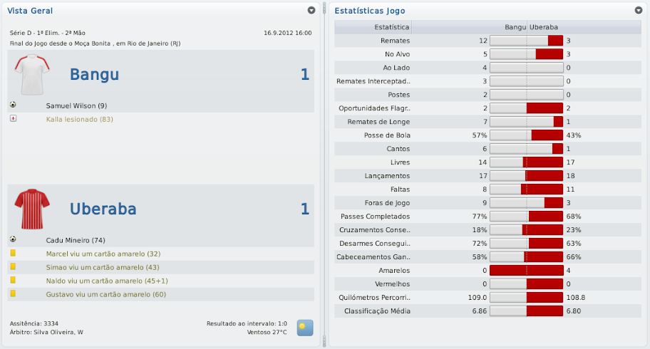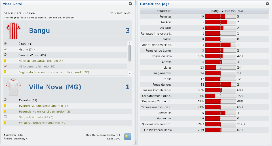 mfeitosa Postado 16 de Novembro 2010 Autor Denunciar Postado 16 de Novembro 2010 E vai dando frio na barriga! Parabéns pelo presente e BS pelo futuro! :specool: E bote frio na barriga nisso!! Obrigado, Leandro!! :thumbsup: tem tudo para conseguir o acesso, o time vem bem, jogando o necessário pra classificar. coisa que parece acontecer muito nesse fm é o time jogar melhor fora do que em casa... que consiga o acesso e o título, boa sorte. A impressão que eu tenho é que às vezes jogamos melhor fora de casa por conta das condições do campo do Moça Bonita. A bola nem rola direito. Será que é isso? :eusa_think: Valeu, Zimmer!! O acesso está para vir! O Bangu retornará a série C e subirá gradualmente até a série A. Vamos Bangu! Linda Saga Espero que sim, Skipe!! Obrigado, como sempre! :lol: Vamos melhorar papo! Para cima deles porra! Cadê a raça caramba ? Voltando ao Banguzão! Fazendo uma bela campanha, e mesmo não tendo os principais jogadores, surpreendendo à todos! Continue assim e irá longe! Isso mostra que realmente conseguimos montar um elenco. Só para se ter uma noção, o Tiano que foi um dos destaques da temporada passada quase não foi aproveitado em 2012, e é um bom meia. PS:O Juventude se safrou por conta do regulamento! :heh: Vamos ver se aproveitam desta vez. :heh: passou por cima... o fluminense eh um adversário mais chatinho... bora bora bangu É isso aí, Caio! Teremos que ter cuidado com o Flu baiano! :yes: Citar