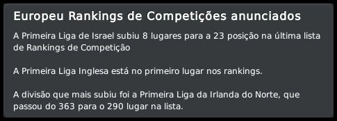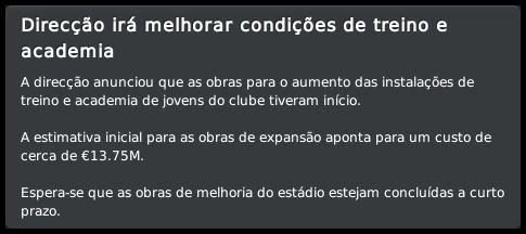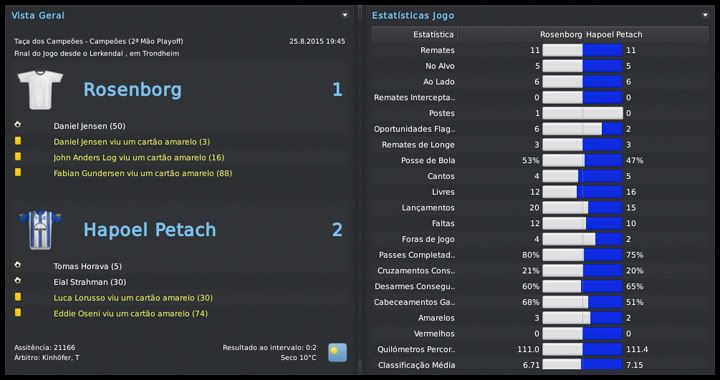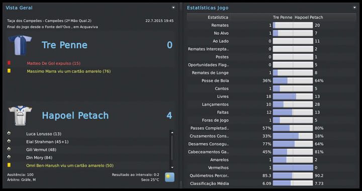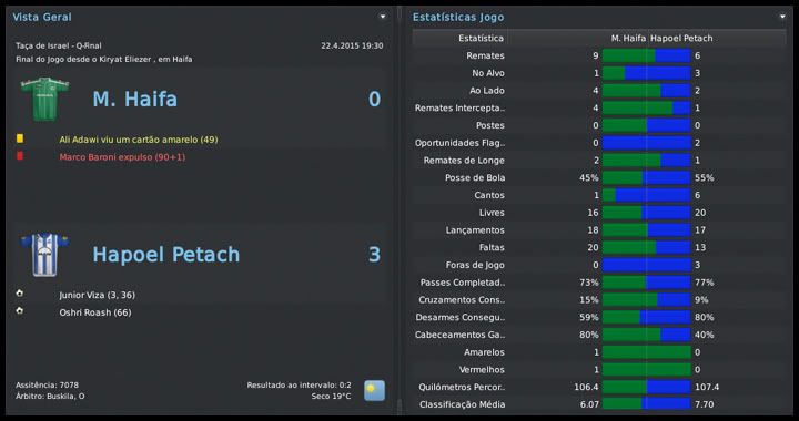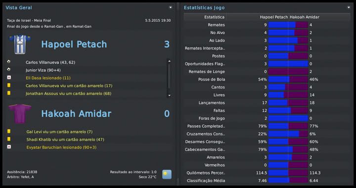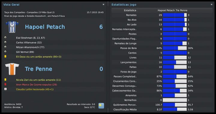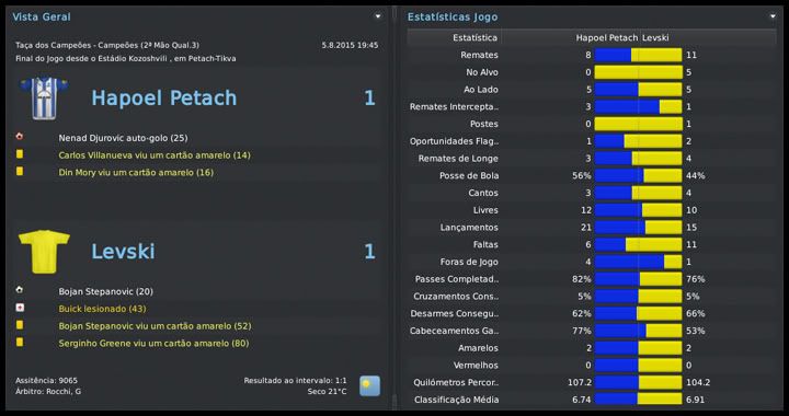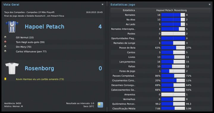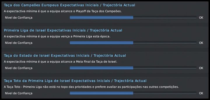 Bruno Trink Postado 28 de Janeiro 2011 Autor Denunciar Postado 28 de Janeiro 2011 27.08.2015 A pré-temporada continua Eis que, de forma oficial, tem início mais uma temporada com o meu pai no comando dos Blues. Muitas mudanças estruturais no clube, outras dentro de campo. A expectativa é uma só, manter a hegemonia conseguida nos últimos anos aqui em Israel. E, se possível, repetir a campanha na UEFA Champions League passada. O primeiro passo foi dado, estamos na fase de grupos. Foi mais difícil que nas temporadas anteriores, enfrentamos adversários de maior renome, mas o time fez aquilo que eu e o resto da torcida esperávamos. Agora vamos com tudo para encarar Roma, Porto e Gent, um grupo em que, se fizermos direitinho, temos total possibilidade de classificação. O Tre Penne, campeão são-marinense, primeiro adversário na Champions, não ofereceu nenhuma resistência. Goleamos duas vezes, tanto em casa quanto no acanhado estádio em Acquaviva, que nem pertence ao clube. Foi, pelo menos, uma experiência diferente. Então começaram nossas dificuldades. Bom, estou exagerando um pouco, mas o Levski, de Sofia, é uma equipe de mais tradição do que muitas que já enfrentamos nessas fases iniciais da Champions. Mas um gol do Vermut logo no início da partida no Vasil Levski facilitou muito as coisas para nós. No segundo tempo, ele marcou mais uma vez e nos deu uma importante vantagem. Em casa, um tanto quanto "em cima do salto alto" pelo resultado lá na Bulgária, o time jogou mal e apenas empatou. Mesmo assim, estávamos classificados para o playoff final. Mais um adversário de certa tradição, o Rosenborg foi presença constante até na fase de grupos da Champions lá pelo final do século passado e início desse. Sabíamos que não seria fácil e até uma vitória simples no primeiro jogo, em casa, seria um bom resultado. Mas fizemos uma partida praticamente perfeita, fomos superiores em todos os aspectos e praticamente encaminhamos a classificação. A goleada deu moral e fomos para Trondheim, na Noruega, confiantes. Mantivemos o nível da atuação do primeiro jogo e fizemos, sem problemas, 2 a 0 no primeiro tempo. O ritmo, naturalmente, caiu nos 45 minutos finais, já estávamos classificados, e eles diminuiram com um gol do Daniel Jensen. Nosso grupo, mais uma vez, não é dos piores, mas está longe de ser fácil. O AA Gent não deve oferecer muita resistência e, até por isso, a disputa por uma das duas vagas com Roma e Porto promete ser bem acirrada. O interessante foi que, pela primeira vez, e comprovando o nosso crescimento dentro da Europa, o Hapoel Petach Tikvah estava no 3º pote do sorteio. A intenção é crescer ainda mais nos próximos anos. Esses confrontos com Levski e Rosenborg, em que jogamos com o time titular, serviram para nos mostrar algo que não tínhamos percebido nos amistosos. Essa nova tática adotada no início da temporada fragmenta o time em duas partes. Quando estamos atacando, vamos muito bem com cinco jogadores. Mas, quando o adversário parte no contra-ataque, o time fica com um buraco enorme entre a defesa e o ataque. A solução óbvia que surgiu foi recuar o Horava, alterando o esquema para um 4-1-2-2-1 centralizado. Se houver necessidade, durante uma partida, tanto o Vermut quanto o Villanueva podem jogar mais abertos, como pontas. O esquema se mostrou muito mais equilibrado, mas o real teste será daqui a duas semanas, quando receberemos o Porto. Para finalizar, as competições domésticas. Mesmo num grupo muito difícil, o mais complicado que tivemos até hoje, estamos conseguindo nos manter na ponta da tabela da Gvia HaToto. Verdade que meu pai "apelou" e colocou os titulares para jogar o derby, muito por causa das dificuldades que tivemos nos dois primeiros jogos. Na Liga, estreamos com um empate em casa com o Beitar Jerusalem. Postado por rdayan Citar