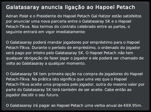 Bruno Trink Postado 26 de Janeiro 2011 Autor Denunciar Postado 26 de Janeiro 2011 òtimo,trink!O clube e a liga está crescendo. Tre Penne não vai dar trabalho algum, serão ótimos jogos treinos. Concordo com vc sobre a parceria com o Galatasaray, será pouco benéfica.Não deram outra opção não,né? sorte na nova temporada, principalmente fora de Israel, pois aí dentro a situação está cômoda. Situação cômoda até demais, né, Jiri?! Ainda bem que ainda tenho a motivação da Champions. Essa parceria é totalmente inútil, a diretoria já chegou com ela pronta. Ainda tentaram me empurrar um egípcio fraquinho toda a vida! :heh: O Hapoel não para de crescer e a liga de Israel vai no embalo. O problema é o limite de estrangeiros, apesar da liga mais forte atrair melhores jogadores de outros países, isso limita um pouco as contratações. Mesmo o campeão de San Marino não deve ganhar de ninguem. Esse limite é meio complicado mesmo, ainda mais que a garotada israelense não é das melhores. Talvez com o tempo, com essas melhorias nas instalações do HPT, passe a surgir newgens decentes. Citar