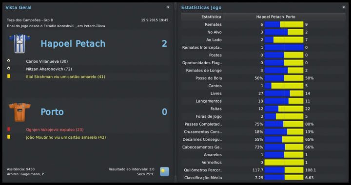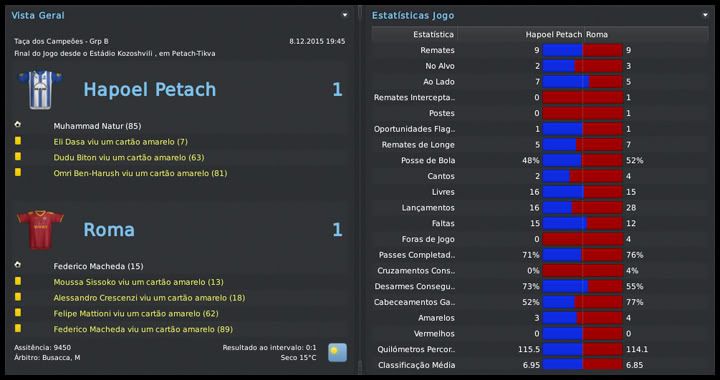 Bruno Trink Postado 1 de Fevereiro 2011 Autor Denunciar Postado 1 de Fevereiro 2011 Ótimo começo de UCL, conseguiu vencer as duas partidas que teve em casa e empatar a partida mais provavelmente difícil do grupo, contra a atual vice-campeã Roma. Agora é vencer o restante em casa, que é primeiro do grupo fácil. Nas competições israelitas tá bem, mesmo dando prioridade à UCL, ainda bem que o Petach não é um time, e sim uma equipe (acho que é assim que se diz). :lol: Israel sub-19, boa oportunidade, curiosa. Vai ser difícil convocar no começo, mas depois acostuma. BS lá! :thumbsup: Vamos ver nos jogos de volta contra Porto e Roma se as expulsões foram fundamentais ou se o time está bem mesmo. O grupo já tem sido importante há umas duas temporadas, desde que fomos bem naquela campanha da Europa League. Tive que montar um time reserva a nível das competições domésticas para concentrar os craques na Champions. Está sendo bem complicado convocar, tudo newgen e de um nível bem mais ou menos. Os melhores já foram convocados para a sub-21 e, mesmo com 19 anos, não podem jogar mais na sub-19. Na UCL tem feito uma excelente campanha e deve consolidar a classificação, talvez até como líder do grupo. O Hapoel Petach tá crescendo, isso é nítido e dentro de pouco tempo deve conseguir brigar forte com as equipes dos campeonatos europeus mais fortes. Vou torcer por uma boa passagem pela Sub 19 israelense. Estamos crescendo mesmo, a cada temporada, mas ainda acho que a limitação de cinco estrangeiros vai parar a gente logo. Não acho que dá pra brigar forte com Real, Barcelona, United e cia... Time surpreendendo na UCL e o Porto confirmando que só assusta no nome. :lol: Só achei pouco a Sub-19 por tudo que já fez. Merecia mais. É pouco, se a gente pensar em FM. Mas, se levar em consideração que é um treinador com apenas cinco anos de carreira, apenas em um clube, não sei se daria para esperar muito mais, mesmo com todas as conquistas dentro de Israel. Mas vamos crescendo aos poucos, junto com o clube. Citar