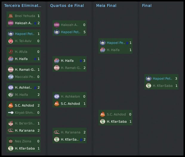 GG. Postado 8 de Fevereiro 2011 Denunciar Postado 8 de Fevereiro 2011 Excelente campanha e a eliminação para o Milan foi triste, mas o Petach perdeu dignamente. Imagine se fosse na vida real, o alvoroço que seria no dia da transmissão pela ESPN. :lol: Teremos subida no ranking da UEFA e na reputação da liga :thumbsup: O link da semifinal "semifinal da Gvia HaMedina" não funciona. Citar