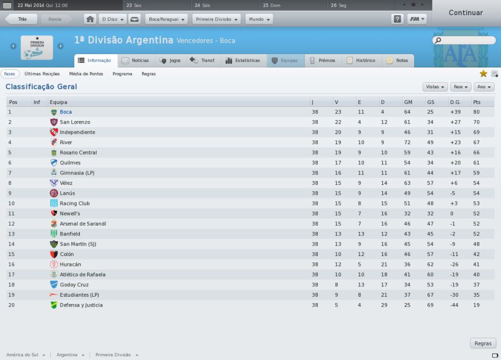gq-tricolor Postado 18 de Fevereiro 2011 Denunciar Postado 18 de Fevereiro 2011 Começo razoável no Clausura Priorizando a Libertadores nesse primeiro semestre de 2014 começamos mal o Argentinão. Como detentores do título é óbvio que quero papar mais um caneco nacional, mas os adversários não são nada amigáveis. Até a 5ª rodada só havia ganhado uma partida e rondávamos as últimas colocações. Foi aí que começou a Libertadores e o Boca se revigorou e não perdeu e nem empatou mais. Mesmo usando um time B no campeonato nacional. Hoje, depois de vencer três jogos seguidos, alcançamos a 4ª posição e, com um jogo a menos, estamos de novo credenciados como favoritos ao bicampeonato. O tal time B que joga o Argentino alterna entre o clássico 4-4-2 e um 4-1(MDC)-2(ME e MD)-2(MAC)-1. O time que joga no 4-4-2 é: Andújar; Cellay, Bianchi Arce, Pedro Aparicio e Sergio Escudero; Jesús Méndez (MD), Bollati, Riquelme e Damián Escudero (ME); Viatri e Bieler. O do 4-1-2-2-1: Andújar; Cellay, Bianchi Arce, Aparicio e Sergio Escudero; Bollati (MDC), Jesús Méndez (MD), Damián Escudero (ME), Gaitán (MAC) e Riquelme (MAC); Viatri. O tranquilo grupo G da Libertadores Bolívar e Llaneros de Guanare estão longes de oferecer a um Boca ou a um Grêmio qualquer forma de perigo. Por isso meu desafio maior nesse grupo é vencer os dois jogos contra o maior clube do sul brasileiro. E metade do caminho já foi completado. Na segunda rodada fomos à Arena Grêmio e conquistamos os suados três pontos. Até que ainda jogávamos bem quando Gago, do meio da rua, acertou um chute forte sem chances para Victor. Depois que a coisa ficou feia. O Grêmio, com Borges e Jonas, tentou de todas as maneiras empatar o clássico continental, mas sem sucesso. Vencemos a primeira batalha contra oa azuis de Porto Alegre. A próxima rodada nos colocava cara a cara com o fraquíssimo time da Venezuela que compõe o nosso grupo. Como era esperado, foi um massacre dentro da Bombonera. Boshossian, Dátolo, Gago e Sergio Araujo deram show. Rumo ao melhor desempenho na fase de grupos. Os onze da Libertadores jogam no 4-4-2: Andújar; Cellay, Robert Herrera, Insaurralde e Clemente Rodríguez; Neri Cardozo, Battaglia, Gago e Dátolo; Boghossian e Sergio Araujo. Estatísticas Gols: Gaitán (6) Boghossian, Sergio Araujo, Viatri e Neri Cardozo (5) Robert Herrera (4) Assistências: Dátolo (9) Damián Escudero e Neri Cardozo (7) Viatri e Cellay (4) Classificação média: Robert Herrera (7,34) Boghossian (7,21) Insaurralde (7,19)