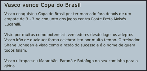 Darthz Postado 27 de Fevereiro 2011 Autor Denunciar Postado 27 de Fevereiro 2011 O Vascão está de volta! Chegámos ao meio da época, com os meses de Junho e Julho a serem muito cheios. Jogávamos as fases finais da Copa do Brasil, e no Brasileirão enfrentávamos alguns adversários de peso na luta pelo título. Além disso era nesta altura que voltavam as transferências. Eu já tinha decidido não fazer alterações ao plantel a nível de entradas, a questão era se alguém sairia. Acabámos por vender o Carlos Alberto para o Mainz por 1,4 milhões de euros. Já que andava insatisfeito, que vá jogar para outro clube e não me dê mais problemas. Houve alguns rumores de mais saídas, mas até agora consegui segurar os jogadores importantes e espero que não existam surpresas de última hora que me obriguem a recorrer ao marcado de transferências para “tapar buracos”. Os jogos para o Campeonato Brasileiro em Junho não trouxeram dificuldades, e mostrámos por que somos actualmente a melhor equipa do Brasil. Duque de Caxias, Atlético Paranaense, Fluminense e Goiás foram todos derrotados pelo Vasco, que começa a dar sinais de ser o principal candidato ao título. Não podemos deixar de ter os pés no chão, mas a continuar a este ritmo, e sem grandes percalços, penso que poderemos ganhar o Brasileirão e fazer uma época brilhante. Disputámos ainda em Junho a meia-final da Copa do Brasil contra o Flamengo, que é um grande rival nosso. No primeiro jogo arrumámos logo a eliminatória, com uma vitória por três a zero, que praticamente não deixava dúvidas da nossa passagem à final. No segundo jogo voltámos a ganhar por três a zero, voltando a fazer uma excelente exibição que deixou os nossos adeptos extremamente satisfeitos e com grandes esperanças de vencer esta competição. Iniciávamos o mês de Julho com uma partida muito importante para o campeonato, e contra um adversário que mercê imenso respeito. O São Pulo é uma equipa fortíssima, com jogadores muito rápidos e tecnicamente muito dotados. Além disso têm uma base forte, que permite que qualquer que sejam os jogadores que entrem em campo, têm sempre a garantia de serem os mais adequados à partida. Apesar de todas as “armas” do adversário, nós também tínhamos as nossas, e além disso jogávamos no São Januário, perante os nossos adeptos. Foi um excelente jogo, que acabámos por vencer por um resultado um pouco desnivelado. Entrámos muito bem na partida, ao marcar logo aos 7 minutos por Jumar, numa boa jogada de ataque. O São Paulo atacava também e durante toda a primeira parte criaram várias situações que puseram a nossa baliza em perigo. Não conseguiram marcar, e por isso fomos para o intervalo com a vantagem mínima no placar. No segundo tempo tentámos controlar mais o jogo, utilizando a estratégia do contra-ataque. Apesar disso, toda a segunda parte teve bastante emoção, com o ataque do São Paulo a tentar empatar e nós a tentar confirmar a vitória. Finalmente conseguimos fazer o segundo já aos 83 minutos de jogo, por Léo Gago. Aumentámos ainda mais a nossa conta, com Thiago a fazer o três a zero de penaltie, mesmo no fim do jogo. Vencemos muito justamente e mostrámos que podemos ganhar a qualquer adversário. De seguida jogámos a primeira mão da final da Copa do Brasil, que iríamos disputar com o Ponte Preta. Apesar de a primeira mão ser em nossa casa, tivemos muitas dificuldades, e empatámos a um golo para meu espanto, que vi a equipa falhar imensos lances e desperdiçar a hipótese de resolver o troféu logo no primeiro jogo. Jogámos depois mais dois jogos para o Brasileiro, contra Botafogo e Cruzeiro. No jogo com o Botafogo ganhámos apenas pela margem mínima, assegurando a vitória mesmo nos minutos finais, quando já ninguém acreditava que conseguíssemos os três pontos. Com o Cruzeiro acabámos por ganhar por dois a um, muito por culpa de uma falha defensiva que ia deitando tudo a perder ainda no primeiro tempo. Apesar das dificuldades conseguimos mais duas vitórias contra adversários fortes e isso é que é importante. O segundo jogo da Final da Copa do Brasil prometia muito. Nós éramos favoritos, mas o Ponte Preta tinha conseguido surpreender na primeira mão e desta vez jogavam em casa. Eu estava com muito receio pois estávamos numa série de jogos muito complicada e ainda teríamos de enfrentar o Corinthians este mês, numa partida que também era importante para as nossas aspirações no campeonato. Foi mais um jogo de loucos! Como tive de apostar em alguns jogadores menos utilizados, devido a carga de jogos, não entrámos tão ofensivos como de costume, e o Ponte aproveitou para jogar de igual para igual connosco. Apesar disso conseguimos marcar aos 25 minutos, através de um canto, por Matheus. O adversário respondeu ainda no primeiro tempo, e fez o empate aos 42 minutos. No segundo tempo o jogo continuou na mesma, até que Reis colocou o Ponte Preta em vantagem, num lance que me deixou furioso. Precisávamos de empatar para conseguir vencer a Copa do Brasil, e Borja, que normalmente nem suplente é, fez o golo que nos dava a Taça. Não houve alterações no placar até final do jogo e sendo assim é mais um troféu que vencemos esta época! Com este resultado passei a ser o melhor treinador irlandês de todos os tempos, o que ainda não quer dizer muita coisa. O último jogo do mês foi contra o Corinthians, e posso dizer que não fiquei nada surpreendido com o resultado final. Apenas conseguimos empatar e fui totalmente impossível fazer mais, já que passei o jogo todo a tentar impedir que o adversário conseguisse marcar. Não jogámos nada de jeito e tive de dizer aos jogadores umas quantas verdades no final da partida. Apesar disso, posso dizer que estou muito esperançado com os resultados destes dois meses, pois mostram que o Gigante da Colina está de volta! Estamos já em primeiro lugar, com uns excelentes oito pontos de vantagem s