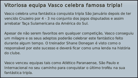 Darthz Postado 5 de Março 2011 Autor Denunciar Postado 5 de Março 2011 O Gigante da Colina não brilha só no Brasil! Outubro e Novembro… Eliminatórias finais da Taça Sulamericana e jogos do campeonato brasileiro, que a qualquer momento podia ter um novo campeão, nós, tal era a diferença pontual que já tínhamos para os perseguidores. Com dois troféus já ganhos, eu estava bastante esperançado que pudéssemos acrescentar mais dois, ganhando todas as competições em que participávamos esta época. Além disso, tinha uma surpresa de última hora que não tinha mostrado no post anterior. Jardins, lateral muito jovem e promissor, foi contratado ao Cruzeiro para dar mais velocidade ao nosso flanco esquerdo. Não ia jogar no Brasileirão, mas podia fazer muitos estragos na Sulamericana, que começa agora a apertar o nosso calendário, pois estamos com jogos de três em três dias. Esta recta final vai ser muito complicada, mas penso que estaremos à altura e não desiludiremos ninguém. Nos três primeiros jogos, contra Fluminense, Goiás e São Paulo, conseguimos dois empates e uma vitória. Os resultados são relativamente normais, pois enfrentámos dois adversários bastante fortes, do nosso nível, onde obtivemos dois pontos. O jogo com o Goiás deu-nos mais três pontos, como seria de prever, pois enfrentámos um adversário bastante mais fraco que nós. Mais uma eliminatória da Sulamericana, desta vez contra o São Paulo. O adversário era complicado, e já nos tinham arrancado um empate neste mês de Outubro. Eu estava um pouco na expectativa do que iria acontecer, devido ao resultado anterior, mas estava um pouco mais confiante, devido à volta de alguns jogadores de lesão e ao bom desempenho dos suplentes que tinham sido chamados a substitui-los nas partidas anteriores. Estava tudo preparado para uma grande partida de futebol, e eu só esperava um resultado: a vitória. Ganhámos por três golos a zero e com uma grande exibição colectiva. Os nossos médios estiveram brilhantes, ao marcarem dois golos e ao estarem na construção do terceiro. O resto da equipa não esteve nada atrás e faltam-me palavras para descrever a qualidade de passe e de remate da equipa. A nossa primeira parte foi diabólica, com quase cem por cento de eficácia nos lances de golo e com um excelente controlo dos movimentos adversários. No segundo tempo foi só controlar o jogo, com mais alguns lances flagrantes. Assim, conseguimos uma excelente vitória com uma margem que nos dá praticamente a passagem. O segundo jogo não teve história. Vencemos por um a zero e fizemos a nossa parte. Jogámos em contra-ataque quase o tempo todo e fizemos o nosso jogo, não deixando o adversário atacar nem tentar virar o jogo e a eliminatória. Não conseguiram e nós passámos à fase seguinte com muito mérito e com toda a justiça. Depois desta eliminatória posso dizer que somos candidatos ao título, sem sombra de dúvidas. Cruzeiro e São Caetano foram os últimos adversários do campeonato no mês de Outubro. Conseguimos mais quatro pontos, com um empate contra o Cruzeiro e com uma vitória com o São Caetano. Não fizemos exibições brilhantes, mas “deram para o gasto”, pois adicionamos mais dois bons resultados e continuamos imbatíveis esta época, ainda sem qualquer derrota. Novembro iniciou-se com as partidas que tinham como adversários o Botafogo e o Corinthians. O primeiro é o segundo classificado do campeonato e o segundo é um rival que merece todo o nosso respeito. Ganhámos os dois jogos pela margem mínima e confirmamos a nossa superioridade sobre ambos os adversários e praticamente resolvemos a questão do título. Se ganharmos mais um jogo somos campeões antecipados e poderemos focar-nos na Sulamericana, troféu muito importante. Nos quartos de final da Sulamericana enfrentámos mais uma equipa brasileira, o Internacional. Foi uma eliminatória equilibrada, em que fizemos um bom resultado foram, ao empatar, e ganhámos pela margem mínima em casa. Não demos o nosso máximo, mas foi o suficiente para passar por este adversário, que se revelou um pouco mais fácil do que se previa. Vamos ver como correm as meias-finais. Chegava então jogo decisivo. Se vencêssemos, seríamos campeões. O Coritiba, que tinha começado muito bem o campeonato, começava a fraquejar, e era o adversário ideal para que não pudéssemos festejar o título. O jogo era no São Januário, dando hipótese aos nossos adeptos de fazerem a festa connosco e de verem de novo o Vasco campeão. Não sabia se poderia contar com a equipa na máxima força, mas esperava que os que entrassem em campo dessem o máximo para que o título fosse conseguido já nesta jornada. Bismarck foi um verdadeiro herói, ao marcar o golo da vitória, que nos deu o título. Não começamos muito bem, ao desperdiçar alguns lances de golo logo nos primeiros minutos do encontro. Continuámos a rematar e finalmente aos 37, o nosso centro campista, com um remate estrondoso, faz a festa nas bancadas. O primeiro tempo acabou sem mais golos e tudo estava muito bem encaminhado para uma excelente segunda parte. No segundo tempo continuámos o “massacre”, com remates atrás de remates. Estávamos a vencer, mas tudo podia correr mudar de figura se o Coritiba marcasse. É certo que o adversário quase só defendeu, mas podíamos ter tido azar, o que felizmente não aconteceu. Não houve mais alterações no marcador, e sendo assim, sagrámo-nos campeões brasileiros, para alegria de todos! Depois do jogo que nos deu o título, ainda fizemos mais uma partida neste mês de Novembro, desta vez contra o Flamengo. Entrei em campo com vários suplentes no onze inicial, já a contar com as meias da Sulamericana. Não fizemos má figura, e conseguimos um empate a zero que em nada envergonha a nossa equipa. É certo que não estivemos tão bem como de costume, mas não foi uma exibição nada má. Para terminar este mês, jogámos o acesso à fin