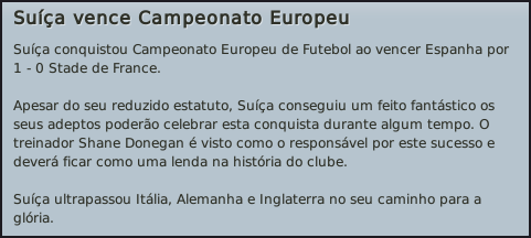 Darthz Postado 27 de Abril 2011 Autor Denunciar Postado 27 de Abril 2011 (editado) A Suíça e a Europa! Mais uma vez volto a interromper a descrição da campanha do Vasco neste ano de 2016 devido à participação da Suíça no Europeu de 2016, que se disputava na França. Entrávamos na competição com aspirações a algo, não sendo favoritos, mas com boas hipóteses de surpreender. Não tive grandes dúvidas na convocatória, com a espinha dorsal da equipa a ser formada por Benaglio, Inler, Derdiyok e Ben Khalifa . Seria importante vencer o grupo e fazer boas exibições nos primeiros jogos, para que pudéssemos ganhar confiança, e quando enfrentássemos adversários poderosos, estivéssemos à altura. Não queria fazer a festa já de início, mas parecia-me que muitas equipas iriam ficar surpreendidas connosco e com a nossa forma de jogar, e isso podia ser muito bom para nós. Ainda antes do Europeu fizemos um último teste com o País de Gales, e o jogo fui um pouco mais renhido do que eu esperava. Não entrámos bem, e só conseguimos impor o nosso estilo de jogo na segunda parte, com o adversário a dificultar-nos muito a tarefa, com as arrancadas de Bale. Acabámos por sofrer dois golos e não podemos estar tão desatentos nos jogos a sério se queremos alguma coisa da competição que se avizinha. Finalmente, começámos este europeu com a fase de grupos, em que defrontámos a Croácia, que é uma selecção de grande valor, sempre com jogadores muito rápidos e tecnicistas. Não fizemos uma partida perfeita, mas para inicio de europeu não foi mau. Acabámos por empatar a dois, com uma exibição bastante fraca da defesa, que me pareceu muito nervosa. Neste tipo de competições não podemos facilitar, e espero que estas falhas não se repitam. Jornada seguinte, resultado totalmente diferente. Entrámos a todo o gás contra a Bulgária, e atropelámos o adversário com um brilhante quatro a zero. Estivemos muito bem em todo o jogo, o ataque muito sólido, e isso ficou demonstrado com os quatro golos marcados. A próxima ronda será decisiva e necessitamos de vencer para ficar descansados. O um a zero final nesta ultima partida do grupo A, contra a Áustria, chegou perfeitamente para nos levar à fase seguinte. O golo que nos deu os três pontos chegou mesmo no fim do jogo, quando eu já esperava que o resultado ficasse a zeros. Felizmente Ben Khalifa voltou a resolver e deu-nos três pontos que resolveram a questão do primeiro lugar do grupo A. Os oitavos de final seriam bastante complicados, pois a Itália seria o nosso adversário e nunca são uma equipa fácil de enfrentar, apesar de não terem estado muito bem na fase de grupos. Esta seria uma partida decisiva para perceber do que somos capazes. Assim, os jogadores entraram em campo com garra e fizemos uma exibição excelente, vencendo por um três a zero demolidor. O adversário não conseguiu entender-se com a nossa forma de jogar e foram humilhados em campo. Estamos nos quartos e quem sabe o que poderemos fazer? A Alemanha foi um adversário bem mais difícil que a Itália. Jogaram com o seu superior poderio físico e isso quase nos custou o jogo e a passagem às meias. No primeiro tempo não conseguimos acertar o meio campo e as marcações e os alemães aproveitaram para criar muito perigo, que só não deu em golo devido ao nosso guarda-redes. No segundo tempo finalmente jogámos como sabemos e marcámos o golo que nos colocava ainda mais perto do sonho. Chegávamos então as meias-finais do Europeu. O adversário era a Inglaterra, equipa que num passado recente é recordada por falhar nos momentos chave de competições importantes. Apesar disso não esperávamos um jogo fácil. Claro que se já tínhamos chegado até aqui, não nos custava nada sonhar e pensar na final, mas antes era necessário deixar tudo em campo para que isso fosse possível. Não entraríamos com medo, mas algumas precauções defensivas não foram esquecidas. A Inglaterra entrou bem melhor que nós, e logo aos seis minutos, numa desconcentração da defesa, Gabby Agbonlahor faz o primeiro golo da partida, favorável à Inglaterra. Não conseguíamos encontrar o nosso estilo de jogo, atacávamos muito timidamente e o adversário aproveitava-se disso para controlar a partida. Até final do primeiro tempo não houve muito mais a registar e os jogadores seguiram para os balneários com a Inglaterra a ganhar por um. No intervalo alterei as coisas, e logo no primeiro minuto do segundo tempo Ben Khalifa empata a partida. Não era o suficiente para passar, mas levava a decisão a prolongamento. Pouco depois Derdiyok decide não ficar atrás do companheiro e faz o segundo para nós, pondo-nos em vantagem. A Inglaterra sentiu o toque, e procurou subir no terreno. Passámos então a jogar em contra-ataque, e aos oitenta e um, Derdiyok faz o seu segundo golo no jogo, quase confirmando a nossa passagem. Os ingleses ainda reduziram, mas já era tarde demais. Estamos na final com grande mérito e agora tudo é possível. Poucos acreditavam, mas era a verdade. A selecção Helvética estava na final e tinha largas hipóteses de ganha-la. Mas uma vez não éramos favoritos, mas isso já tinha acontecido em eliminatórias anteriores e nunca foi justificação para nós. É certo que a Espanha era o adversário menos desejado nesta final disputada no Stade de France, mas se conseguíssemos colocar toda a nossa qualidade e vontade de ganhar dentro das quatro linhas, não haveria forma de perdermos o tão desejado troféu e de fazermos história para o povo helvético. Estava tudo nas nossas mãos. Como se esperava, a Espanha entrou a todo o gás, dominando o meio campo e tentando visar a nossa baliza, com o seu meio campo a trazer muita criatividade, criando vários problemas para os meus jogadores. Não nos amedrontámos e fizemos o que seria de esperar: demos o controlo da partida ao adversário e íamos tentar surpreender em contra-ataque. A defesa porto