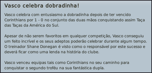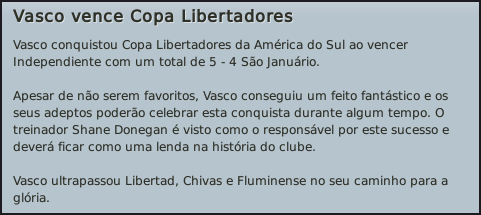 Darthz Postado 10 de Abril 2011 Autor Denunciar Postado 10 de Abril 2011 O maior das Américas Momentos decisivos se aproximavam nestes meses de Junho e Julho. Disputávamos as meias finais da Libertadores, com grandes possibilidades de conseguir chegar à final e vencer o troféu, enfrentávamos o Corinthians na Recopa e ainda teríamos o campeonato. Apesar de a equipa estar a jogar bastante bem, eu não iria arriscar. O nosso objectivo principal é a Libertadores, e prefiro dedicar-me a cem por cento a esta competição, esquecendo um pouco as outras. A Recopa também era um troféu importante, e se as coisas resultassem como eu estava a prever, poderíamos conquistar dois títulos em apenas um mês. No campeonato tudo tranquilo, pois ainda vamos no início e nada está decidido ainda. De frisar também que já tomei a minha decisão: vou continuar no Vasco até final da época e só depois voltar à Europa. Junho começava logo com o grande dérbie brasileiro, em que o Fluminense tentava impedir que chegássemos à tão sonhada final da Libertadores. Na primeira mão, em que jogámos fora, conseguimos fazer um resultado bastante positivos, em que o zero a zero final nos abria as portas para a passagem. No segundo jogo assumimos o favoritismo desde inicio e ganhámos sem qualquer problema por um resultado de dois a zero que fez os nosso adeptos festejar a presença na final, que já não acontecia há muitos anos. Para o Brasileirão jogámos com Botafogo, Palmeiras, Bahia e Atlético Mineiro. Devido ao avançar da Libertadores, decidi poupar quase toda a equipa titular, e claro as exibições e os resultados ressentiram-se disso. Contra o Bota e o Palmeiras ainda conseguimos vencer com exibições razoáveis, mas a equipa quebrou inexplicavelmente com o Bahia e sofremos a primeira derrota da época, a juntar a uma péssima exibição que me deixou muito envergonhado. O Atlético mineiro também não nos facilitou as coisas e fechámos este mês com um empate a dois. Com a participação tão sonhada na final da Libertadores, era altura de jogarmos a primeira mão, que seria fora. O Independiente, equipa com muita história, era o último obstáculo ao nosso sonho de vencer um troféu que escapa ao Vasco desde 1998. Neste primeiro jogo fizemos uma excelente exibição e acabemos por vencer por três a um, dando um passo de gigante para a vitória final. É certo que a utilização de toda a equipa titular nos custou uma derrota para o campeonato, mas valeu a pena. Ainda em Junho jogámos mais uma primeira mão de uma final, desta vez a primeira mão da Recopa, contra o Corinthians. Batemos o conjunto de São Paulo por um a zero no São Januário e tudo apontava para que fosse possível festejar dois títulos já neste mês de Julho. Bastava apenas que a equipa conseguisse segurar os resultados obtidos. Assim chegava no inicio de Julho, o jogo decisivo da Libertadores. Tínhamos uma vantagem confortável da primeira mão, mas a equipa não estava no seu melhor do ponto de vista físico, e eu tinha receio que esta quebra pudesse produzir um efeito avalanche no adversário. Teríamos de ser mentalmente muito fortes, para que o tão desejado título da Libertadores chegasse finalmente e para que os adeptos pudessem chorar de alegria pelo seu Vascão. Foi um excelente jogo, com lances de futebol espectaculares e em que a equipa que foi mais regular durante toda a eliminatória venceu. Nos primeiros vinte minutos de jogo fomos praticamente nulos no ataque, já que o adversário entrou com tudo e marcou dois golos num curto espaço de tempo. Senti a equipa tremer muito e alterei o esquema táctico. Marcámos logo depois, reduzindo para dois a um, mas o Independiente voltou a aumentar a contagem, igualando a eliminatória. No intervalo disse aos jogadores que não podíamos deixar fugir o título. Não interessava se perdêssemos o jogo, pois apenas necessitávamos de mais um golo para ter tudo a nosso favor. Os jogadores sentiram o mesmo que eu, e Renatinho, apenas um minuto depois do reatamento do jogo, faz o nosso segundo golo e põe-nos em vantagem. Alterei o esquema de novo e coloquei a equipa a defender até final. Não sofremos mais nenhum e chegámos ao topo das Américas, e com inteira justiça! Poucos dias depois jogávamos mais uma partida que decidiria um troféu: a Recopa. Desta vez o adversário era o nosso velho conhecido Corinthians. Com tão pouco tempo entre jogos decisivos, e para não perdermos a hipótese de vencer esta final, alterei o esquema táctico da equipa, dando a posse de bolo ao adversário, mas mantendo sempre o controle de meio campo. Esperava que a táctica desse frutos, pois o Corinthians é uma equipa de contra-ataque, que não gosta de assumir o jogo. O empate serviu perfeitamente os nossos objectivos, e sem grandes problemas, levámos “ a água ao nosso moinho”. O Corinthians tentou durante todo o jogo assumir a partida e tentar criar chances, mas a minha táctica surtiu efeito. Não conseguiram criar muitas chances de golo, e quando o fizeram, foi em lances de bola parada. Tudo ficou ainda mais difícil para eles quando Jô, que até estava a ser dos melhores em campo, saiu lesionado. Continuámos a controlar até final e já cá canta mais um título! Para fechar o mês de Julho em beleza, cinco jogos para o campeonato. Vencemos todos, e posso dizer que era uma séria de partidas teoricamente muito complicada, com Flamengo, Icasa, Corinthians, Grémio e São Paulo a serem adversários de muito respeito. Apesar de tudo conseguimos resultados bons e exibições bastante boas também, que dão seguimento ao bom trabalho que temos vindo a fazer. Vamos ver como será daqui para a frente, mas se continuarmos assim, será uma época histórica. Devido à derrota com o Bahia apenas temos dois pontos de avanço sobre o São Paulo, quando estão treze jornadas disputadas. O último classificado é o Avaí, com apenas cinco pontos e nenhuma vitória. Citar