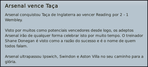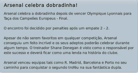 Darthz Postado 2 de Agosto 2011 Autor Denunciar Postado 2 de Agosto 2011 Objectivo Champions alcançado! O final de época aproximava-se, e com o campeonato já praticamente perdido para o Tottenham, muito por culpa do péssimo inicio de época, restava-nos lutar pelas competições que poderíamos ganhar: Champions League e FA Cup. Os Quartos de final da liga dos milhões prometiam muito, já que iríamos enfrentar o Bracelona, sendo que na taça teríamos a tarefa um pouco mais facilitada, com o embate frente ao Nottingham Forest, partida jogada em campo neutro. Os dados estavam lançados e eu queria, pelo menos, vencer a Champions, deixando ao Premier League para o ano que vem. Os quartos de final da Champions foram jogos muito complicados, e disputados a uma intensidade electrizante. Vencemos a primeira partida por três a um, com um bom trabalho dos avançados da equipa, mas o golo sofrido incomodava-me um pouco. No segundo jogo, em Camp Nou, jogámos para defender o resultado da primeira mão, e apesar da derrota por dois a um, estávamos na final contra o Futebol Clube do Porto. Para o campeonato disputámos três jogos durante o mês de Abril. Vencemos o Chelsea por três a dois, o Blackburn por três a zero e o West Ham por dois a zero. O jogo mais complicado foi sem dúvida com os Blues, em que tivemos de suar muito para arrancar uma merecida vitória sobre um adversário directo na luta pelos primeiros lugares da liga inglesa. Nas meias da Taça de Inglaterra não tivemos qualquer dificuldade em bater o Forest, equipa bastante abaixo de nós e que nunca conseguiu causar surpresa. Dominámos o jogo a nosso belo prazer e quando o jogo terminou não foi estranho para ninguém verificar a nossa vitória por três bolas a zero. As meias-finais da Liga milionária opuseram-nos ao Porto na luta pelo lugar na final da competição, e conseguimos não desiludir os adeptos. A primeira partida, disputada no Estádio do Dragão, teve como resultado um empate a uma bola que levava a decisão para o segundo jogo. Não era o resultado ideal, mas também não era mau. No jogo de volta conseguimos vencer, e apesar do Porto ainda ter assustado, ao marcar um golo incrível, conseguimos obter a passagem à final, que era o mais importante. Os últimos jogos do campeonato foram contra Swansea, Blackpool e Sunderland. Como seria de esperar, poupei jogadores e coloquei em campo os menos utilizados, já que o mais importante eram as duas finais que tínhamos pela frente. Ainda assim, conseguimos vencer duas partidas e empatar apenas uma. Para o ano há mais campeonato! A primeira das duas finais que iríamos disputar neste final de época era a que teoricamente seria mais fácil. O Reading não é uma grande equipa, e surpreendeu quase toda a gente ao conseguir chegar à final de Wembley. Era necessário respeitar bastante o adversário e dar o nosso melhor para não sermos surpreendidos por uma equipa que deveria estar ao nosso alcance. Fizemos uma partida boa, não brilhante, mas ainda assim chegou para vencer mais uma edição da FA Cup. Acabámos por ganhar por dois a um, fruto dos golos de Denton e Tosic. O Reading também marcou o seu, por intermédio de Keogh. Foi um bom ensaio para o final da Champions, e além disso, é sempre positivo ganhar uma Taça de Inglaterra. E chegava a partida mais importante do ano: a tão desejada final da Champions League. O adversário era o Lyon, equipa que eu já tinha defrontado ao serviço do Vasco na final do Mundial de Clubes. Não achava um adversário extremamente difícil, mas era necessário ter cuidado, pois se tinham chegado até aqui, é porque tinham boa equipa e não eram uns nabas quaisquer. Claro que nós éramos favoritos, mas nada de pensar que o jogo já estava ganho. Foi uma partida muito complicada. No primeiro tempo fizemos um belo trabalho, controlando todo o meio campo e impedindo os franceses de chegarem à nossa baliza. Também estivemos bem no ataque e foi com inteira justiça que fomos para o intervalo a ganhar, com golo de Bentner. No seguindo tempo o Lyon entrou mais atrevido e com vontade de virar o jogo, mas Samir Nasri fez das suas e marcou o segundo para nós. Tudo começou a ficar negro quando Jorgensen se enganou na baliza e fez o primeiro para os adversários e piorou ainda mais com o golo de Martinez a restabelecer a igualdade, aos 85 minutos. No prolongamento ninguém arriscou nada e foi sem surpresas que fomos a penalties. Aí fomos perfeitos. Os jogadores mostraram-se uns bravos e não falharam. Finalmente o Arsenal conquistava a Europa e eu ganhava a minha primeira Champions League! Citar