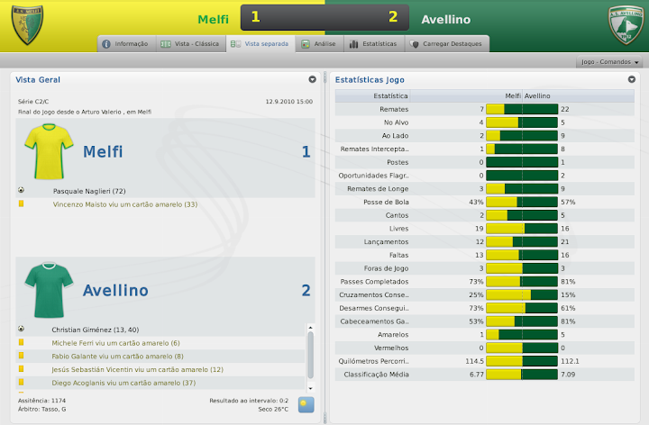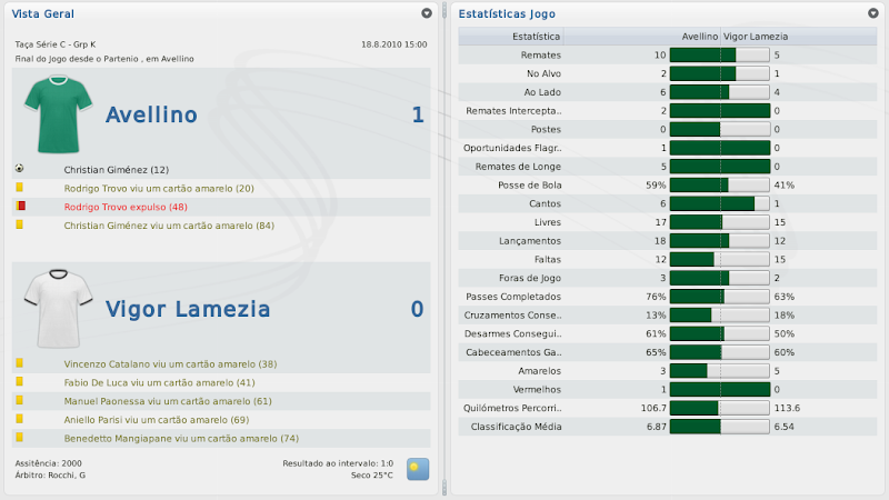mfeitosa Postado 4 de Janeiro 2011 Denunciar Postado 4 de Janeiro 2011 Começou bem. Na C2/C está na parte de cima da tabela e continuar somando é fundamental pro time se manter bem, nas primeiras posições. Uma pena o time não ter se classificado na Taça, mas tá bom. Dá pra se dedicar somente pra C2/C. A primeira fase da Taça Série C é muito curta, e como eu tropecei duas vezes, não teve jeito. Quem sabe na temporada que vem. Já na C2, melhoramos muito e enfim estou gostando do comportamento do time em campo. Embalou agora parece, venceu aquele time que é um dos favoritos, que esta em divisões acima da tua se não me engano, então parece que vai conquistar esse título fácil! Deve estar falando do Paganese. Sim, trata-se de um time da Série C1 e é bem competitivo. Jogamos perfeitamente contra ele e não demos chances. Há se fosse sempre assim, né?! :heh: Valeu, Igor! Agora sim, entrando no ritmo. Morfeo já dando passe pra gol, que beleza. Chegou na área de classificação e agora é não sair mais, de preferência para a área de subir direto. Exatamente, saggio. Estou deixando o Morfeo livre em campo e ele tem rendido muito bem até agora. Espero que continue, pois iremos precisar! Não tinha lido nada da tua história Feitosa, mais como sempre, fazendo o leitor comer com os olhos o save, seus gráficos sempre bonitos e principalmente originais, isso é muito importante. Tem tido bons resultados no Calcio C, e já subiu de produção e subiu também na tabela. Obrigado pelas palavras, Netow! Fico contente! Quanto ao save, iniciamos mal, mas logo conseguimos acertar um esquema, pena que não a tempo de conseguir uma classificação na Taça, mas na Série C2 corre tudo bem! :thumbsup: