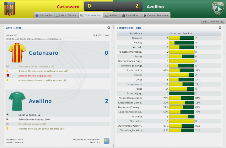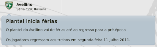 GG. Postado 9 de Janeiro 2011 Denunciar Postado 9 de Janeiro 2011 O Avellino chegou apesar da irregularidade que você disse, mas pelo jeito é algo que também acontece com os outros clubes. Morfeo voltou e arrebentou com a partida. Agora terá a chance de subir. Se conseguir, Cannigia terá a chance de colocar as cartas na mesa e a diretoria aceitará o que ele pede. Será? Veremos nos próximos capítulos.