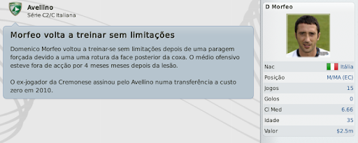 mfeitosa Postado 8 de Janeiro 2011 Denunciar Postado 8 de Janeiro 2011 Isso aí, agora faz de difícil para estes bobocas da diretoria, mas aqui já tem algo em vista se não ficar aí? Sorte no play-off! OBS:Gráficos demais! Muito obrigado, Jiri! É, agora cada vez que aperto em CONTINUAR, aparece uma nova proposta da diretoria. :heh: Alguns clubes estão sem técnico, mas nenhuma proposta foi feita. Ainda não sei o que fazer. Talvez se o acesso vier com o Avellino, eu me empolgue e renove, mas agora não tenho vontade. Conseguiu a recuperação, está nos playoffs, mas a equipe está muito inconstante. Morfeo será um ótimo reforço para os playoffs, fará diferença! OBS: Já tem proposta pro Caniggia sair do Avellino? Sem dúvidas. O Morfeo pode ser a chave para o acesso do Avellino. Agora vou ter que quebrar a cabeça para montar este meio-campo com Morfeo, La Paglia, Baù, Cafasso e os uruguaios Trovo e Rotundo. Ainda não recebemos nenhuma proposta. :no: Talvez pelo fato do Caniggia ainda estar vinculado ao Avellino, mas existem equipes sem técnico que poderiam se interessar!