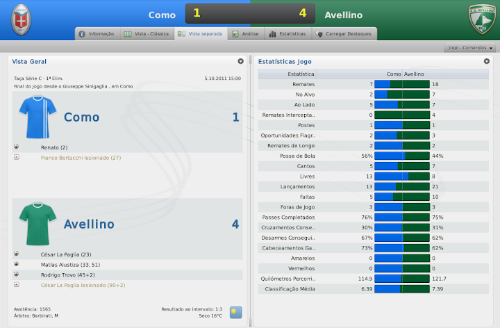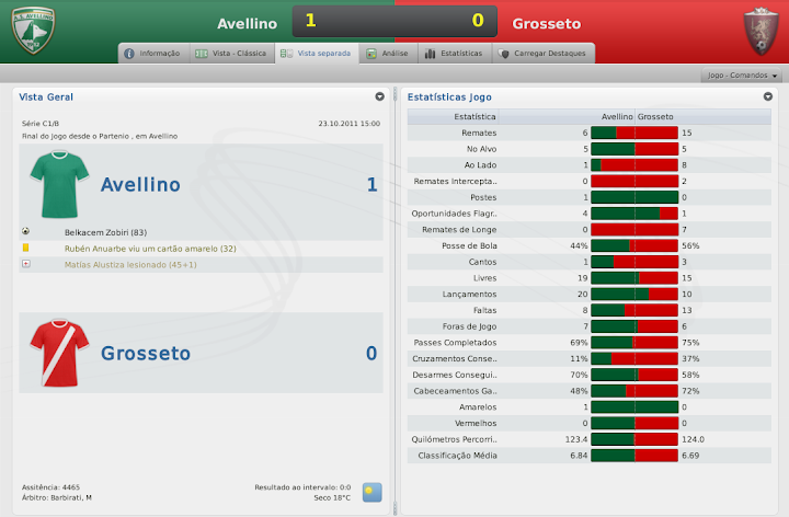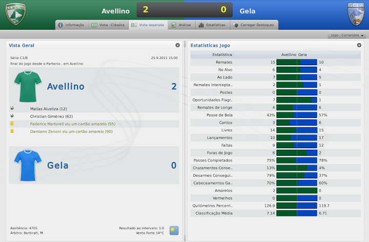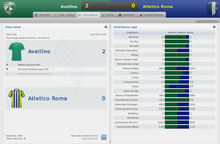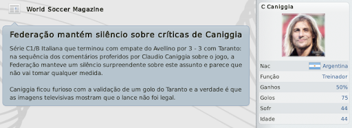 mfeitosa Postado 12 de Janeiro 2011 Denunciar Postado 12 de Janeiro 2011 bom começo.. mas tdo embolado ainda.. mantenha o foco É, não pra definir nada realmente. Mas vamos seguindo! :yes: Vi as estatísticas do jogo contra o Fondi e foi um atropelamento. :lol: começo excelente de temporada, mas é o início como gosto de dizer. Contrariando o Caniggia, prefiro a prudência, apesar de confiar nos Lobos. Caniggia sempre foi um safado, tento deixar o clima com a cara dele. :heh: Até a forma como as questões da imprensa são respondidas, eu coloco um veneno a mais, que em outros casos não faria. O Fondi sofreu um bocado naquele jogo. O que tem me impressionado é o Alustiza. Você tem que ver ele jogando. Chega na cara do gol com uma facilidade rara de se ver, passando por quanto precisar. Ninguém consegue desarmá-lo. Mas... chega cara-a-cara com o goleiro e manda a bola pra lua. Se ele tivesse acertado pelo menos metade das chances que teve contra o Fondi, ia ser algo humilhante para eles. Estou tentando forçar alguns treinamentos para ele melhorar isto. Talvez a médio prazo, possamos sentir alguma diferença. Belo começo, a diferença é pouca nas divisões inferiores da Italia e isso inclui a Série B. E é uma pena que a equipe tenha sido eliminada da Copa Itália, é sempre uma boa fonte de renda. Pois é, a questão da renda da Copa da Itália teria sido muito bom para o Avellino. Infelizmente, não deu. E por vacilo, porque dominamos o Grosseto. Quero tentar pelo menos o título da Taça Série C. Gimenez vai ser o rei da C1 se continuar assim. Apesar da derrota pro Grosseto o massacre contra o Fondi foi fenomenal. Boas contratações. Tim Hofstede pra C1 é zagueirão heim.. excelente contratação Lembrou de mim no post :rolleyes: "Acho que o Davids seria uma boa opção para o meio campo na C1" Boa sorte.. Cara, o Giménez está um monstro. É entregar a bola pra ele e correr pro abraço. Está infalível até então. Eu não esperava tanto. Quanto às contratações. Trouxe os dois pensando mais no futuro do clube, talvez eu nem colha os frutos que eles poderão dar ao clube, mas faz parte. Sempre faço isto. Temporada passada eu trouxe um lateral-esquerdo que está muito bem no Sub-20. Daqui a pouco ele sobe pro profissional. Mas, de todos, o Hofstede é o melhor. Já é um jogador pronto e ainda pode melhorar! É, coloquei a sua citação! :lol: Mas o Davids não está mais nos planos. A janela acabou de encerrar e trazê-lo no meio da temporada não faria sentido. Se brincar, ele já vai ter se aposentado. lendo seu save agora, essa forma de postar está bem interessante, sua temporada temporada passada foi muito boa, gimenez deu show e está dando mais uma vez na C1, continua assim que teu save está muito bom de acompanhar :P Muito obrigado, Zimmer! O Giménez está quase virando um Martín Palermo para o Avellino. Está com 36, fazendo gols a rodo e muitos times da Serie B estão interessados nele. Acredito que ele jogue ainda umas 2 temporadas em bom nível. :thumbsup: