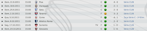 mfeitosa Postado 13 de Janeiro 2011 Denunciar Postado 13 de Janeiro 2011 Resultados da Série C1/B: v Pisa, v Viareggio, v Gela, v Taranto, v Atletico Roma, v Sorrento e v Grosseto Classificação da Série C1/B Veja o do jogo contra o Taranto. Resultado da Taça Série C: v Como
