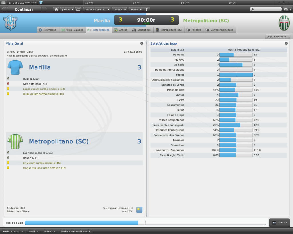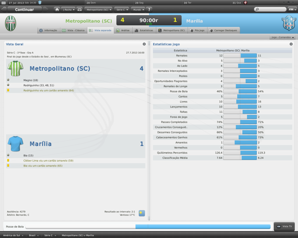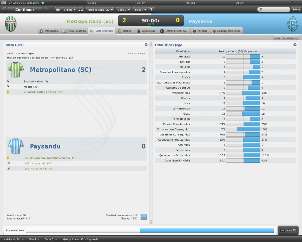 Jirimias Postado 11 de Fevereiro 2011 Autor Denunciar Postado 11 de Fevereiro 2011 Ate que enfim suspance na historia ansioso por saber Jiri! hehe não pensava em colocar um suspense nesta história não, mas se faz necessário para ajustar uma coisinha no save. O lance é simples cara ! tem que ganhar a série C ou uma promoção para segundona e sair fora, já deu o que tinha q dar no metrô! Tá entre os favoritos do clube já?! Rapaz, se fosse por mim, já tinha vazado, mas tá muito difícil sair do clube, já tentei vários clubes da Série B e fora do brasil, mas nada.Eu estou achando estranho, nem time da série D me cogita hsuahsuhauhsua.Estou com medo de ser condenado a ficar o resto da vida no metrô. Nunca comecei um save com reputação amadora no Brasil, nem quero imaginar que esta escolha cause um tipo de problema deste. Já estou entre os favoritos, aliás o único do clube. Citar