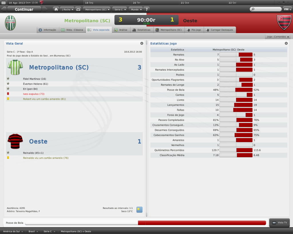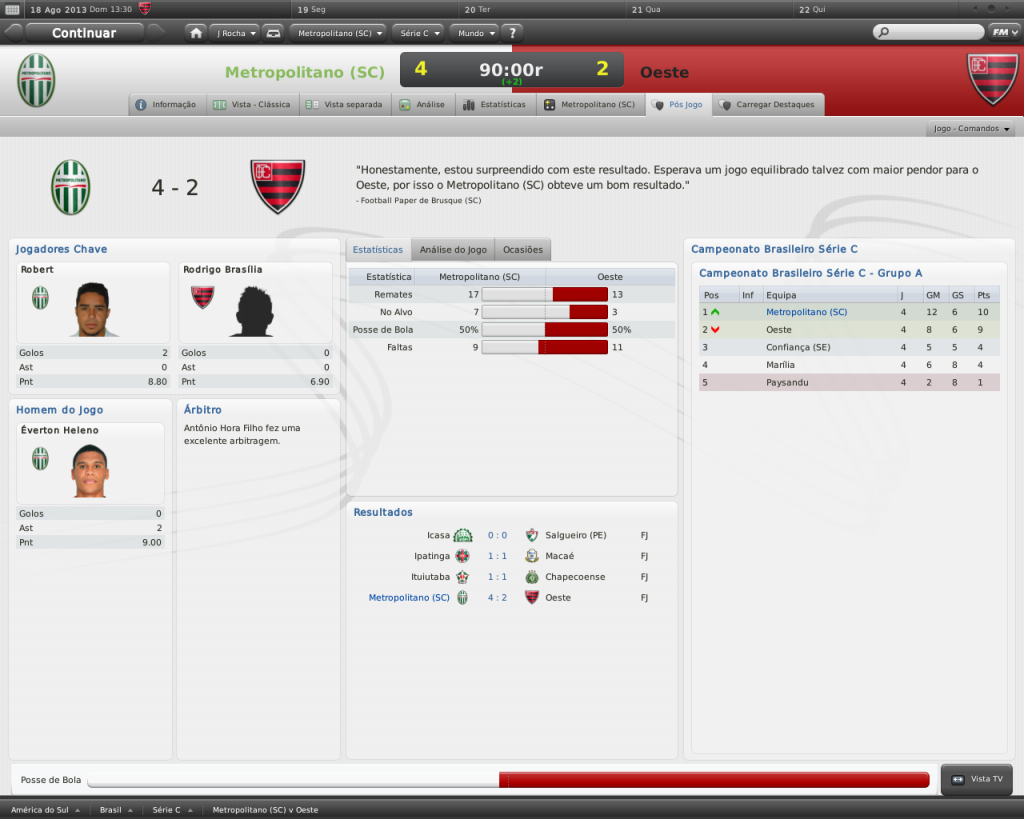 Jirimias Postado 11 de Fevereiro 2011 Autor Denunciar Postado 11 de Fevereiro 2011 METROPOLITANO VENCE E LIDERA GRUPO A Com direito a dois gols de Robert, o Metropolitano venceu o Oeste no Estádio do Sesi por 4-2.Esta é a terceira vitória na Série C e lidera o Grupo A.Apesar do placar amplo, a partida não foi fácil.O Metropolitano abriu vantagem de dois gols, mas cedeu o empate ainda no primeiro tempo.Na segunda etapa, o Metropolitano entrou determinado e desempatou.Fidel Martinez ampliou o placar aos 29 minutos,fechando o placar. ùltimos jogos do metropolitano 2-2 vs. Paysandu 4-1 vs. Marília 2-2 vs. Confiança (SE) Citar