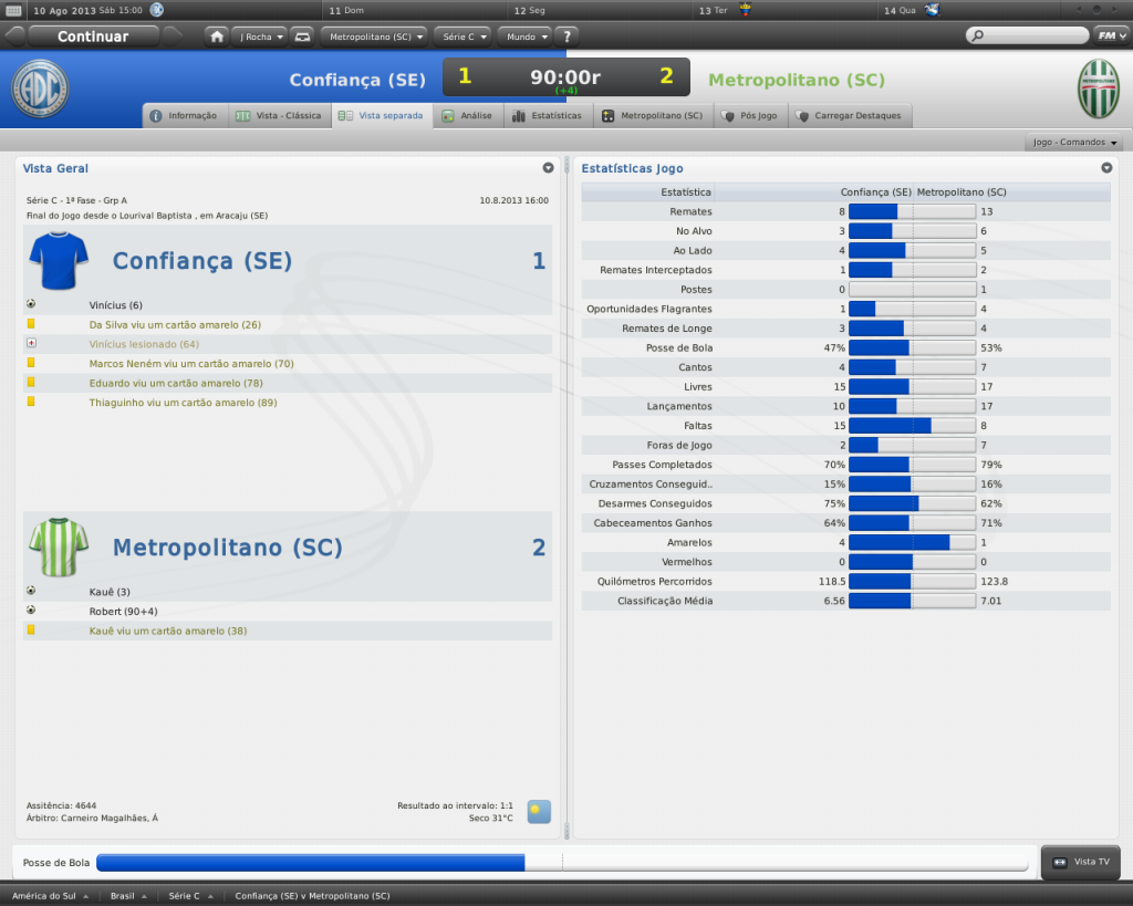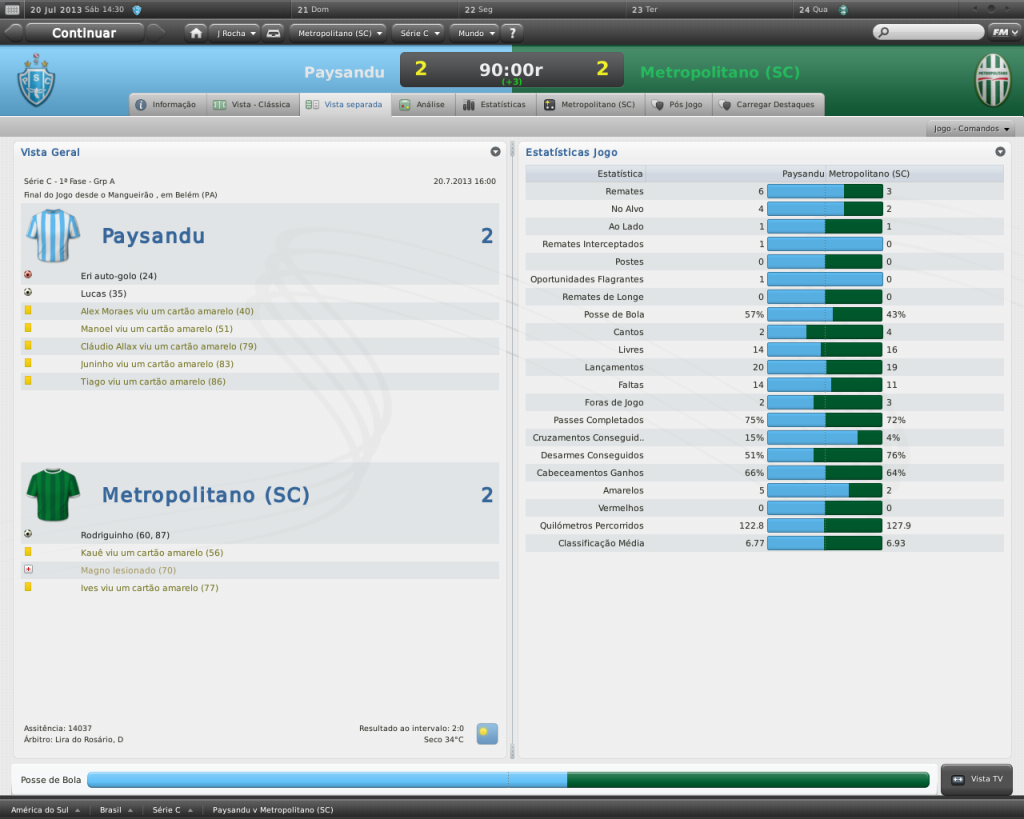 Jirimias Postado 12 de Fevereiro 2011 Autor Denunciar Postado 12 de Fevereiro 2011 Pelo menos o save não ficou totalmente corrompido. O bom é que dá pra ganhar os jogos que não ganhou! :heh: Menos mal,né. O pior que o time tava muito bem, só faltava um jogo, e o Metro já estava classificado como primeiro.Agora tenho que fazer tudo de novo. Olha os jogos que eu já tinha feito: 2-0 vs.paysandu 3-1 vs Oeste 3-3 vs. Marília NA CASA DE DAN. DAN: - Jean, por quê você está me olhando assim? JEAN: - Cara, você é o tal A.Capaz?Por quê você fez isso? DAN: - Calma,Jean, eu fiz tudo isso para o bem da sua carreira. JEAN: - Bem?Você com este bloguezinho safado seu me atrapalhou nas contratações no ano passado, sem contar o monte de mentiras que você andou espalhando.Espere...aquela ligação do Avaí me convidando para trabalhar lá... DAN: -Sim, era eu mesmo.Eu tinha que colocar a notícia, mas de forma que você não pudesse desmentir.Cara, me escute: se não fosse isso, você estaria desempregado hoje.Eu sei, eu menti, mas você tem que entender que a imprensa define os vencedores e os perdedores. JEAN: - Me poupe,Dan!Entao quer dizer eu não tenho mérito por tudo que consegui até agora?Acho melhor pararmos esta conversa por aqui, estou decepcionado com suas sujeiras.Tudo o que você fez para me colocar no futebol foi uma armação.Minha vontade é terminar esta nossa parceria por aqui. DAN: - Ótimo!Se quiser rescindir nosso contrato, vá em frente, só se lembre da multa contratual: 500 mil reais JEAN: - Você é um sujo!Quer saber?Eu vou juntar o dinheiro da rescisão para ficar livre de você. DAN: - Duvido que consiga ganhando esta mixaria que você ganha e tendo que me pagar 20%. Ignorei e sai batendo a porta e a partir daquele momento decidi gastar parte do meu salário para rescindir o contrato com Dan.Fui até uma agência bancária e consultei minha reserva depois de quase três anos de carreira: Saldo bancário: R$38 mil Dívida: R$500 mil Valor pendente: R$462 mil Estava de cabeça quente, ainda não tinha pensando quanto ainda dependeria dos serviços do Dan. Citar