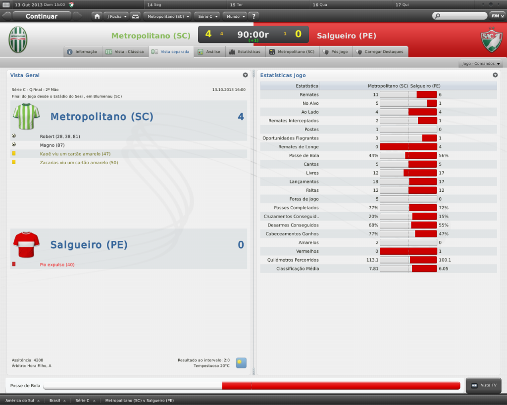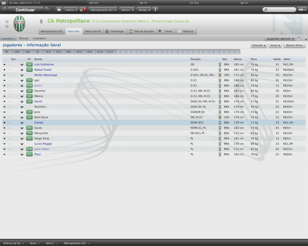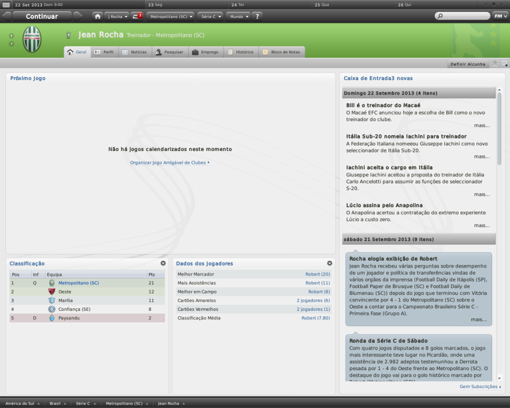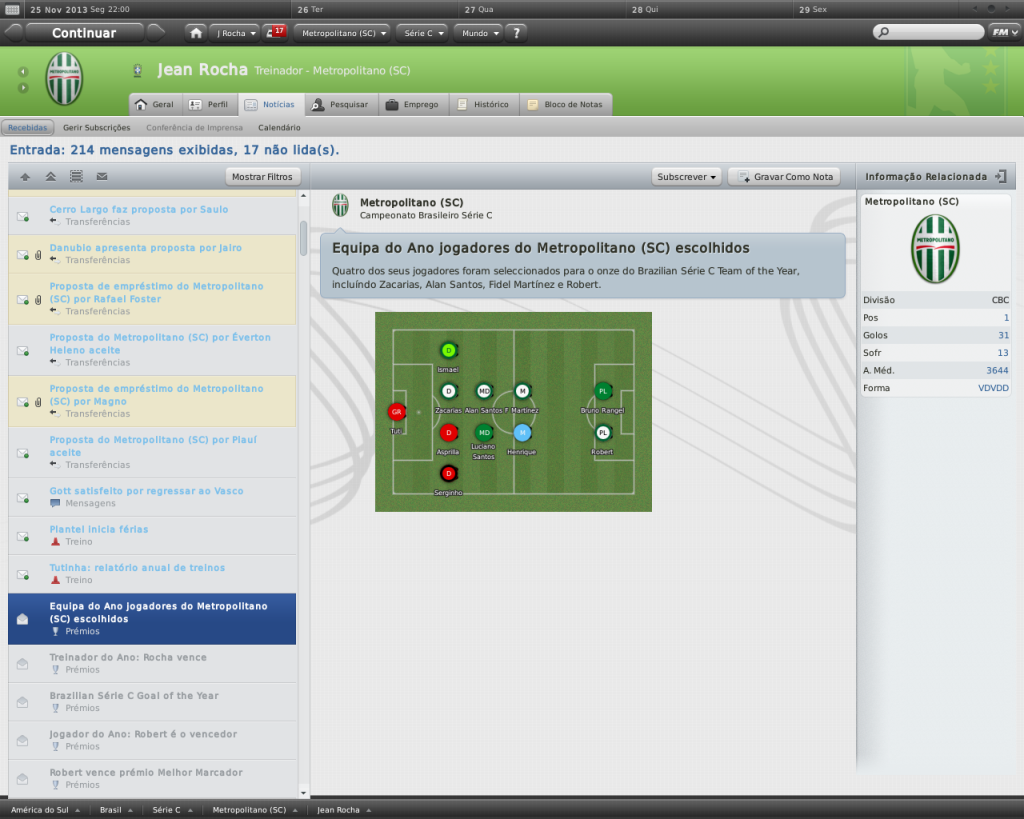 Jirimias Postado 12 de Fevereiro 2011 Autor Denunciar Postado 12 de Fevereiro 2011 No final das contas a Temporada 2013 só me deu motivos para comemorar:conquistamos nosso espaço no Campeonato Estadual com a melhor campanha em pontos da competição e a promoção na primeira temporada para a Segunda Divisão Nacional.Nestas duas conquistas também foi possível constatar o pior do Metropolitano na temporada: a dificuldade de jogar jogos decisivos.O trabalho na nova temporada será direcionado a isso, principalmente com a contratação de jogadores experientes.O plantel agora passará por uma renovação: alguns jogadores não terão seus contratos renovados ou serão negociados.Alguns jogadores emprestados ao clube também não estarão na próxima temporada, como é o caso de Rafael Foster e Magno, que o vasco inssite em não liberar, depois de vê-lo jogando o fino da bola no Metrô.Enfim, a barca está pronta, só falta jogar no alto-mar. A Campanha na Série C Apesar de não conseguirmos chegar á final da Série C (vencida pelo América/RN), o Metropolitano foi lembrado nas premiações, inclusive com quatro jogadores na Seleção do Ano da Série C.Robert foi o grande nome da equipe na temporada ganhando os prêmios de Craque do Ano e Artilheiro do Campeonato.O treinador Jean Rocha também foi premiado com o prêmio de Melhor Treinador da Serie C. O treinador teve seu contrato renovado por 1 ano (recusei dois anos), e o salário agora será de R$19 mil mensais (7 mil reais a mais que o salário fechado antes do erro crahs dumps). Estatísticas Individuais Internacional: Vice-Campeão da Sul Americana após duas derrotas na final para a LDU. Eliminado pelo Grêmio na semi-final do Campeonato Gaúcho Eliminado pelo Atlético(MG) nas Quartas de Final da Copa do Brasil Quarto colocado no Campeonato Brasileiro Principais jogadores: Marcelo Cordeiro, Kleber,Andrezinho,Alecsandro,Guiñazu, Edinho e Fabian Orellana (ex-Udinese).Santos Campeão Brasileiro de 2013 Vice-Campeão da Sul Americana após duas derrotas na final para a LDU. Vice-Campeão do Paulista (derrotado pelo Palmeiras) Eliminado com duas derrotas pelo Cristal (AP) na Primeira Eliminatória na Copa do Brasil Principais jogadores: Neymar,Sandro (ex-Tottenham),Muriqui, Roque Santa Cruz,Cesinha (ex-Vasco),Jussiê (ex-Bordeaux), Edcarlos (ex-Cruzeiro e Benfica)Kaká está há cinco temporadas no Real Madrid, o jogador de 31 anos está em grande fase na atual temporada: em 7 jogos até o momento, fez 5 gols, 4 assistências e possui média 8.44.Foi campeão com a Seleção Brasileira na taça das Confederações disputada este ano, e campeão da Liga na temporada passadaRivaldo em 2011 jogou no Mogi Mirim, em 26 partidas fez 12 gols, 5 assistências e terminou com média de 7.79.Transferiu-se para o Portsmouth, onde não fez nenhum jogo.Aposentou-se e virou treinador.Atualmente está desempregado.Ganso deixou o Santos em 2012, e desde então é jogador do Liverpool.Em duas temporadas no L’Pool, Ganso jogou 44 jogos, 5 gols, 19 assistências e médias de 7.86 e 7,57.Ganso é tilular da Seleção Brasileira.Neymar segue no Santos e é titular no ataque da Seleção Brasileira.Em toda carreira o jogador fez 146 jogos, 76 gols, 35 assistências.Suas dois últimas médias por temporada são: 7,51 e 7,41 Citar