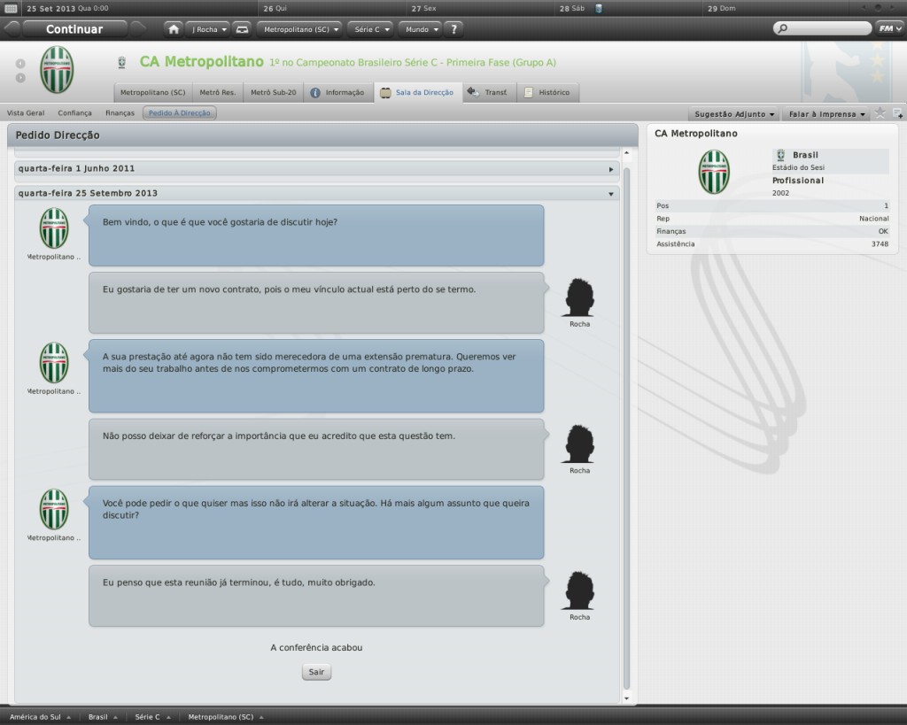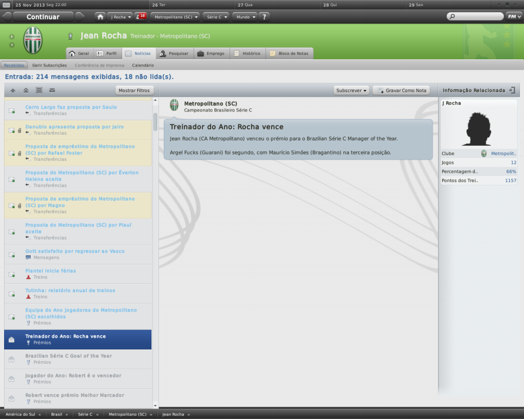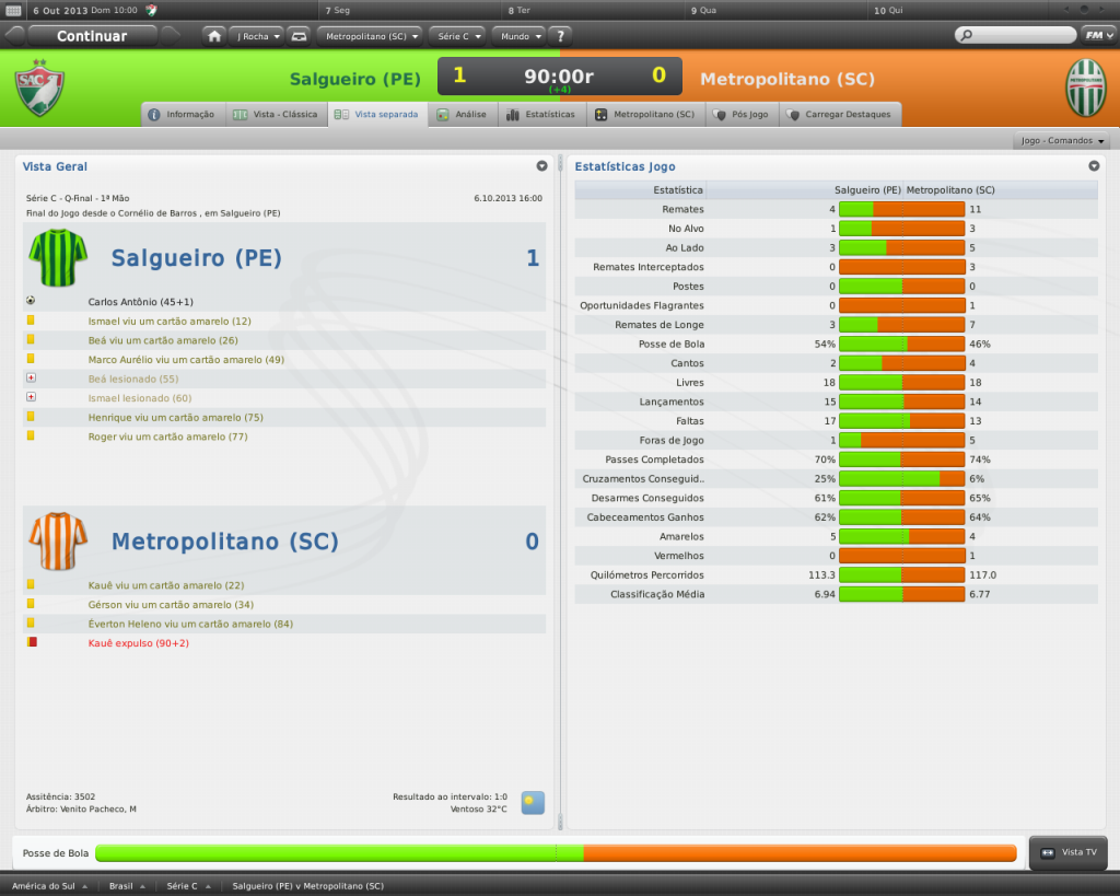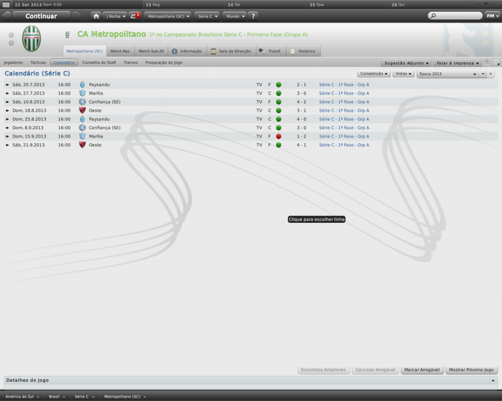 Jirimias Postado 12 de Fevereiro 2011 Autor Denunciar Postado 12 de Fevereiro 2011 No final das contas a Temporada 2013 só me deu motivos para comemorar:conquistamos nosso espaço no Campeonato Estadual com a melhor campanha em pontos da competição e a promoção na primeira temporada para a Segunda Divisão Nacional.Nestas duas conquistas também foi possível constatar o pior do Metropolitano na temporada: a dificuldade de jogar jogos decisivos.O trabalho na nova temporada será direcionado a isso, principalmente com a contratação de jogadores experientes.O plantel agora passará por uma renovação: alguns jogadores não terão seus contratos renovados ou serão negociados.Alguns jogadores emprestados ao clube também não estarão na próxima temporada, como é o caso de Rafael Foster e Magno, que o vasco inssite em não liberar, depois de vê-lo jogando o fino da bola no Metrô.Enfim, a barca está pronta, só falta jogar no alto-mar. A Campanha na Série C Apesar de não conseguirmos chegar á final da Série C (vencida pelo América/RN), o Metropolitano foi lembrado nas premiações, inclusive com quatro jogadores na Seleção do Ano da Série C.Robert foi o grande nome da equipe na temporada ganhando os prêmios de Craque do Ano e Artilheiro do Campeonato.O treinador Jean Rocha também foi premiado com o prêmio de Melhor Treinador da Serie C. O treinador teve seu contrato renovado por 1 ano (recusei dois anos), e o salário agora será de R$19 mil mensais (7 mil reais a mais que o salário fechado antes do erro crahs dumps). Estatísticas Individuais Internacional: Vice-Campeão da Sul Americana após duas derrotas na final para a LDU. Eliminado pelo Grêmio na semi-final do Campeonato Gaúcho Eliminado pelo Atlético(MG) nas Quartas de Final da Copa do Brasil Quarto colocado no Campeonato Brasileiro Principais jogadores: Marcelo Cordeiro, Kleber,Andrezinho,Alecsandro,Guiñazu, Edinho e Fabian Orellana (ex-Udinese).Santos Campeão Brasileiro de 2013 Vice-Campeão da Sul Americana após duas derrotas na final para a LDU. Vice-Campeão do Paulista (derrotado pelo Palmeiras) Eliminado com duas derrotas pelo Cristal (AP) na Primeira Eliminatória na Copa do Brasil Principais jogadores: Neymar,Sandro (ex-Tottenham),Muriqui, Roque Santa Cruz,Cesinha (ex-Vasco),Jussiê (ex-Bordeaux), Edcarlos (ex-Cruzeiro e Benfica)Kaká está há cinco temporadas no Real Madrid, o jogador de 31 anos está em grande fase na atual temporada: em 7 jogos até o momento, fez 5 gols, 4 assistências e possui média 8.44.Foi campeão com a Seleção Brasileira na taça das Confederações disputada este ano, e campeão da Liga na temporada passadaRivaldo em 2011 jogou no Mogi Mirim, em 26 partidas fez 12 gols, 5 assistências e terminou com média de 7.79.Transferiu-se para o Portsmouth, onde não fez nenhum jogo.Aposentou-se e virou treinador.Atualmente está desempregado.Ganso deixou o Santos em 2012, e desde então é jogador do Liverpool.Em duas temporadas no L’Pool, Ganso jogou 44 jogos, 5 gols, 19 assistências e médias de 7.86 e 7,57.Ganso é tilular da Seleção Brasileira.Neymar segue no Santos e é titular no ataque da Seleção Brasileira.Em toda carreira o jogador fez 146 jogos, 76 gols, 35 assistências.Suas dois últimas médias por temporada são: 7,51 e 7,41 Citar