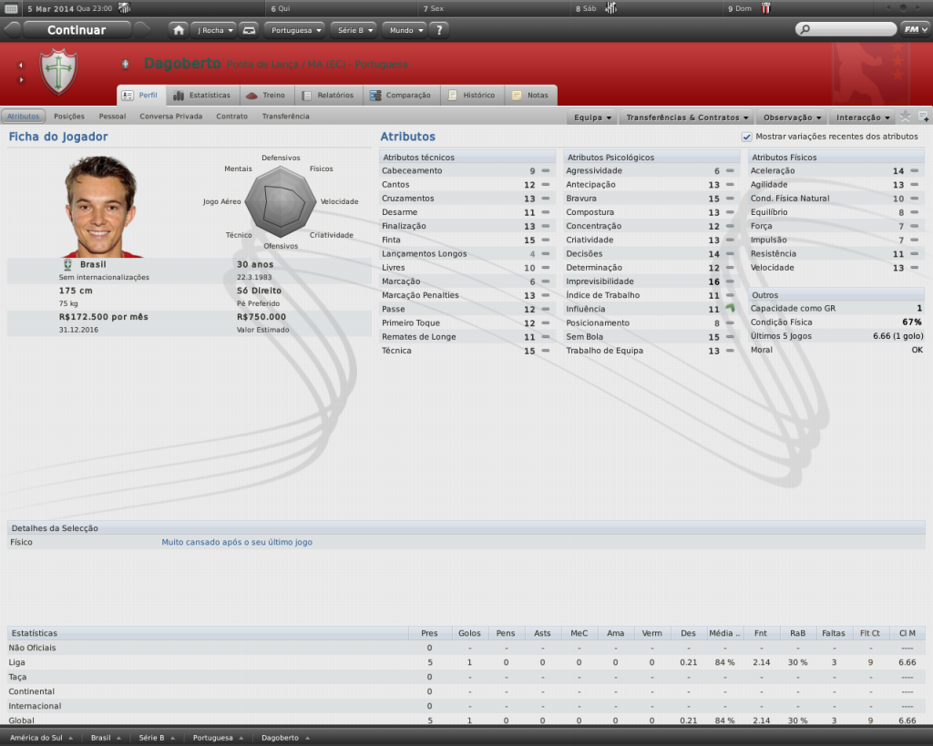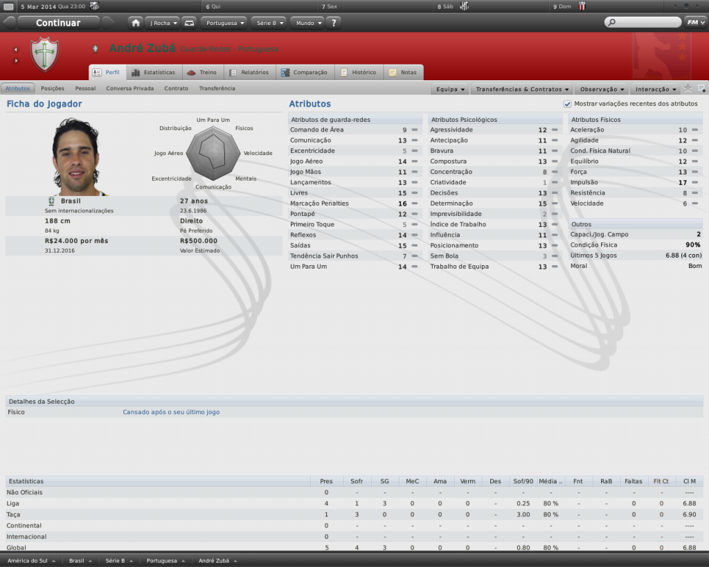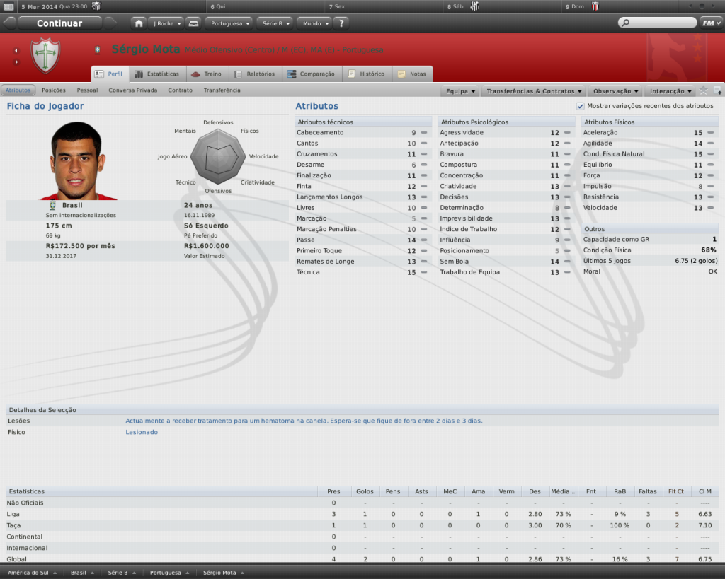 Jirimias Postado 14 de Fevereiro 2011 Autor Denunciar Postado 14 de Fevereiro 2011 Caramba! Quanta grana vai ter na Portuguesa, ainda mais na Série B, dá pra fazer um ótimo trabalho! Deixou o Metrô em condições muito melhores que quando assumiu, na Série B, ótimo trabalho! Quem sabe um dia não volte ao lugar que o tirou do video-game e de casa? (le-se mast...) (não deve entender esse enigma). :lol: Para a Série B é um dinheirão, mas por ser da Série B eu não consigo grandes reforços. Não quero nem entender o enigma hsuahsuah Foi um bom trabalho com o Metrô, nem penso em retorno, acho que gastei toda a minha paciência por lá, mas quem sabe,né? Ronaldo ta que nem na vida real!! E o meu fluzão tá ótimo, eba!! :thumbsup: Igualzinho rsrs. O Flu poderia tá bem melhor no Campeonato Brasileiro, mas fez uma boa libertadores e dominou o estadual por dois anos. Hasebe firme e forte nos lobos, mas o que houve com Kagawa e Abe, como decaíram tanto? Já o Honda... Sem comentários, sorriria de orelha a orelha se isso acontecesse na vida real. Melhor, só se o Bayern também tivesse Kaká O Kagawa teve cinco lesões em 2011 e uma em 2012, em suas quatro últimas temporadas nunca conseguiu chegar passar dos 7 de média..O Abe tá com 32 anos , também nunca passou de média 7.0. Citar