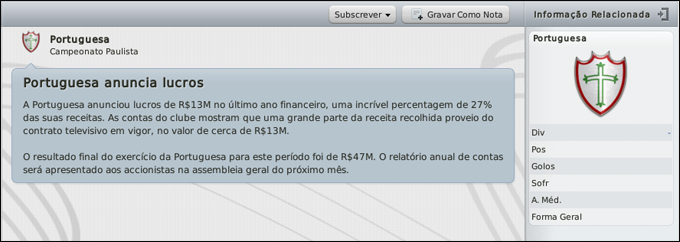 paso226 Postado 15 de Fevereiro 2011 Denunciar Postado 15 de Fevereiro 2011 Consegui ler tudo. Muito boa a história Jirimias. Também fiz uma carreira dessas, comecei com o Trem, no segundo ano fui para o Botafogo (SP), consegui promoção pra série C e em seguida pra série B, e consegui ficar em 4º na série B, com um segundo turno impecável. Daí na metade do campeonato paulista de 2016 fui chamado pro Santos. Tá muito bom. Boa sorte na Lusa, tenho certeza que vai figurar entre os postulantes ao acesso com o time que montar. Se quiser indicações, é complicado por conta do tempo avançado de jogo, mas posso ajudar. Citar