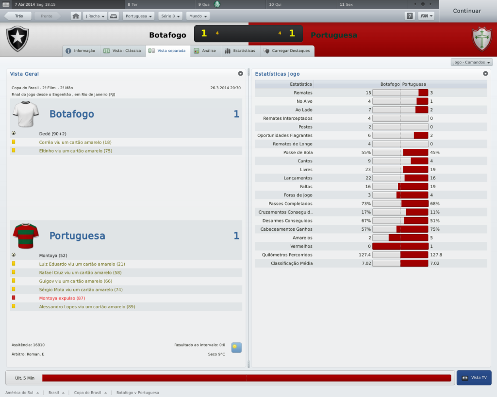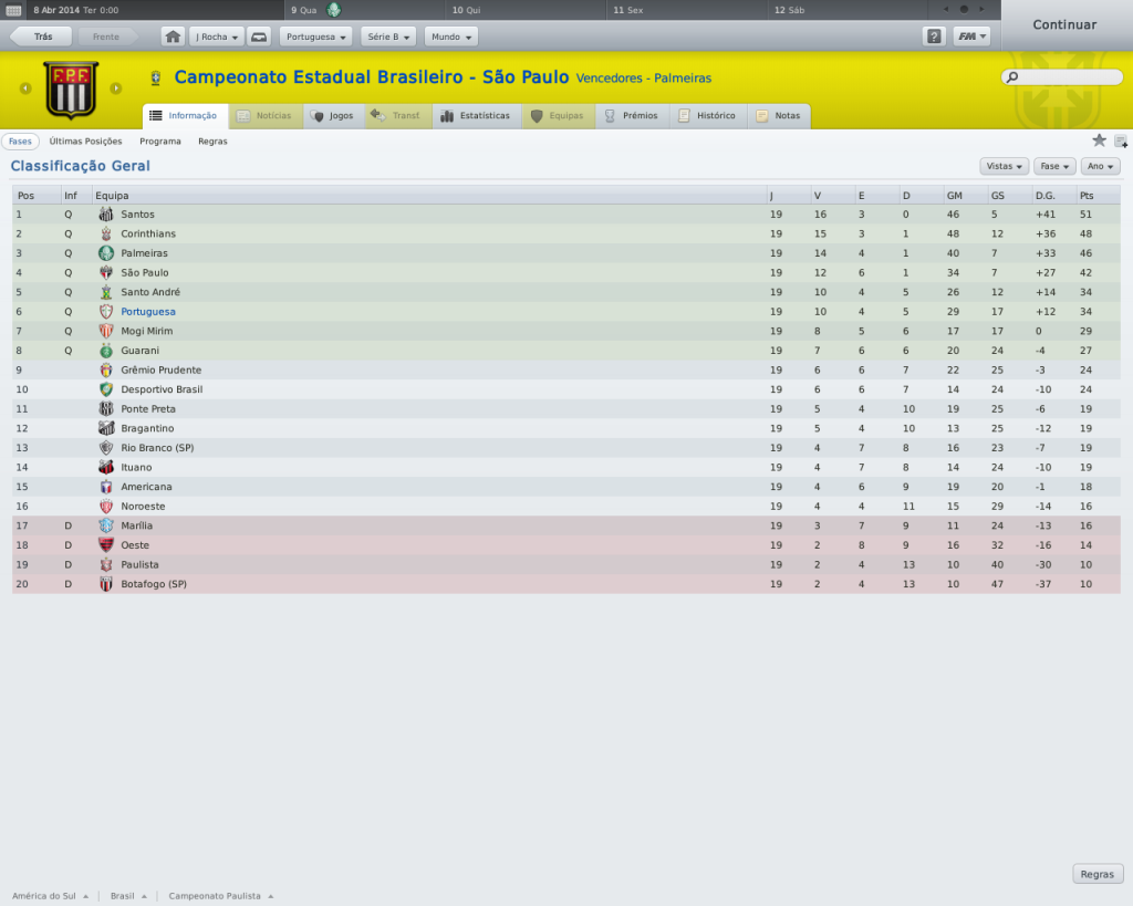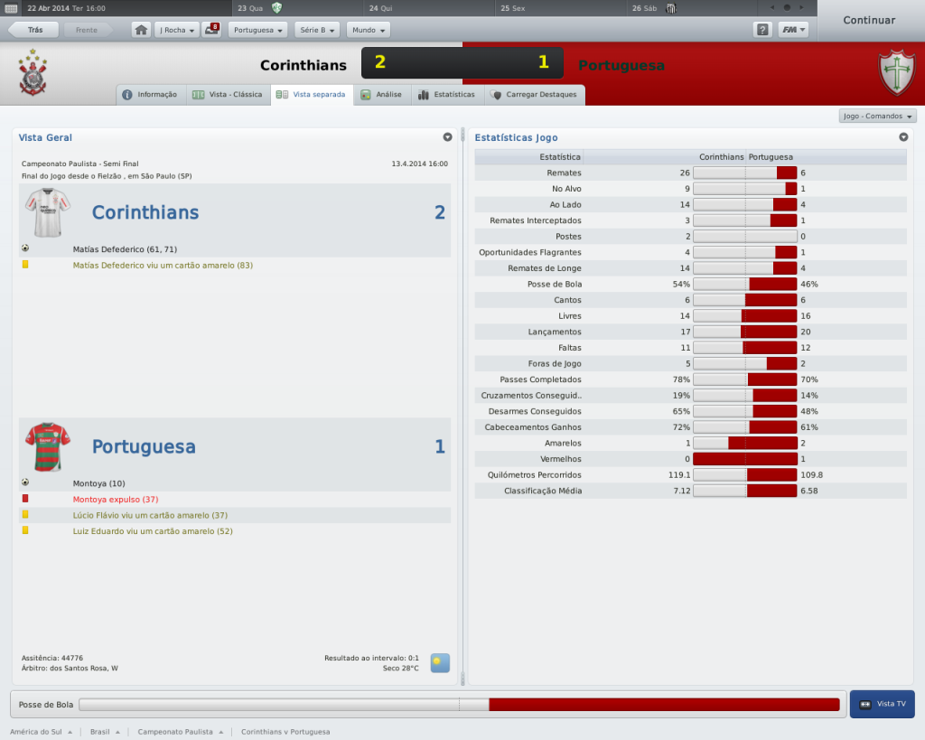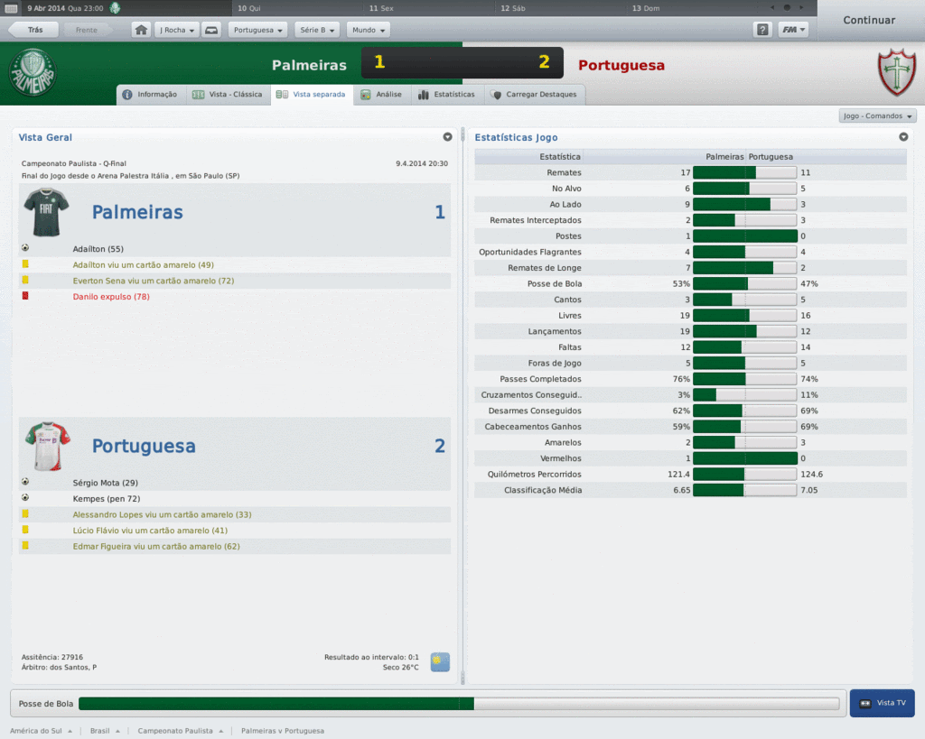 Jirimias Postado 20 de Fevereiro 2011 Autor Denunciar Postado 20 de Fevereiro 2011 Juiz ladrão, merdão maior cuzão!! A nova música da torcida da Lusa!! hsuhsuahsu o penalti foi mesmo, mas o impedimento o juiz acertou. As arbitragens me persegue desde o tempo de "Metrô" Dadas as condições, jogar contra o Corinthians, no Fielzão, com um a menos ainda antes do término do primeiro tempo, seria praticamente um ato heróico ganhar. O juiz ainda deu uma mãozinha pro Corinthians, mas agora é bola pra frente, boa exibição. Foi ótimo mesmo!Não tenho que reclamar, talvez eu reclame do Montoya pela expulsão.Agora é bola pra frente, a Série B é o nosso foco. A expulsão do Montoya foi ruim demais. Corinthians foi melhor, olhando pelas estatísticas. Ia ser muito injusto se eles não ganhassem pelas chances criadas. Até pela superioridade da equipe, eles tinham a obrigação de ser melhor, mas realmente mereciam vencer, mas fico feliz de ter dado bastante trabalho. Vamos deixar de choro e bola frente. Quem muito chora pouco ganha. :yes: Brincadeira, Jiri. A Lusa começou bem com o Jean e mostra que pode ir melhor no campeonato que virá. PS: Esqueci de um detalhe, a Lusa é sim o time do quase, mas você terá oportunidade de mudar isso. Verdade hehe A Lusa do Fm copiando fielmente a Lusa real.Fiquei contente de ter chegado longe no paulista, isso já valeu a pena. ggpofm e Khadaff querem causar polêmica no tópico, eu ACHO.... Li tudo, gostei do trabalho feito frente à equipe do Metropolitano, mostrando-se forte, mas a proposta da Lusa com certeza, balançou Jean... Sorte aí, e o COrinthians... Bem, deixaremos assim... Está sendo um trabalho cauteloso, sem grandes saltos, tá bem legal, fico chateado de ainda não ter conseguido um título.A Lusa chegou na semi-final, foi um feito pelas condições e até pelo trabalho que está ainda no começo.Que venha Série B! Impressionante o realismo do FM! Para Corinthians ser campeão tem que ter aquela mãozinha do juiz! Agora foco total na Série B! Boa Sorte! Série B é o que importa.Sempre foi assum desde o Metropolitano, sempre quase nos estaduais. Citar