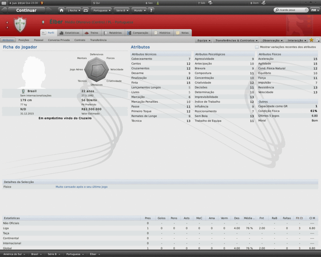 Jirimias Postado 22 de Fevereiro 2011 Autor Denunciar Postado 22 de Fevereiro 2011 Jean tendo seu trabalho reconhecido! Realmente deixou as coisas bem mais fáceis para o Ricardo. O newgen argentino é bom, deve ter muito potencial. Vale a pena pagar. Fiquei surpreso com a premiação, aí tive que inventar esta interação com o Ricardo hehe. Ele é bom newgen, a concorrência com o A.Madrid é o obstáculo para a negociação. Mantendo a Tradição na Lusa de ser o time do "QUASE" :bleh: Tá fazendo bonito, só esperava alguns torcedores mais exaltados. :thumbsdownsmileyanim: Esse Argentino ae, se chegar vai dominar tudo. Boa sorte ! KEEP UP THE GOOD WORK Temos que mudar esta sina de time do quase. Ah, mas a lusa chegou na semi-final, eles não tinham muitos motivos para serem mais agressivos, mesmo assim o tom de ameaça já surgiu.Eu tb estou seguindo a satisfação da torcida no jogo. :thumbsup: Acho difícil fechar com ele.Vlw,Mad! Newgen mitasso, se contratar vai ajudar muiito seu time... concordo com o Dan todo time(brasileiro) que se preze precisa de um grande Meio Campo Argentino!! boa sorte aai, pena que não conseguiu ganhar mass acho que esse elenco da lusa promete, abraços Valeu,etefili!O Atlético de Madrid atravessou nosso caminho, vamos ver o que acontece. Estou confiante que este grupo vai fazer bonito. Não é o novo Colman, é o novo Conca! :thumbsup: hahaha o Conca está um pouco acima :specool: O físico não é tão bom, mas mesmo assim é um bom jogador, melhor contrata-lo. Parabéns pelo prêmio. Valeu,igor! Ele tá novinho ainda, os outros atributos compensam. Citar