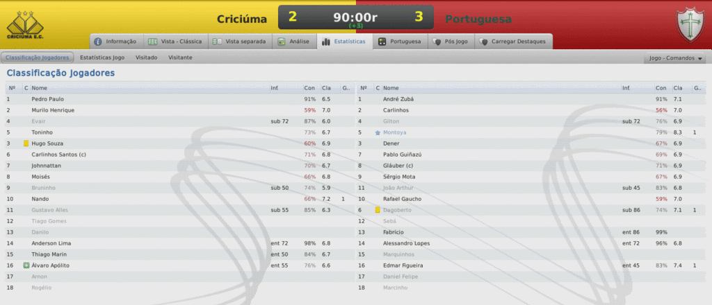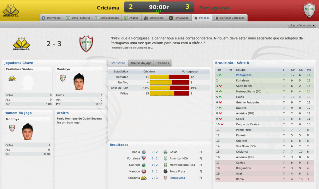 Jirimias Postado 24 de Fevereiro 2011 Autor Denunciar Postado 24 de Fevereiro 2011 A Copa do Mundo parou, a Lusa jogou! Diferente do que ocorre em toda época de Copa do Mundo, o futebol não parou, pelo menos no Brasil.A CBF ousou em colocar jogos do Campeonato Brasileiro junto com os jogos da Copa do Mundo, e é lógico que isso jamais poderia dar certo.Com o Mundial chegando em sua fase de mata-mata, o conflito de datas terminou, mas não evitou problemas, como a falta de estádios para as partidas. Alheio a isto tudo, a Lusa viajou para Santa Catarina para enfrentar o Criciúma.Em campo, os estreantes Rafael Gaúcho e Carlinhos tentavam convencer que a Lusa não jogou dinheiro fora ao contratá-los.O jogo também marcou o retorno do empréstimo do zagueiro Gilton e de Sergio Mota, que recuperou de lesão. A Portuguesa começou forte.Dagoberto, voltando a ser o "Dagol", abriu o placar ( foi o terceiro gol de "Dagol" nos últimos três jogos).Os donos da casa empataram aos 22 minutos, quando Gilton perdeu a bola para o atacante, que não vacilou.Gilton perdeu a bola e a titularidade. O segundo tempo começou com a Lusa voltando a ter frente no placar, desta vez com Edmar Figueira, que acabara de entrar.Minutos depois foi a vez de Montoya, o zagueiro matador, cabeear no segundo pau o escanteio bem batido por Rafael Gaúcho. O Criciúma ainda diminuiu quando Glauber desviou um chute de Nando e a bola enganou Zubá, mas o jogo terminou 3-2 para a Lusa que assumiu a liderança da Segundona. Os estreantes foram bem; Sérgio Mota é o maestro, faz muita falta, enquanto o Gilton já mostrou que não tem capacidade para vestir nossa camisa.A Lusa joga agora contra o Vila Nova(GO), jogo que deve marcar mais uma estréia: a de Loco Abreu, que veio para fazer os gols que Dagoberto perdeu. Últimos resultados da Lusa Citar