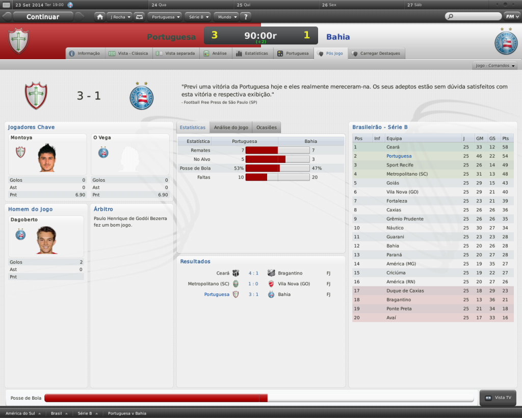 Jirimias Postado 26 de Fevereiro 2011 Autor Denunciar Postado 26 de Fevereiro 2011 Canindé,2014 Portuguesa 3-1 BahiaEm uma semana que receberíamos o Bahia no Canindé, o clube vivia a ansiedade de uma provável saída de Manuel da Lupa da presidência da Lusa.O clima eleitoral dos bastidores e até os boatos de uma possível venda do clube eram os assuntos mais falados nos corredores. Procurei afastar os jogadores destas especulações, tínhamos um confronto pesado pela frente.Apesar da má campanha na Série B, que colocava o Bahia na 12º colocação, eu não esperava jogo fácil .Para nós, uma vitória não nos colocaria na liderança, uma vez que os 4 pontos de vantagem do Ceará , no máximo nos deixaria a um ponto do líder , mas perder seria desastroso, assim como o empate também era, devido à proximidade dos outros dois clubes que nos seguiam. Sem Pedrinho, que agora é conhecido como Pepe por solicitação do seu agente, e sem o lateral Rafael Cruz, coloquei a campo Gláuber e Carlos Alberto como substitutos. A partida não poderia começar de melhor forma: aos 9 minutos, Montoya tirou a bola da área com força e lançou sem querer Dagoberto, que veloz, fintou para a direita o zagueiro Gui e de fora da área acertou o ângulo da meta do Bahia.Um golaço! Aos 29, Sérgio Mota tentou cruzar, a zaga rebate, a bola voltou para Mota que chutou, Sidivan rebateu, e Dagoberto, oportunista, fez mais um. Para o segundo tempo, fiz uma alteração:Guigov deu lugar a Rafael Gaúcho, que tem entrado no segundo tempo das partidas para recuperar a forma física.Mas mal começou a segunda etapa, e perdemos Sérgio Mota expulso após um carrinho por trás.Um lance besta quando a bola estava ainda na defesa do Bahia, que poderia nos custar caro.Com isso, passamos a jogar com 2 homens de ligação no ataque ao invés dos três, como é de costume. Felizmente, a inferioridade numérica não resultou em queda de rendimento e voltamos a marcar minutos depois com Gláuber fazendo um belo gol de fora área, um chutaço!! Automaticamente o time se acomodou e os visitantes começaram a ter mais posse de bola e até conseguiram assustar em algumas oportunidades.Já nos acréscimos, Filipinho correu pela esquerda entrou na área e fuzilou no canto direito de Zubá, era o gol de honra do Bahia.Mal terminou a comemoração de Filipinho, o árbitro do jogo deu fim a partida. O Ceará cumpriu a parte dele também, então a diferença entre os dois clubes continua sendo de 4 pontos.O que mudou foi que a Lusa se distanciou do 3º e do 4º, com 5 e 6 pontos respectivamente, além de ter aumentado a diferença para 11 pontos do 5º colocado, deixando a Série A cada vez mais perto da Lusa. Dagoberto foi o nome do jogo, o que tem sido uma constante.Nos últimos cinco jogos, o “Dagol” balançou as redes seis vezes, e é o artilheiro da Lusa na temporada com 20 gols ùltimos resultados da Lusa 2-0 vs. Bragantino (Fora) 1-1 vs. Náutico (Casa) 4-0 vs. Caxias (Fora) 2-1 vs. Paraná (Fora) Citar