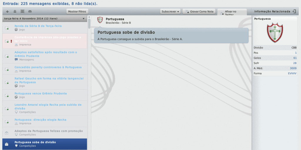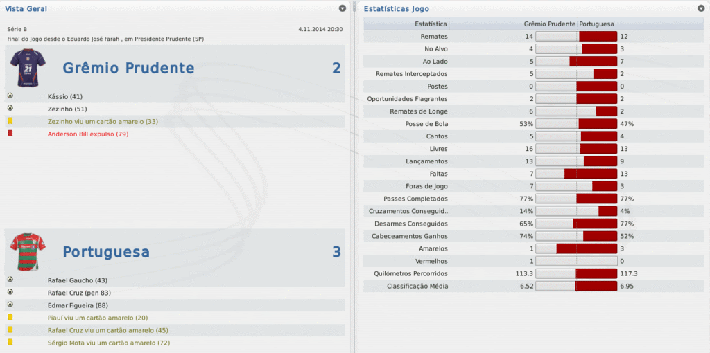 Jirimias Postado 26 de Fevereiro 2011 Autor Denunciar Postado 26 de Fevereiro 2011 Estádio do Sesi,2014 Metropolitano 0-1 PortuguesaDe volta ao local que me acolheu.Foram quase quatro anos trabalhando em Blumenau, de repente passa um filme na cabeça, mas o saudosismo ficou do lado de fora dos portões.Dentro do estádio, tive que suportar as provocações dos torcedores do Metropolitano, que me viam agora como um rival.Tudo muito natural, uma vez que a equipe deles precisava vencer para voltar a ocupar o G-4. O primeiro tempo foi bem disputado.O “Metrô” era sempre perigoso em sua bola parada com David levantando para a área, na mais perigosa oportunidade, Luiz Eduardo tirou em cima da linha bola que Kauê cabeceou.Já a Lusa se arriscava nos contra-ataques com Dagoberto, que arrumou uma correria para cima da zaga do Metropolitano.Foi Dagoberto que “cavou' o gol da Lusa no primeiro tempo, depois de dividir a bola com o zagueiro alviverde, a bola sobrou para Guigov que chutou bonito de fora. No segundo tempo, o equilíbrio continuou.Optei por uma nova formação tática, o mesmo 4-2-2-2 do Metropolitano.Com isso consegui segurar a natureza ofensiva da minha equipe, e também segurar o placar.No fim do jogo, o Metrô assustou com uma bola que percorreu toda a grande área mas não encontrou ninguém para chutar.http://i968.photobucket.com/albums/ae167/jirimias1/A%20Lusa%202014/18473_460x270_0872985001297549813.gif]Fim de jogo! Com a vitória, nos aproximamos do Ceará, que assim como nós, andaram tropeçando bastante nos últimos jogos.Agora são dois pontos para o líder, e a distância para o último clube do G-4 é de 11 pontos.Do outro lado, o Metropolitano segue fora do grupo das 4 equipes que irão subir.Torço para que eles se recuperem e consigam subir à Série A. Nas próximas semanas a Lusa passará por reformulações: um grupo empresarial liderado por um antigo jogador misterioso pretende comprar a Portuguesa.Com esta movimentação, temo um embargo da verba de transferências, por isso estou correndo contra o tempo para garantir que os R$9M restantes sejam utilizados ainda neste ano para a compra de jogadores para a nova temporada. últimos resultados da Lusa 1-1 vs. Criciúma (Casa) 2-1 vs. Vila Nova (GO) (Fora) 0-0 vs. Fortaleza (Casa) 2-2 vs. Guarani (Fora) 2-0 vs. Duque de Caxias (Casa) Citar