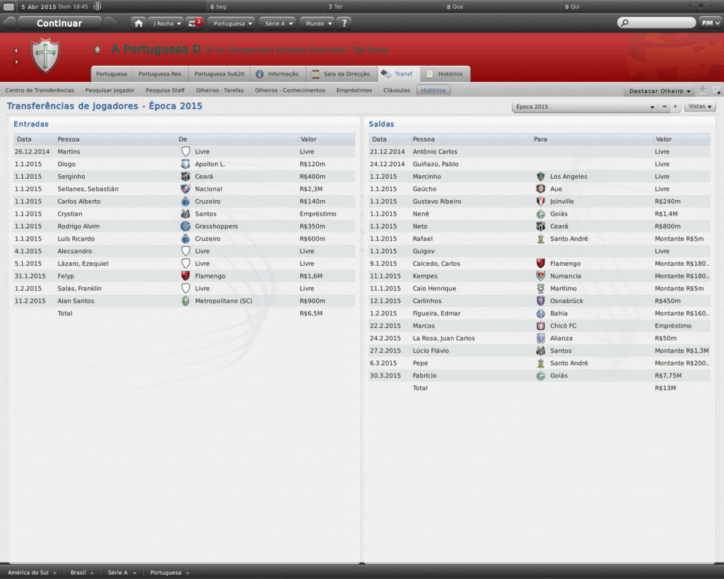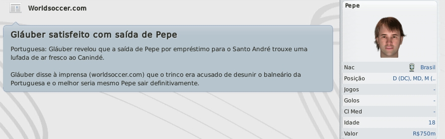 Jirimias Postado 4 de Março 2011 Autor Denunciar Postado 4 de Março 2011 Zé Roberto - ex-Lusa: preparador da equipe principal, esta é a função de Zé Roberto, que por enquanto está desempregado. Luxemburgo: Luxemburgo aposentou, como ele saiu da base de dados, não há como informar como foram seus últimos anos de carreira. Abel Braga: atualmente Abelão, de 62 anos, é treinador do Al-Jazeera desde 2008. Joel: aposentado Felipão: aposentado Nasri: avaliado em R$29M, Nasri está no Arsenal desde a temporada 2008/2009.Sua média atual, 6.96, é a 7º do elenco do Arsenal.Ele jogou em 18 jogos,fez 6 gols, 2 assistências e foi considerado duas vezes melhor em campo. Citar
