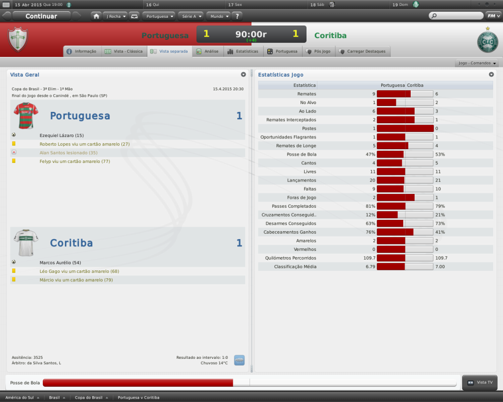 Jirimias Postado 3 de Março 2011 Autor Denunciar Postado 3 de Março 2011 Morumbi, 2015 São Paulo 0-1 PortuguesaRogério Pereira Costa.Eu tremia só de ouvir este nome.O árbitro carrasco da minha época de Metropolitano apitaria a partida contra o São Paulo.Em pleno Morumbi, eu não me surpreenderia de assistir uma arbitragem caseira.Antes do início da partida, eu o procurei para cumprimentá-lo, minha intenção era demonstrar que estava tudo zerado entre nós, ainda que seus erros tenham me custado um ou dois hipotéticos títulos estaduais.Desejei-lhe boa sorte, mas ao mesmo tempo desejava a mim mesmo. Sentei no banco de reservas, olhei ao redor e como desejei que aquela torcida ali estivesse ao meu favor, mas não era."Acorda,jean, você está em território inimigo!" - pensei comigo.A bola rolou, e não gostei nada do que eu via: o São Paulo dominava.Aproveitei um lateral a nosso favor para passar orientações para o Carlos Alberto.Falei: o "Dois". O "Dois" nada tinha a ver com o banheiro, mas sim era a nossa segunda formação treinada arduamente nesta última semana.O losango caiu como uma luva, e conseguimos anular a melhor jogada do Tricolor Paulista: os avanços de Marlos pelo meio.Com o chato do Marlos anulado, quem brilhava no jogo era nosso jogador Carlos Alberto. Carlos Alberto estava predestinado: ele recebeu do uruguaio Lázaro, entrou na área e fuzilou Thiago Régis (ex-Cruzeiro e Vitória), um belo gol.Aí veio a parte mais difícil da partida: segurar o placar, que conseguimos fazer bem no primeiro tempo. Veio o segundo tempo e a nossa preocupação era a mesma: segurar o placar.Ousamos alguns contra-ataque, mas Dagoberto sentiu a pressão de jogar contra o ex-time e perdeu boas chances de ampliar o placar, apesar de esta não ter sido a primeira vez contra o ex-clube. A partida tornou mais fácil para nós quando Zé Vitor derrubou Dagoberto na entrada da área.Apesar da jogada não ter terminado em gol, culminou na expulsão do defensor e ganhamos mais espaço para jogar.Com um a mais, dominamos o jogo, pena que faltou competência para ampliar o placar, sorte que não precisávamos de mais nenhum gol.A vitória estava conquistada, com ela a passagem para a semi-final.Proximo combate: Santos, na Vila Belmiro. Citar