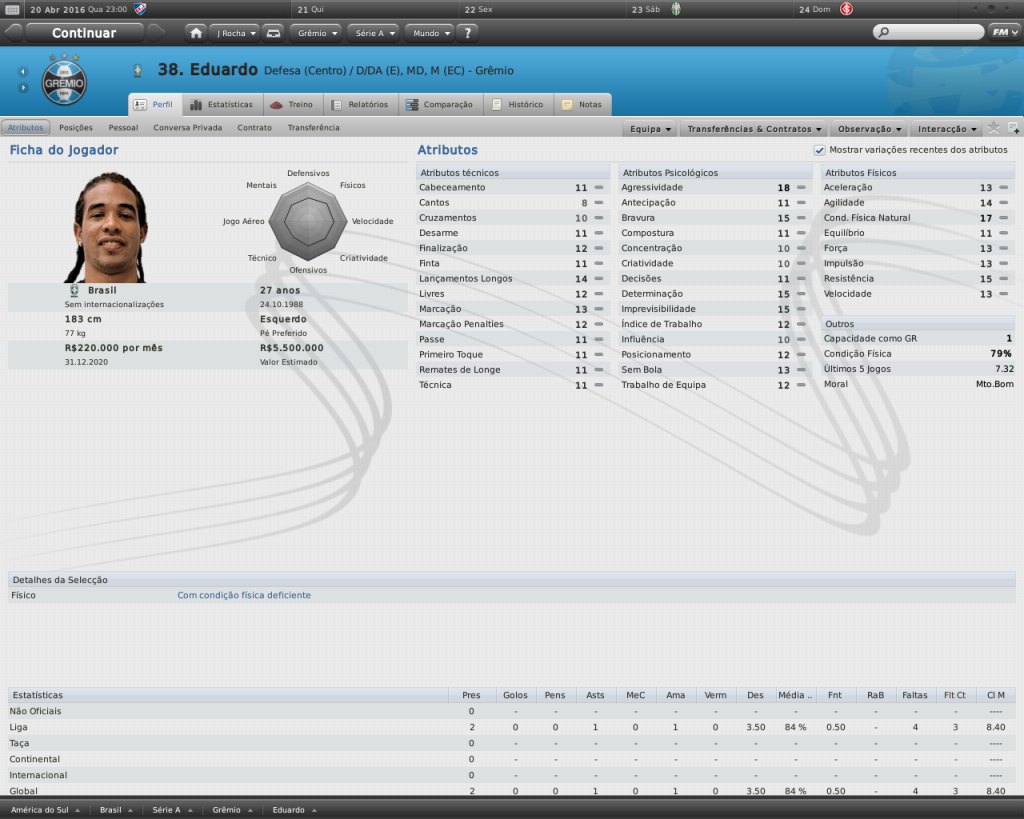 Jirimias Postado 16 de Março 2011 Autor Denunciar Postado 16 de Março 2011 Porto Alegre, 2016Segundo Turno:Felizmente o Internacional deu-nos o gosto da última dança.A partida final do 2º turno está marcada para o dia 24/04 na Arena Grêmio, e provavelmente será disputada pelo nosso luxuoso time reserva.Para os Colorados é a última chance de tentar renovar o título estadual, para nós, é a oportunidade de terminar o Gauchão mais cedo. Números do confronto Grêmio vs. Inter Durante a disputa do segundo turno, eu testei várias possibilidades, e o resultado foi uma luta acirrada pela artilharia do clube.Vários hat-tricks de donos diferentes, coisa que não me deixa muito deslumbrado diante do baixo nível da competição. Para não perder o costume, Inter e Grêmio foram os primeiros classificados em seus grupos, garantindo um Grenal no final, já que desta vez os Colorados não permitiram surpresas. A equipe levou a série o segundo turno, e foi premiado com um recorde: o Grêmio tirou do Inter o status de melhor ataque em um Campeonato Gaúcho, e olha que isso aconteceu ainda na Fase de Grupos, e portanto os outros dez gols nos dois jogos seguintes não foram contados. Passamos fácil sobre o Santa Cruz, que se preocupou apenas em bater... ... e depois um reencontro com o Brasil de Pelotas, mais uma vitória fácil... Antes de finalizar a postagem, apresento um dos bons jogadores do reservas de luxo do Grêmio, o lateral Eduardo, ex-Botafogo.Eduardo foi contratado junto ao Bari por R$5,5M. Desculpem-me pela postagem rápida, mas é pq para digitar tá difícil (ficar de cabeça baixa), ainda bem que jogar tá de boa. Citar