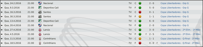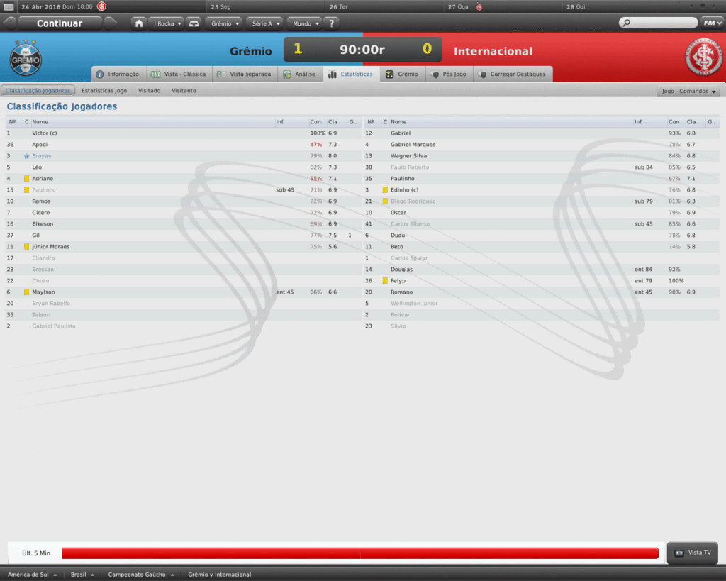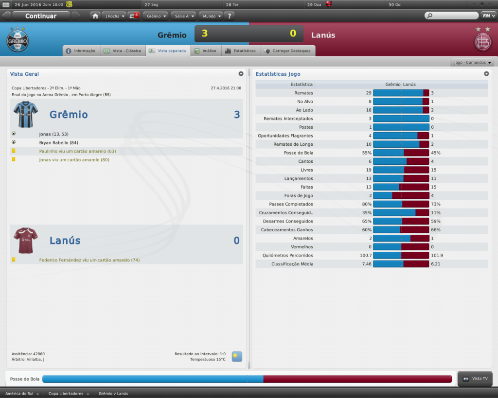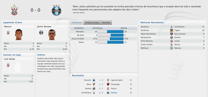 Jirimias Postado 16 de Março 2011 Autor Denunciar Postado 16 de Março 2011 Porto Alegre, 2016 Grêmio 0-1 Santos Libertadores da América Grupo GEste era o terceiro jogo da Libertadores que eu fazia em minha carreira, nenhum dos outros dois em deixaram tão nervoso quanto este com o Santos.Nem mesmo os enlouquecidos torcedores de Cali mexiam comigo como um novo encontro com o Santos, de Renato Gaúcho. Eu ainda não tinha conseguido vencer o Santos em toda a minha carreira, e a cada encontro eu percebia que era necessário quebrar o tabú, uma vez que o Santos seria adversário em duas das três competições que jogaremos. Neste jogo fizemos tudo certo: pressionamos, atacamos, mas a bola teimou em não entrar.No fim do jogo sofremos o castigo com um cruzamento para dentro da área, a bola desviou em Adriano e entrou no canto de Victor.Tentamos ainda reagir, mas voltamos a pecar na finalização. Com a derrota, o Santos assumiu a liderança isolada do grupo, enquanto o Grêmio ocupa a segunda colocação.Semana que vem em outro jogo contra o Santos, espero melhor sorte. Citar